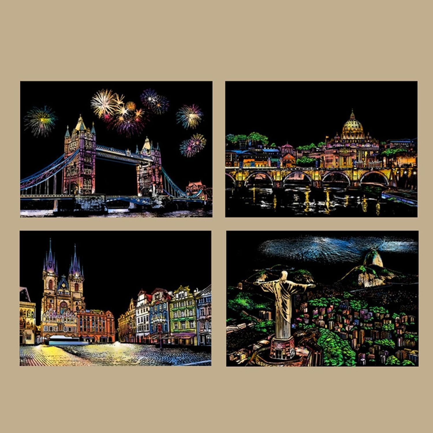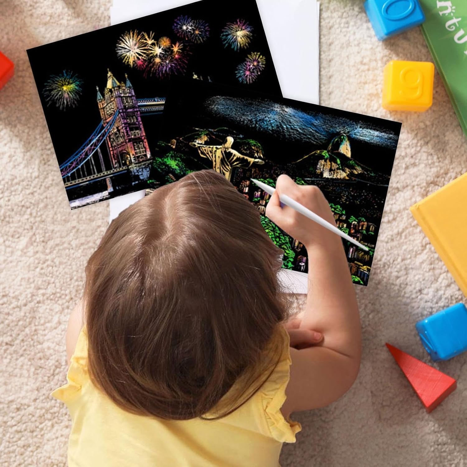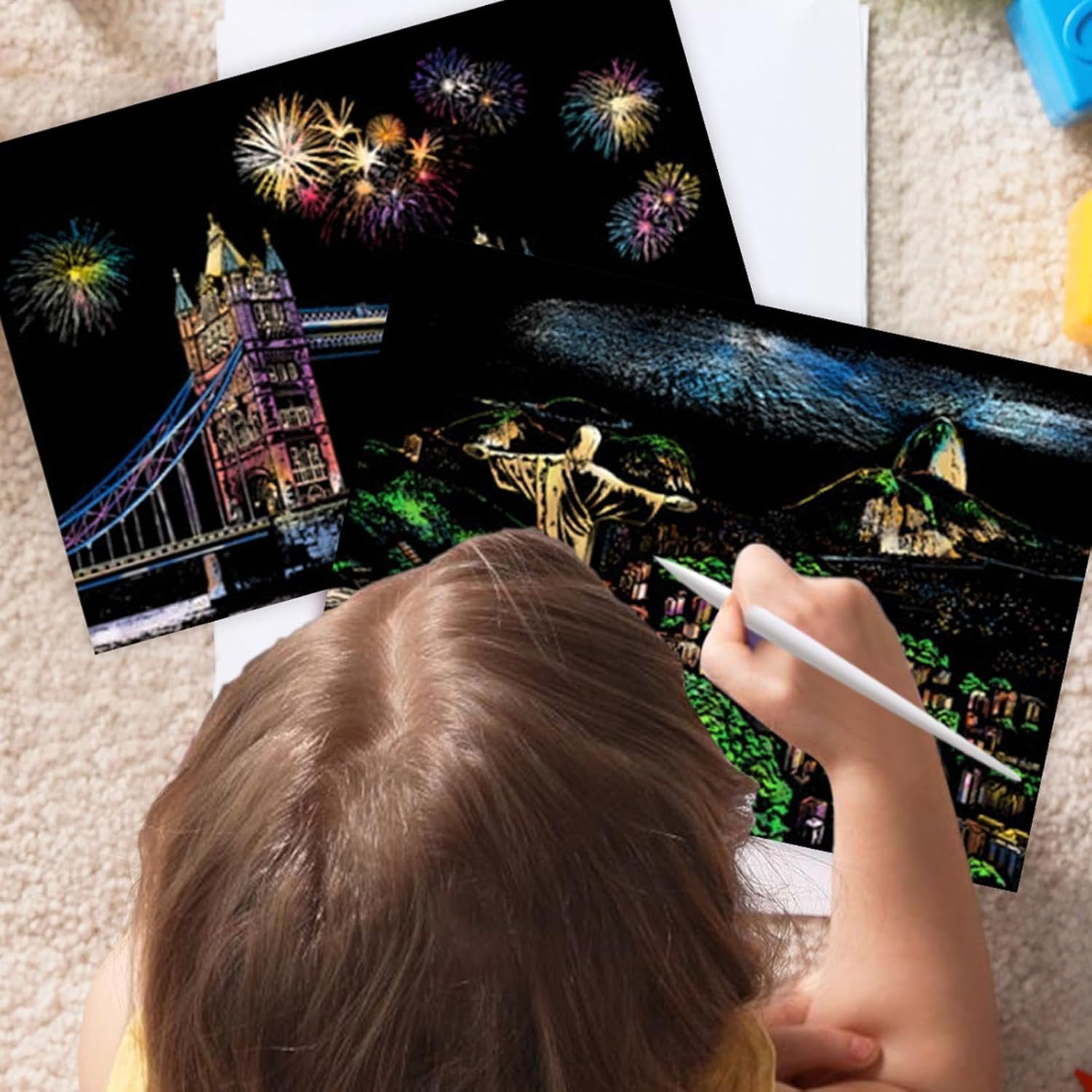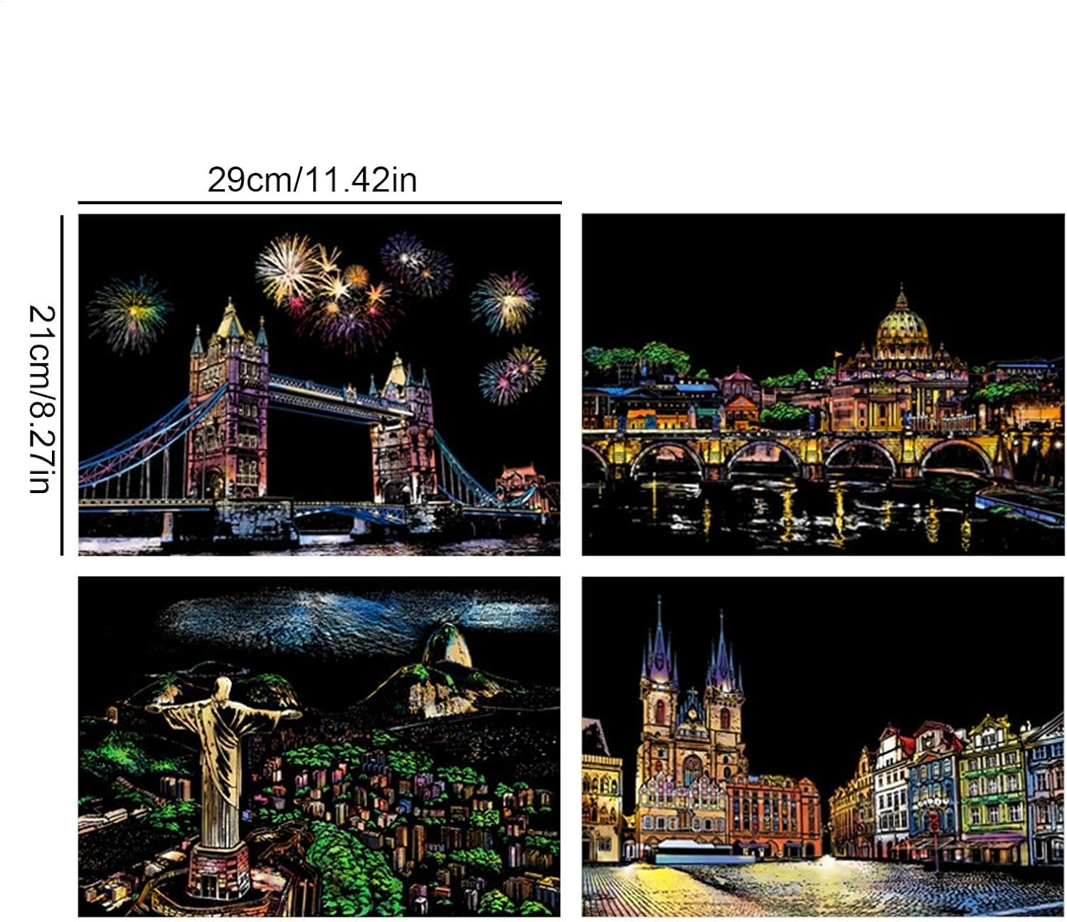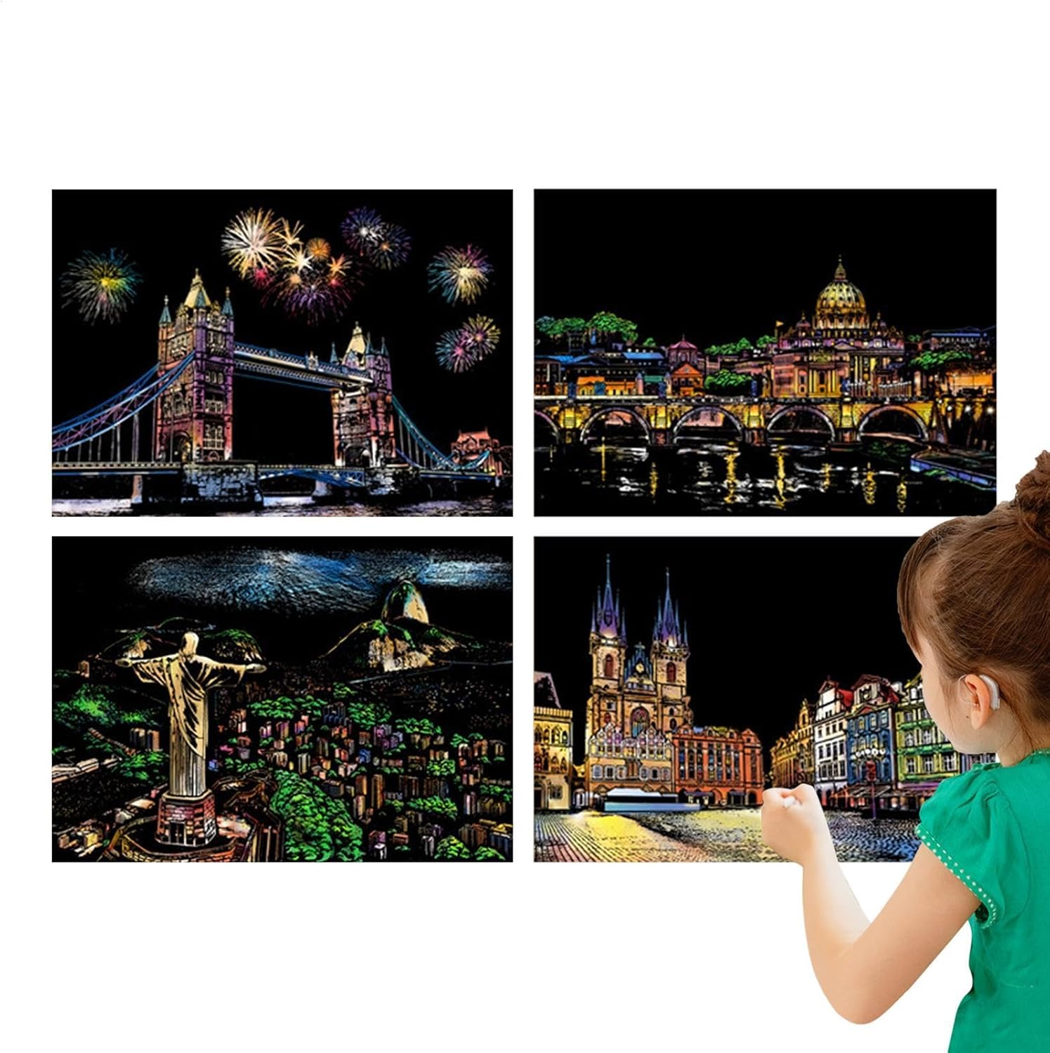 Design accattivante: con 4 fogli di carta da grattare in formato A4 per kit, che raffigurano splendide scene notturne della città, questo kit stimola la curiosità creativa, migliorando le capacità artistiche Facile da usare: con la sua finitura opaca che nasconde colori brillanti e motivi intricati, questo kit da grattare offre sbocco artistico entusiasmante. Usa la penna per rivelare il design invisibile e goditi la soddisfazione tattile di scolpire con le tue mani Porta gioia: progettato per bambini e adulti, questo kit di pittura da zero migliora le attività artigianali creative, garantendo a tutti di godersi il libero partecipando a attività didattiche e divertenti Comodo da trasportare: perfettamente dimensionato in formato A4, ideale per i viaggi o per un passaquotidiano, questo kit artistico da grattare consente sia ai bambini che agli adulti di esplorare il piacere di creare ovunque Accento domestico: trasforma il tuo spazio abitativo in una galleria d'arte con il nostro kit di pittura da zero. I capolavori finiti possono essere utilizzati come decorazioni domestiche, aggiungendo un sapore artistico