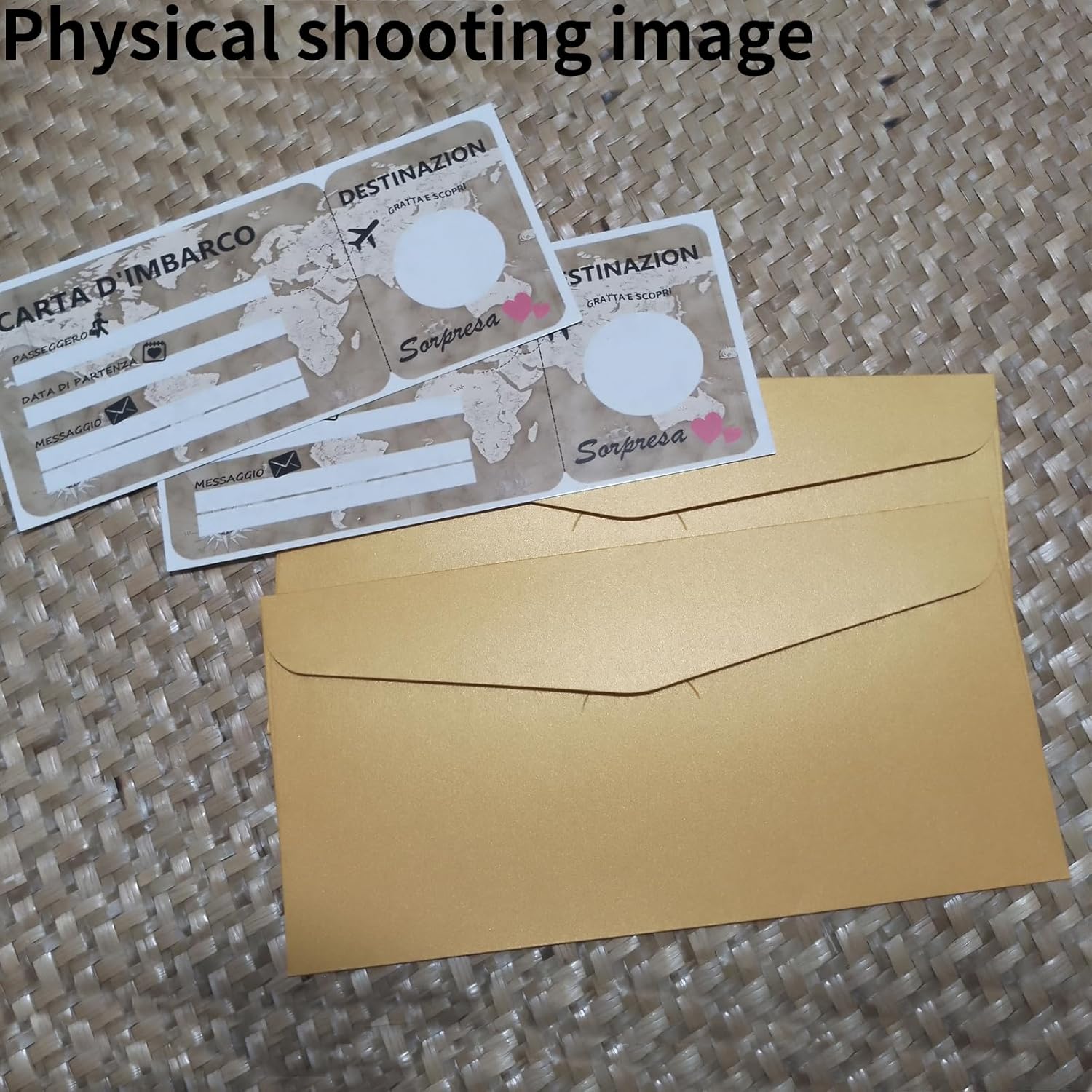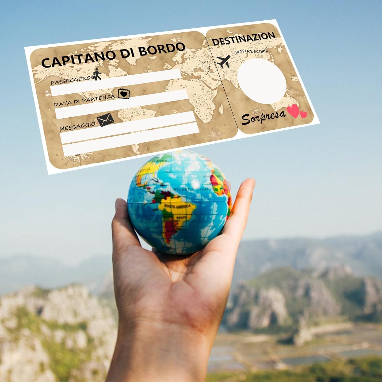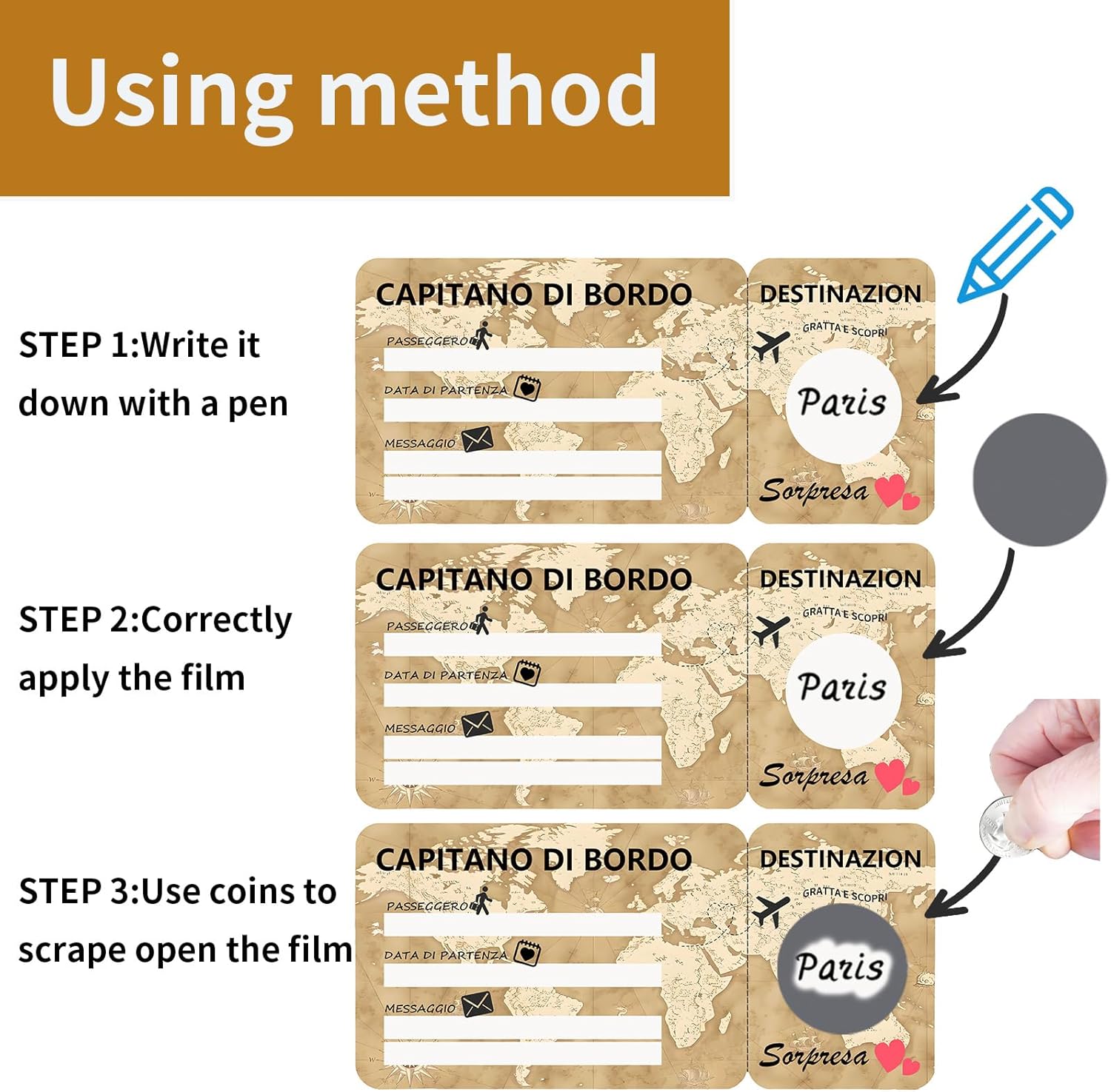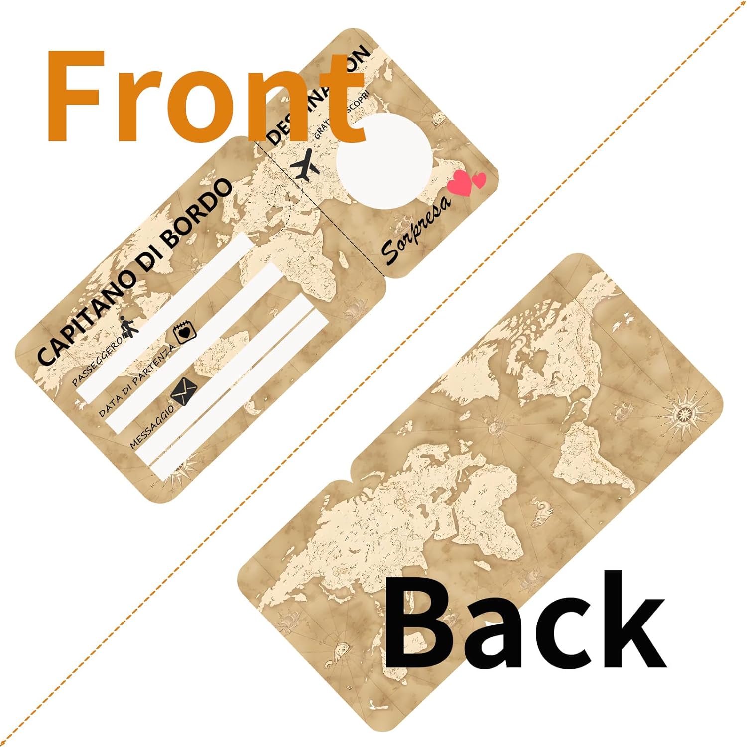 1.Carta Scratch Sorpresa Viaggio: Questa carta scratch off è un modo speciale e divertente per rivelare una destinazione di viaggio a sorpresa. Può essere anche conservata come souvenir o usata come decorazione. 2.Regalo Personalizzato: La carta di imbarco può essere personalizzata completamente da te. Basta compilare i dettagli della carta a mano e applicare lo sticker scratch al posto della destinazione. Il regalo perfetto per il tuo partner e i tuoi cari. 3. Design Vintage: Il biglietto aereo è progettato con un tema vintage, con toni della terra corrispondenti e simboli di viaggio. 4. Carta di Alta Qualità: Questo voucher regalo è stampato su carta di alta qualità. Include anche buste corrispondenti per il biglietto di imbarco. 5. Proibita la Riproduzione Completa o Parziale: Senza il permesso scritto di EQUIK PRODUCTS, è vietata la riproduzione completa o parziale di questo prodotto.