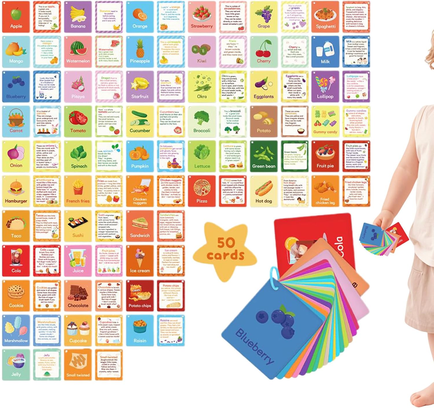 Costruttore di Concetti Educativi: Sviluppa la comprensione dei gruppi alimentari base attraverso carte visive con immagini e nomi di alimenti, migliorando lo sviluppo cognitivo e adattandosi all'uso in casa e a scuola con facilità. Superficie Anti-Macchia e Funzionale: Le carte laminate resistenti alle macchie garantiscono durabilità, sviluppano la flessibilità delle dita e incoraggiano la lettura, con una presa ergonomica a misura di bambino, ideale per mani piccole Strumento Educativo Completo: Cinquanta carte didattiche coprono sei categorie chiave tra cui frutta e cereali, con immagini realistiche ad alto contrasto che catturano l'interesse visivo e supportano una crescita strutturata della conoscenza Portatile e Pratico: Include anelli rilegatori per organizzare le schede per tema, garantendo accesso rapido al ripasso, evitando la perdita dei componenti e offrendo soluzione di conservazione compatta per lo studio in movimento per studenti e bambini Design Sicuro e Solido: Progettate con carta spessa e angoli smussati per una manipolazione ripetuta e sicura, resistono alla piegatura e assicurano un'esperienza tattile piacevole per i giovani apprendisti durante ogni utilizzo