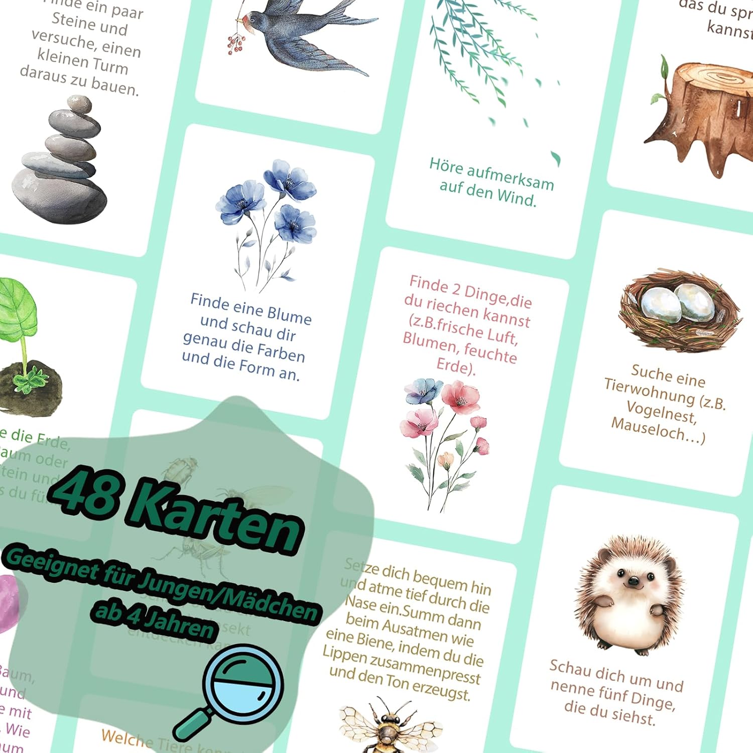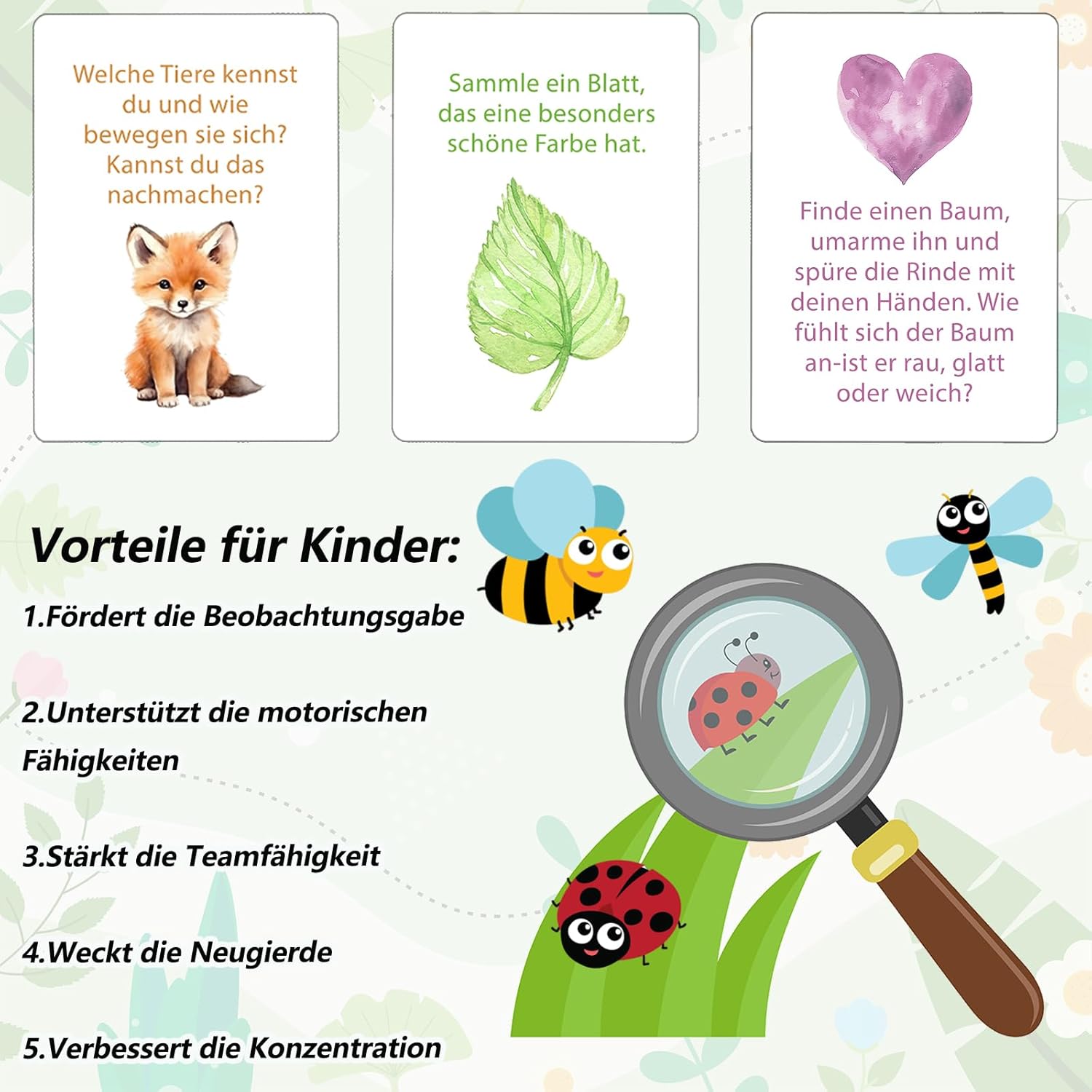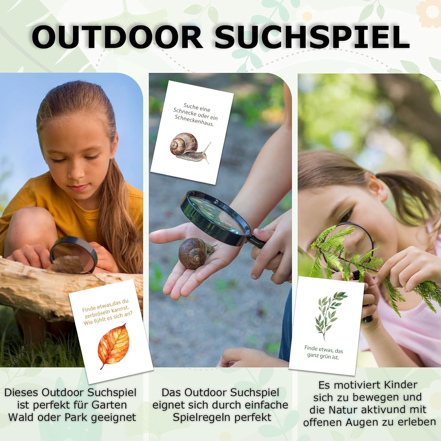 Scopri e lasciati stupire: con 48 carte scoperta progettate con cura, i bambini partecipano a un'emozionante caccia al tesoro nel gioco di ricerca all'aperto Found - promuove giocosamente la concentrazione, l'osservazione e la curiosità. Vivere la natura da vicino: questo gioco da esterno per bambini è perfetto per il giardino, il bosco o il parco. Motiva i bambini a muoversi e a scoprire attivamente la natura con le carte scoperta. Regalo ideale per i bambini di 4 anni: per il compleanno, come souvenir o per Pasqua, il gioco di ricerca all'aperto per bambini entusiasma i piccoli avventurieri che amano esplorare la natura. Robusto e maneggevole: il gioco trovalo contiene 48 carte robuste con istruzioni. Pulibile e confezionato in modo compatto - ideale per i viaggi, i viaggi o come gioco durante le vacanze in famiglia Per bambini dai 4 anni in su: i giochi da esterno a partire da 4 anni sono adatti a bambini dai 4 agli 8 anni grazie a semplici regole - possono essere giocati da soli, con gli amici o insieme ai genitori