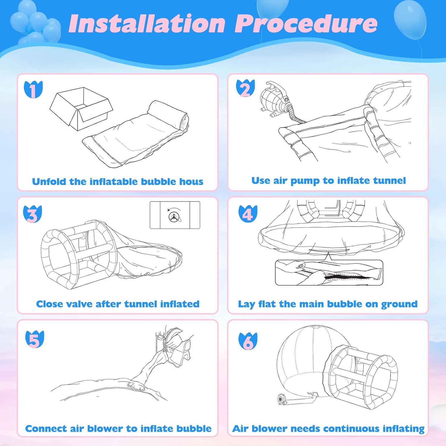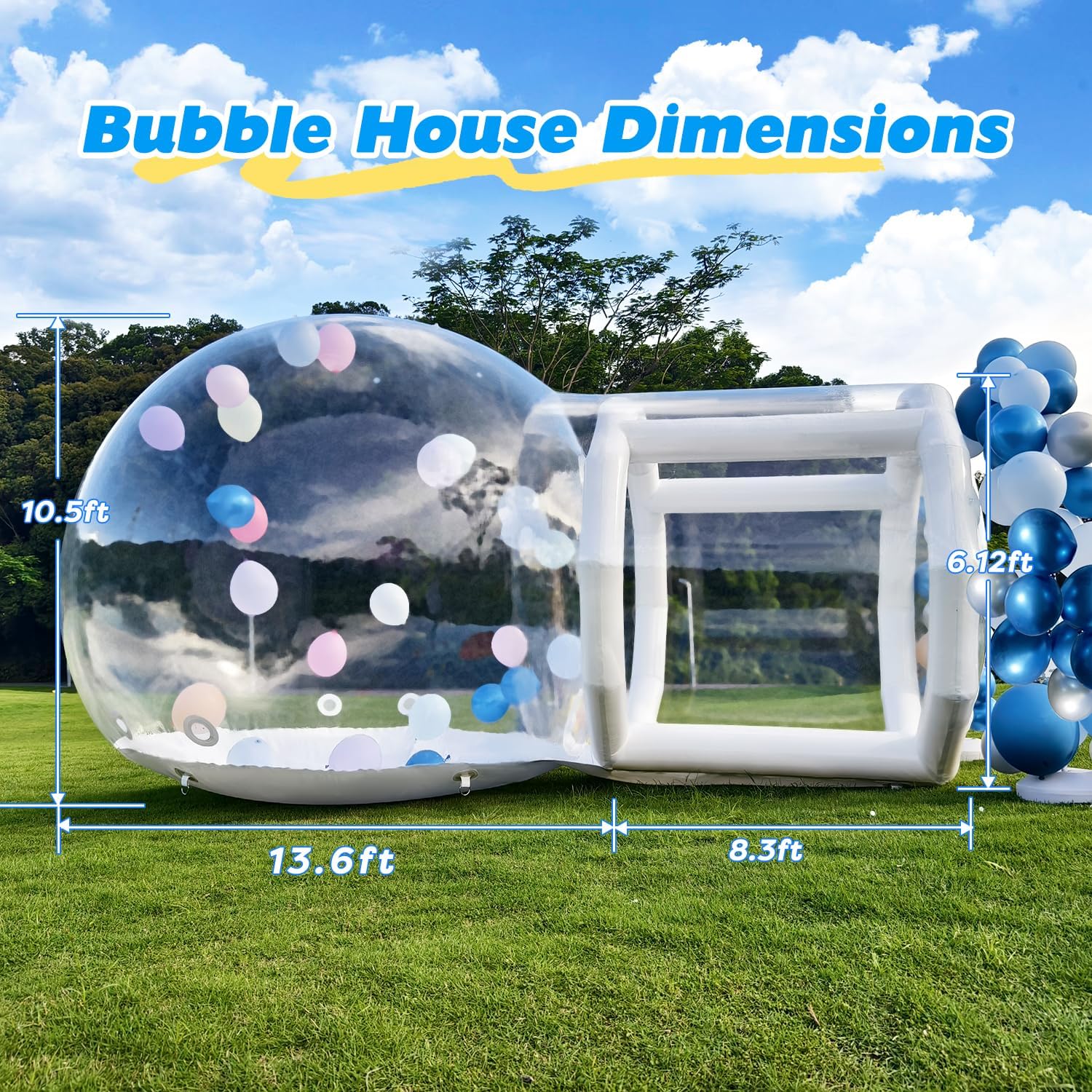 Materiale premium: la nostra casa a bolle gonfiabile trasparente è realizzata in PVC premium per uso commerciale. Con una combinazione di PVC trasparente da 0,4 mm e telone in PVC da 0,6 mm, offre una durata eccezionale ed è perfetto per feste al chiuso e attività all'aperto. 💐【Vista panoramica a 360°】Scopri il design unico della nostra casa a bolle gonfiabile trasparente. Questa tenda a bolla sferica offre piena trasparenza e ti protegge dal vento e dalla pioggia, fornendo allo stesso tempo una visione a 360 gradi del cielo durante il giorno e dell'affascinante cielo stellato di notte. Ideale per campeggio, eventi all'aperto, feste, riunioni di lavoro e mostre. SPAZIOSA E CONFORTEVOLE SOTTO IL CIELO STELLATO: la nostra cabina da campeggio a cupola trasparente ha un diametro di 10 piedi ed è alta 10 piedi quando gonfiata. Con abbastanza spazio per un letto da 7 piedi e un comodo spazio per 3-4 persone, potrete rilassarvi e godervi l'atmosfera all'aperto sotto il cielo stellato. Gonfiaggio e sgonfiaggio senza sforzo: dotata di una pompa ad aria e di una pompa ad aria elettrica, la nostra tenda a bolle gonfiabile trasparente è facile da montare e smontare. Non è richiesta alcuna costruzione complessa: utilizza semplicemente la grande pompa ad aria per il gonfiaggio continuo della casa delle bolle e la piccola pompa ad aria per il gonfiaggio delle colonne bianche. L'intero processo richiede solo 2-3 minuti. Eccellente servizio clienti: conta sul nostro team pre-vendita e post-vendita dedicato per un supporto professionale. Se hai domande sul prodotto, sul programma di consegna o sull'utilizzo, non esitare a contattarci in qualsiasi momento. Siamo qui 24 ore su 24, 7 giorni su 7 per garantire la tua soddisfazione.