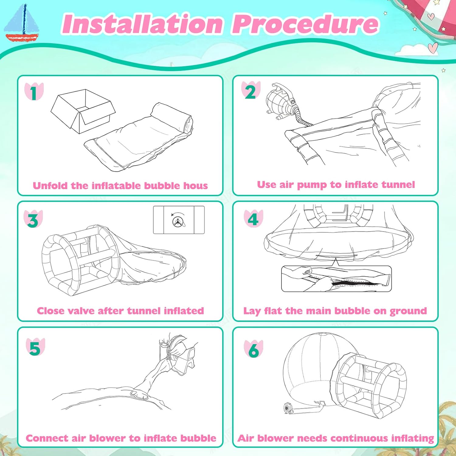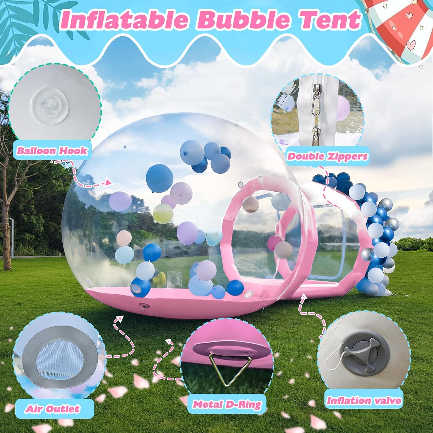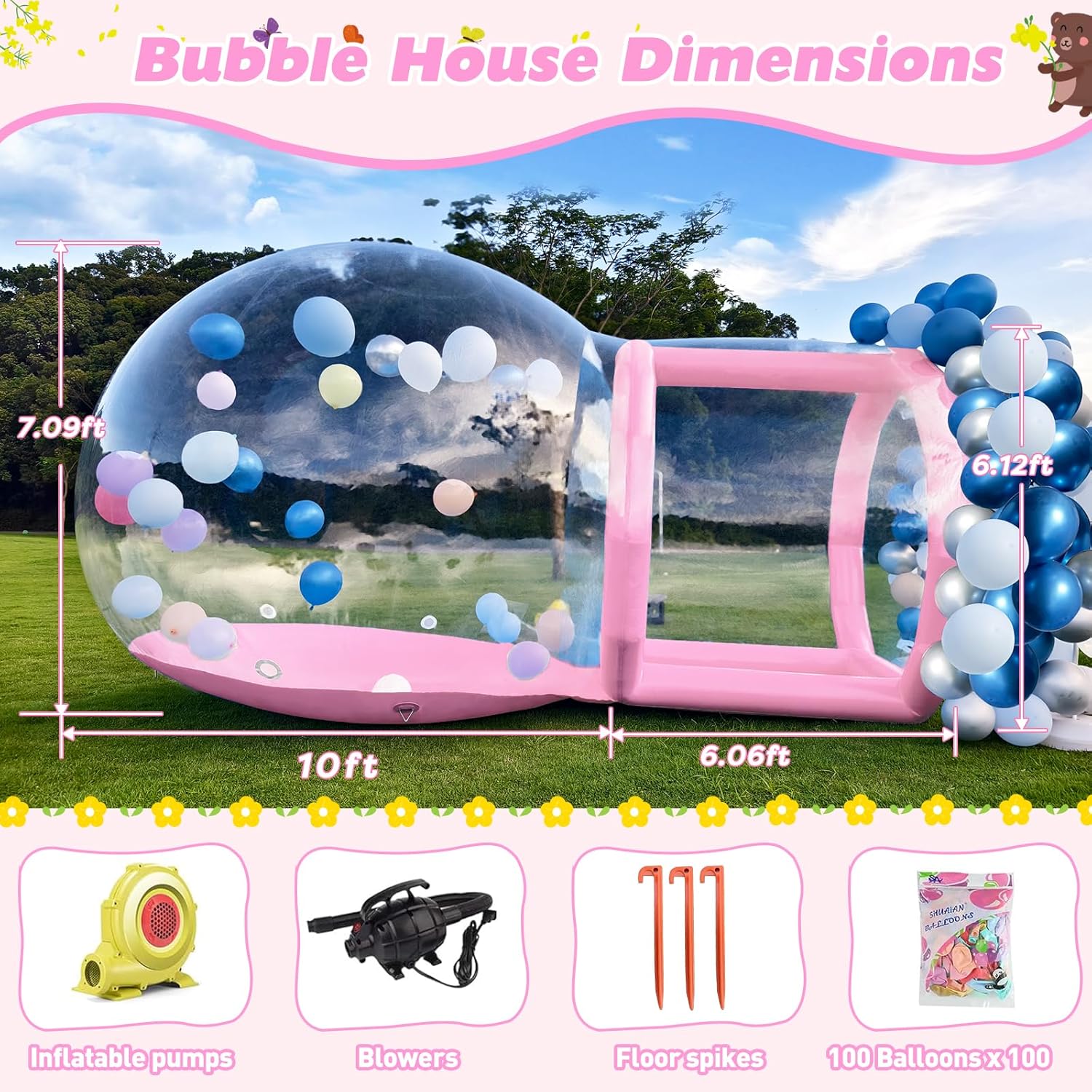 Materiale premium: la nostra casa a bolle gonfiabile trasparente è realizzata in PVC premium per uso commerciale. Con una combinazione di PVC trasparente da 0,4 mm e telone in PVC da 0,6 mm, offre una durata eccezionale ed è perfetto per feste al chiuso e attività all'aperto. 💐【Vista panoramica a 360°】Scopri il design unico della nostra casa a bolle gonfiabile trasparente. Questa tenda a bolla sferica offre piena trasparenza e ti protegge dal vento e dalla pioggia, fornendo allo stesso tempo una visione a 360 gradi del cielo durante il giorno e dell'affascinante cielo stellato di notte. Ideale per campeggio, eventi all'aperto, feste, riunioni di lavoro e mostre. SPAZIOSA E CONFORTEVOLE SOTTO IL CIELO STELLATO: la nostra cabina da campeggio a cupola trasparente ha un diametro di 10 piedi ed è alta 10 piedi quando gonfiata. Con abbastanza spazio per un letto da 7 piedi e un comodo spazio per 3-4 persone, potrete rilassarvi e godervi l'atmosfera all'aperto sotto il cielo stellato. Gonfiaggio e sgonfiaggio senza sforzo: dotata di una pompa ad aria da 750 W e una pompa ad aria elettrica da 600 W, la nostra tenda a bolle gonfiabile trasparente è facile da installare e smontare. Non è richiesta alcuna costruzione complessa: utilizza semplicemente la grande pompa ad aria per il gonfiaggio continuo della casa delle bolle e la piccola pompa ad aria per il gonfiaggio delle colonne bianche. L'intero processo richiede solo 2-3 minuti. Eccellente servizio clienti: conta sul nostro team pre-vendita e post-vendita dedicato per un supporto professionale. Se hai domande sul prodotto, sul programma di consegna o sull'utilizzo, non esitare a contattarci in qualsiasi momento. Siamo qui 24 ore su 24, 7 giorni su 7 per garantire la tua soddisfazione.