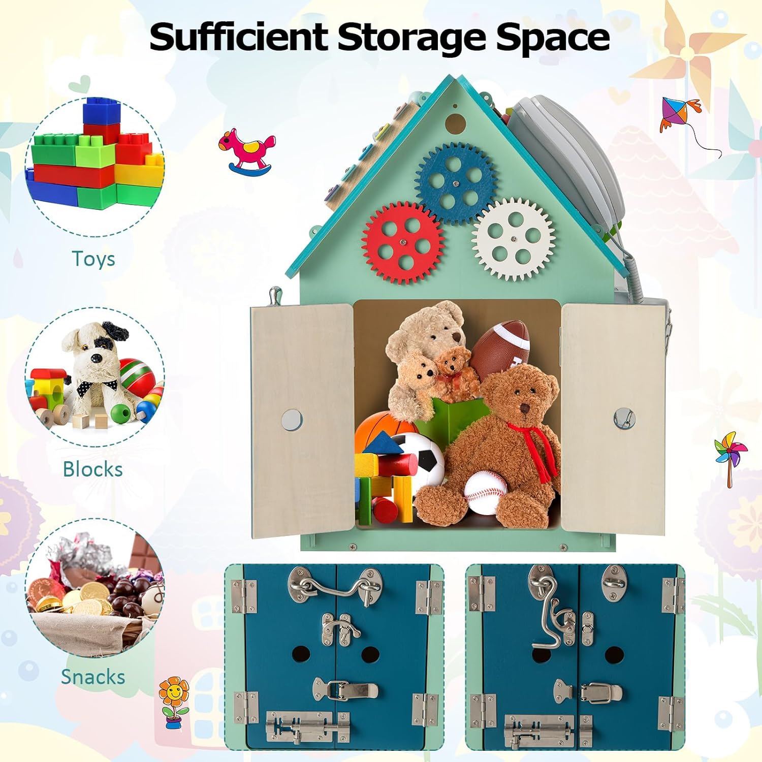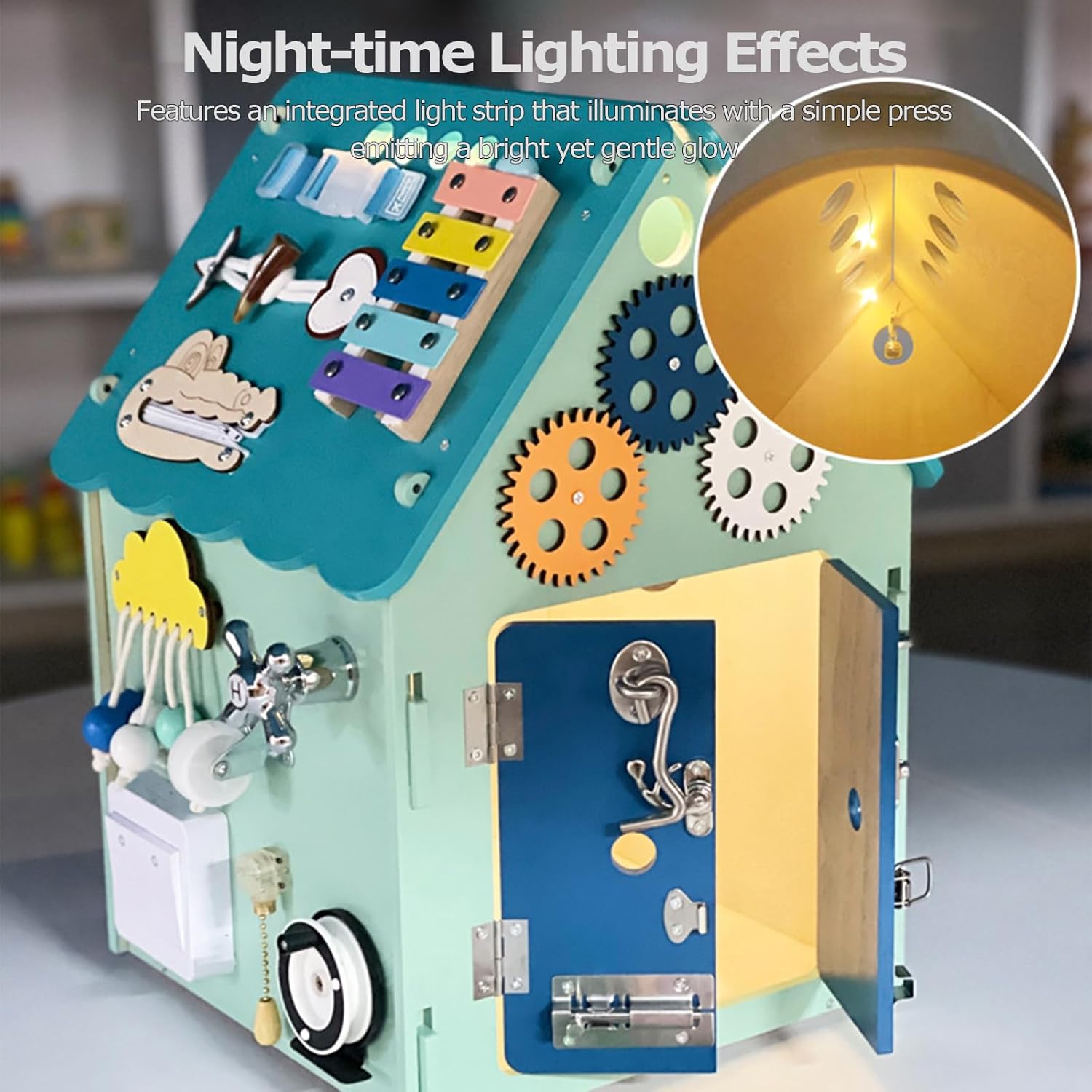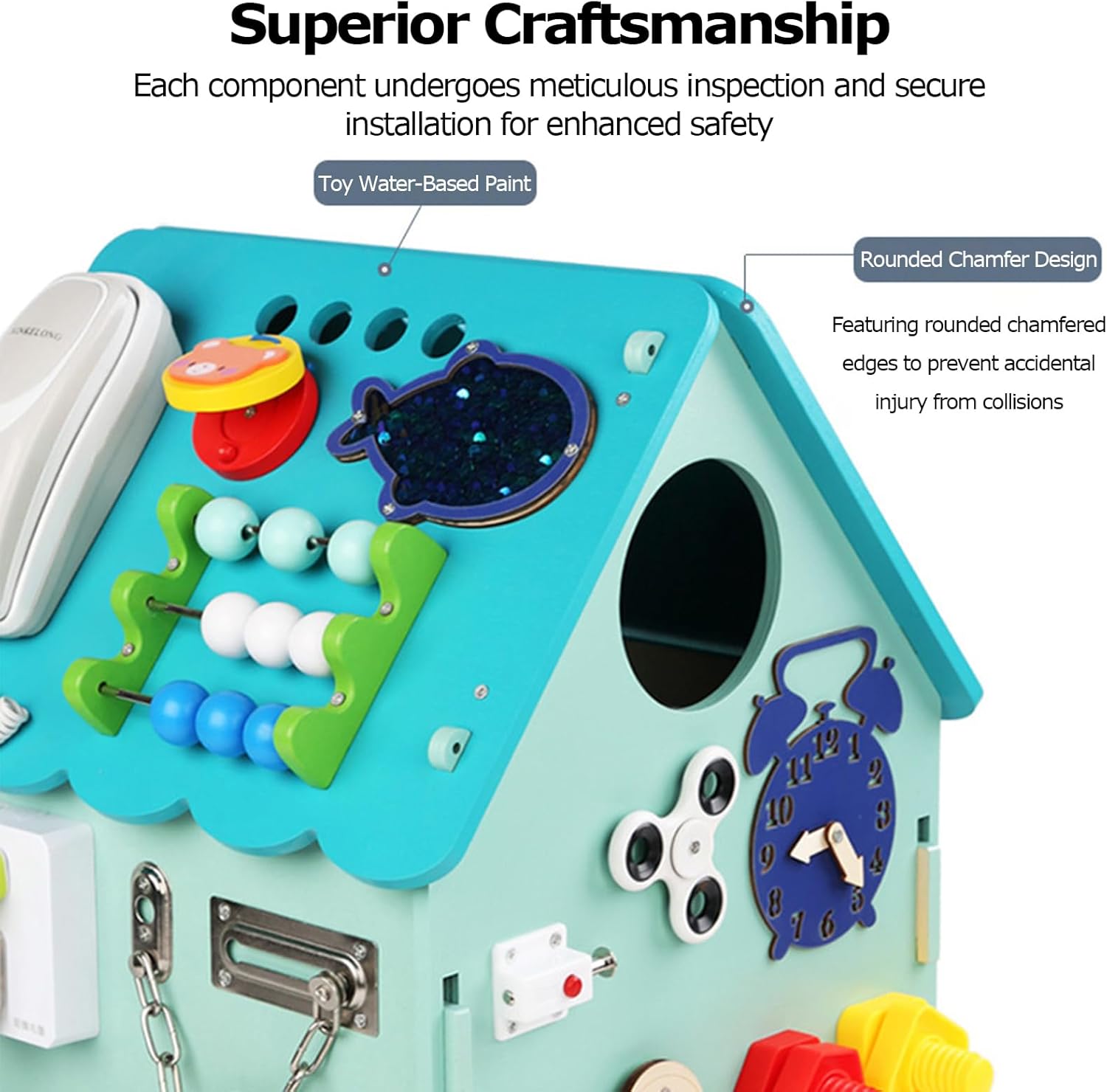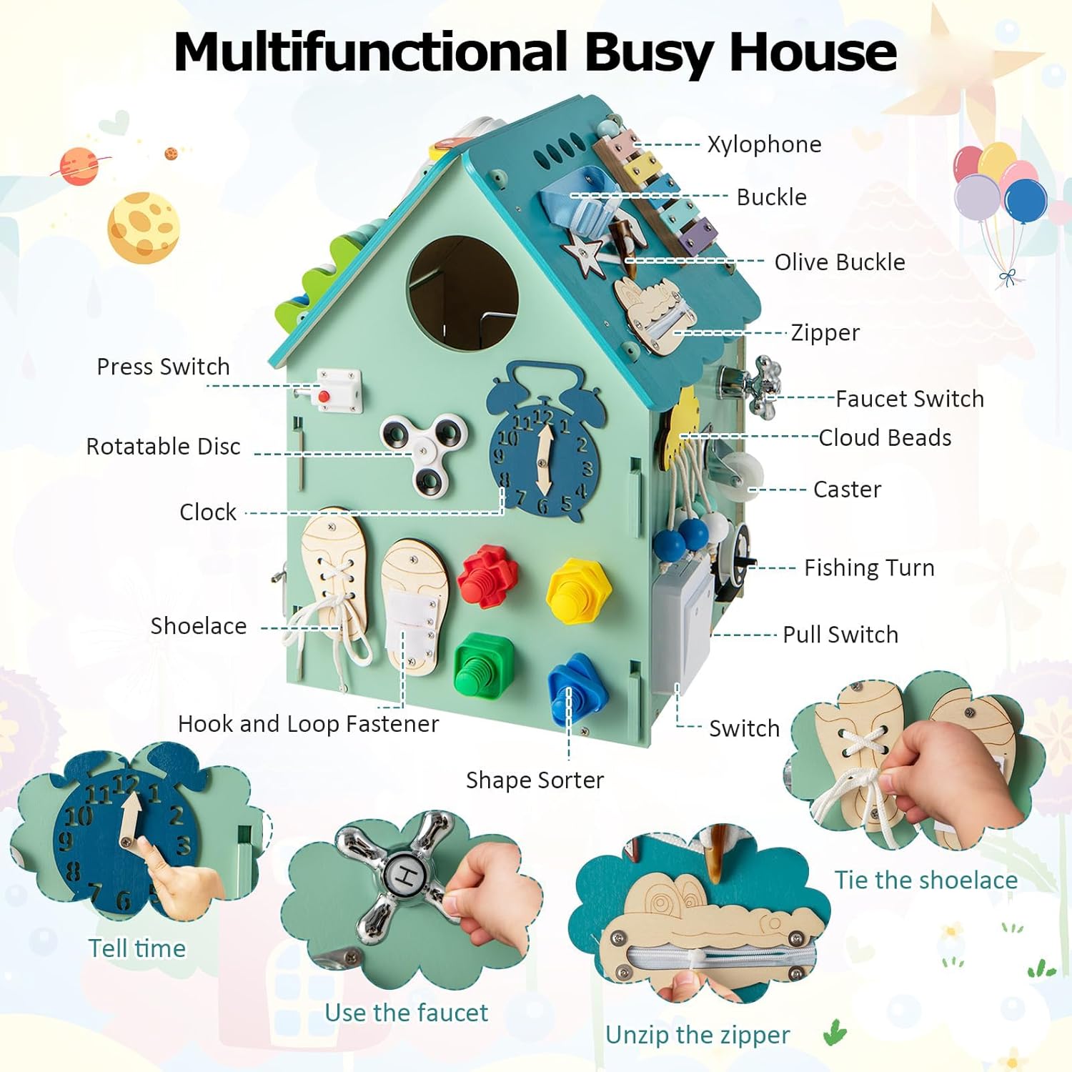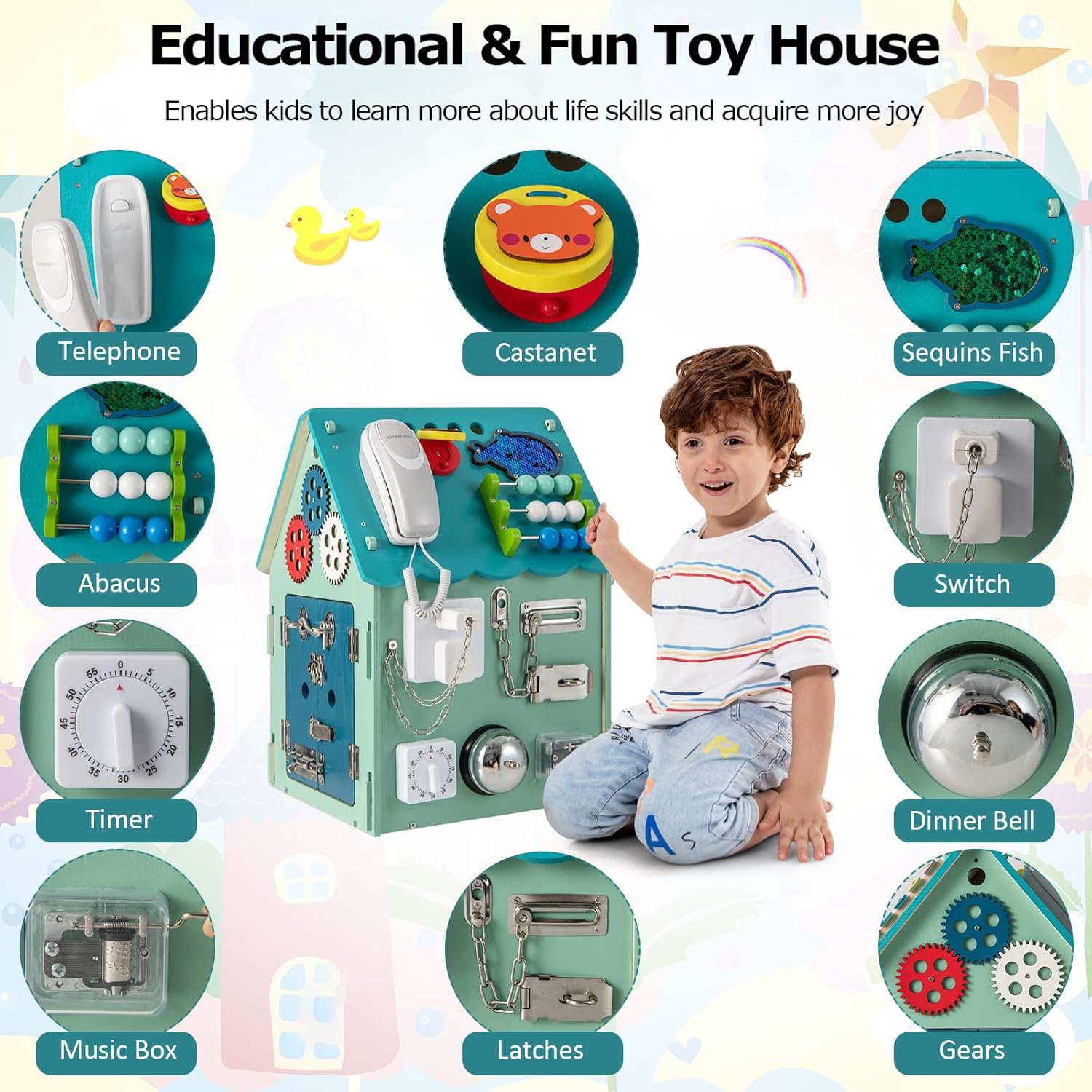 【Centro Attività Coinvolgente per Bambini Piccoli】La Casa Occupata in Legno è progettata per intrattenere da 1 a 4 bambini piccoli contemporaneamente, con una varietà di elementi coinvolgenti come un disco rotante, un selezionatore di forme, uno xilofono, una castagnola, un abaco, ingranaggi, pesci di paillettes e perline a forma di nuvola. La musica integrata aggiunge ulteriore divertimento a questa lavagna sensoriale interattiva per bambini. 【Favorisce l'apprendimento educativo】Questo giocattolo educativo per bambini piccoli è pieno di aree di gioco che insegnano abilità essenziali per la vita. I bambini possono imparare a leggere l'orologio e impegnarsi in giochi di fantasia con il telefono. La varietà di attività, tra cui un interruttore a pressione, lacci delle scarpe, fibbia a oliva, cerniera, giro di pesca, interruttore del rubinetto, interruttore a trazione, timer, ruota, campanello della cena e chiusure a scatto, migliora le 【Spazio di Stoccaggio Interno Conveniente】La Wooden Busy House dispone di una stanza interna progettata con cura che offre ampio spazio di archiviazione per i giocattoli, i blocchi o gli snack dei bambini. Questo incoraggia i più piccoli a sviluppare abitudini organizzative mantenendo ordinata la loro area di gioco. 【Costruzione Sicura e Durevole】Realizzata con pannelli di legno di alta qualità e materiali metallici, la Tavola delle Attività Sensoriali per Bambini garantisce durata e una lunga vita utile. Gli angoli arrotondati sono progettati per prevenire urti accidentali, rendendola un'opzione sicura per i bambini piccoli. 【Montaggio Veloce e Facile】Goditi un assemblaggio senza problemi grazie al design preassemblato della Wooden Busy House. Tutta l'hardware necessario è incluso, permettendo ai genitori di montare rapidamente questo giocattolo educativo in modo che i bambini possano iniziare a giocare subito. Le sue dimensioni compatte di 33 cm x 33 cm x 45 cm (L x P x A) lo rendono facile da inserire in qualsiasi stanza giochi.