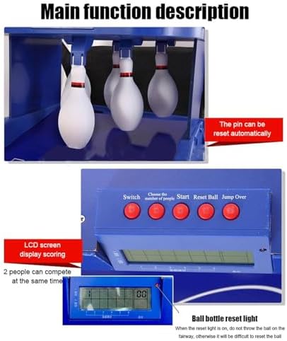 Funzione di ritorno automatico della palla: migliora il gameplay reimpostando automaticamente i birilli e producendo effetti sonori realistici all'impatto, per un'esperienza di bowling coinvolgente. Set completo da bowling per bambini: include 6 birilli in plastica resistente e 2 palle da bowling, tutti realizzati in plastica atossica di alta qualità per un ambiente di gioco sicuro. Compatto e facile da riporre: progettato per l'uso in interni, questo gioco da bowling è veloce da montare e può essere facilmente ripiegato, ideale per le case con spazio limitato. Sistema di punteggio elettronico a LED: tiene traccia automaticamente dei punteggi durante il gioco, supportando sia la modalità giocatore singolo che quella a due giocatori per favorire il divertimento competitivo e l'interazione. Favorisce il legame familiare: un mix perfetto di intrattenimento e abilità, questo gioco di bowling è un modo meraviglioso per riunire le famiglie, incoraggiando interazioni gioiose.