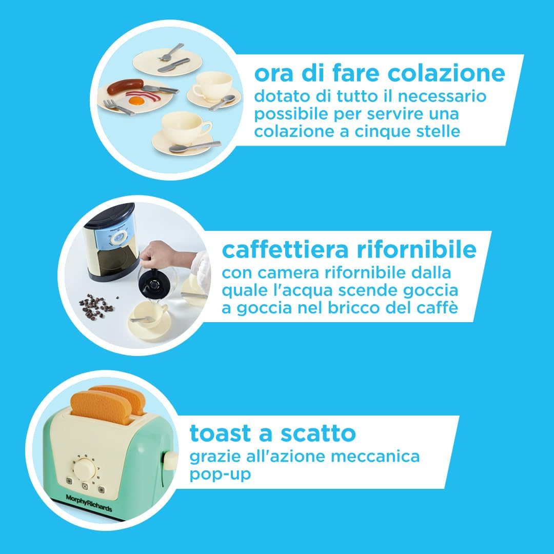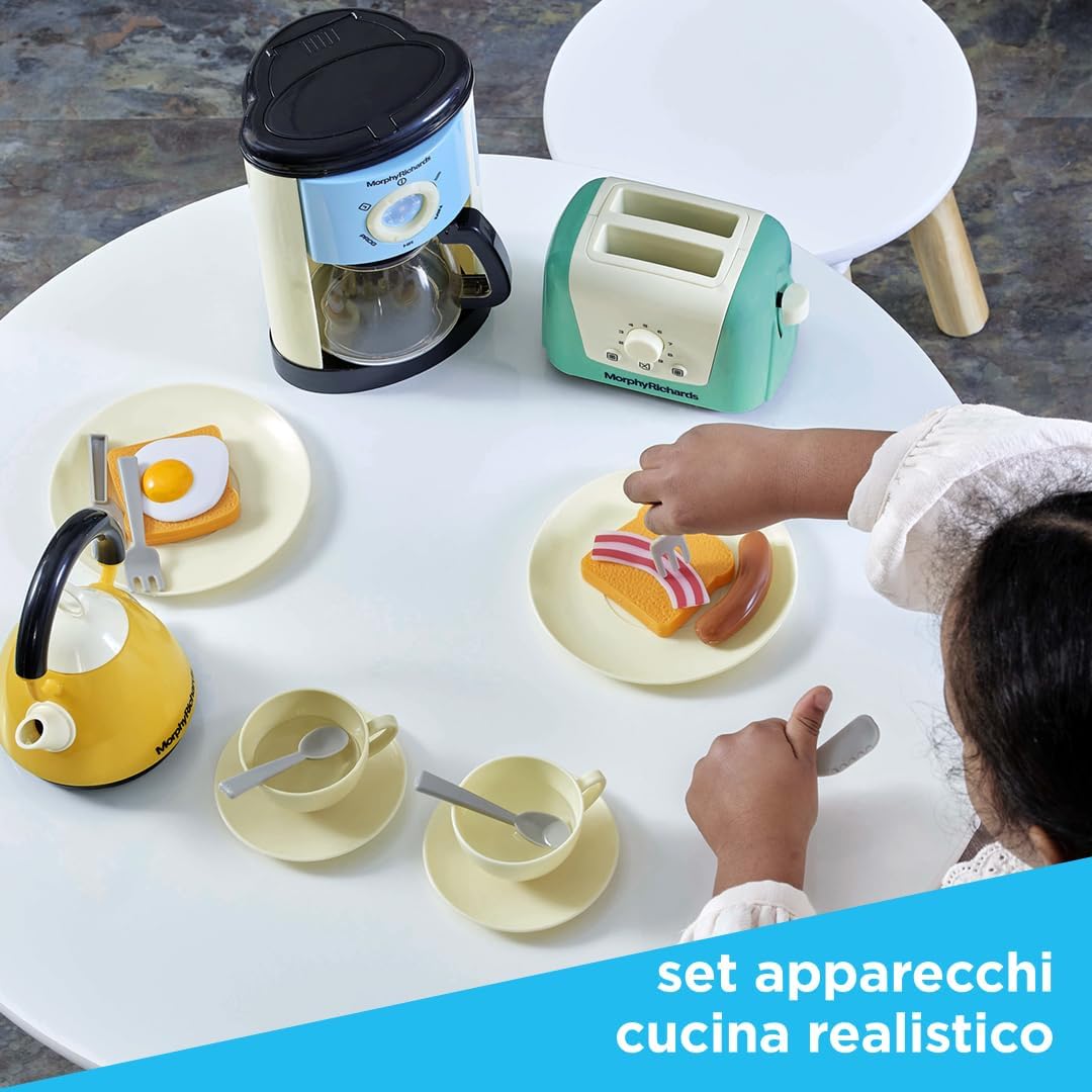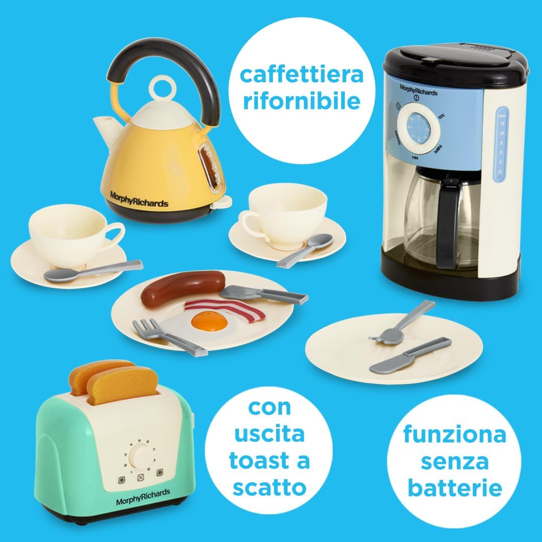 PROPRIO COME QUELLA VERA: Questa serie completa di elettrodomestici di Morphy Richards ha l'aspetto e le funzioni di una cucina vera! PIATTI DELIZIOSI IN ARRIVO: È sempre il momento giusto per una colazione all'inglese! Prepara il caffè, accendi il bollitore e prepara qualche toast! SVILUPPA L'IMMAGINAZIONE: Questo set di elettrodomestici permette ai piccoli di fare come i grandi! INCLUDE: Set completo di elettrodomestici inclusi macchina da caffè, bollitore con indicatore del livello dell'acqua, tostapane con espulsione automatica e cibo giocattolo. DIMENSIONI: Peso (kg): 0,81, Lunghezza (cm): 30,0, Larghezza (cm): 26,0, Altezza (cm): 18,5 ADATTO A BAMBINI DI ETÀ SUPERIORE A 3 ANNI: Batterie non necessarie.
