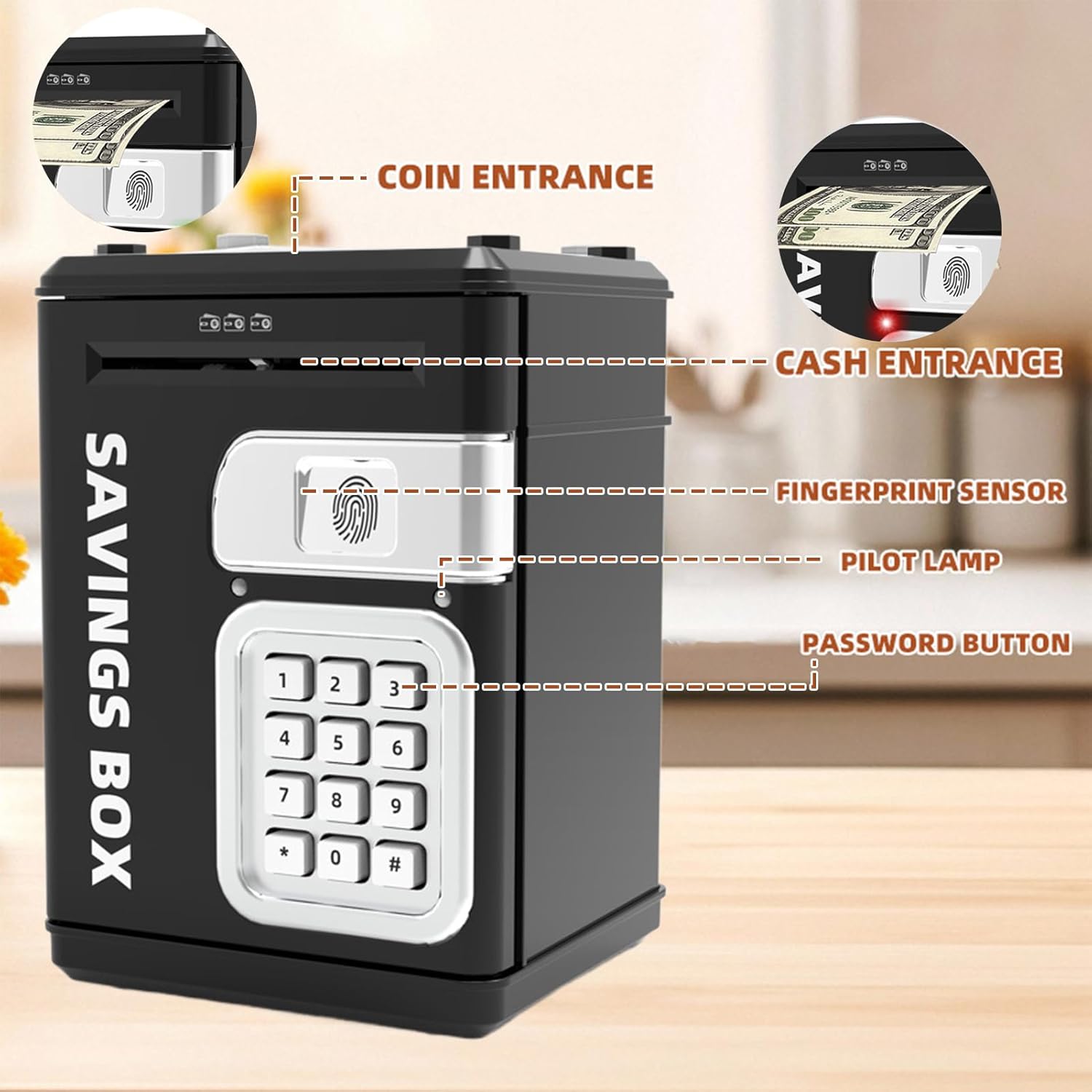 Insegnamento concetti consumo: Fornisce strumenti pratici per comprendere le abitudini di spesa attraverso metodi coinvolgenti che integrano simulazioni di risparmio, creando un ambiente immersivo apprendono gradualmente il valore della gestione del denaro passo dopo passo Compagno Crescita Versatile: Progettato per bambini di varie età, supporta lo sviluppo con funzioni adattabili come deposito per denaro e oggetti, creando ricordi d'infanzia durante tutto il percorso di crescita Durabilità Prolungata: Progettato in ABS ad alta resistenza, assicura prestazioni affidabili durante l'uso prolungato grazie alla struttura resistente a urti e usura e ai bordi perfettamente levigati Motivazione Interattiva Giocosa: L'interazione di deposito basata sul raggiungimento di obiettivi ispira divertimento e motivazione al risparmio con effetti luminosi dinamici e feedback sonori celebrativi per un'esperienza immersiva Sicurezza Futura Pronta: Impostazioni password regolabili e controlli impronta avanzati assicurano approccio tecnologico raffinato per esperienze di ingresso sicure