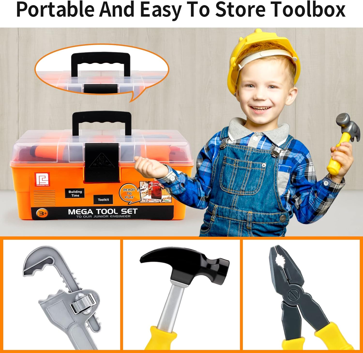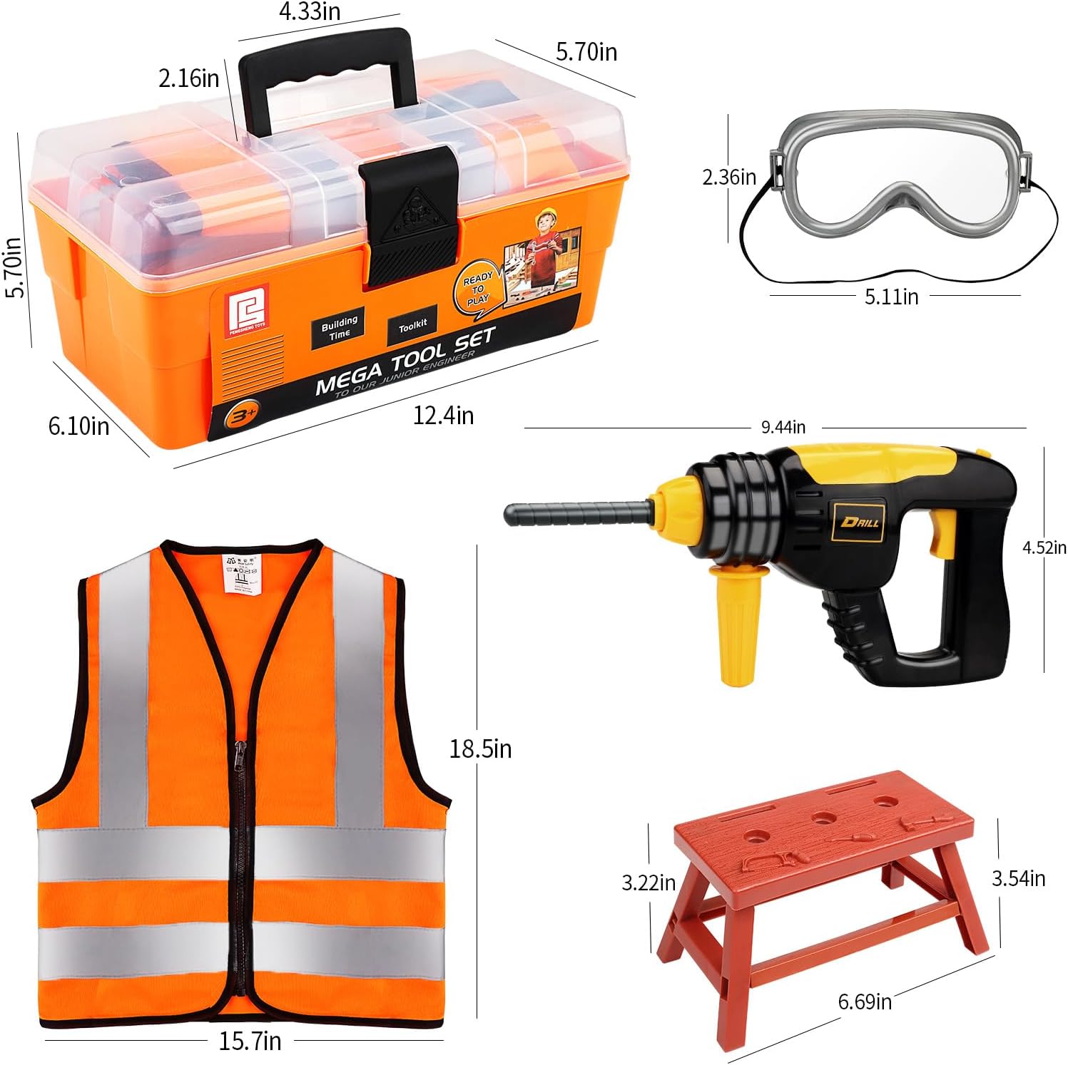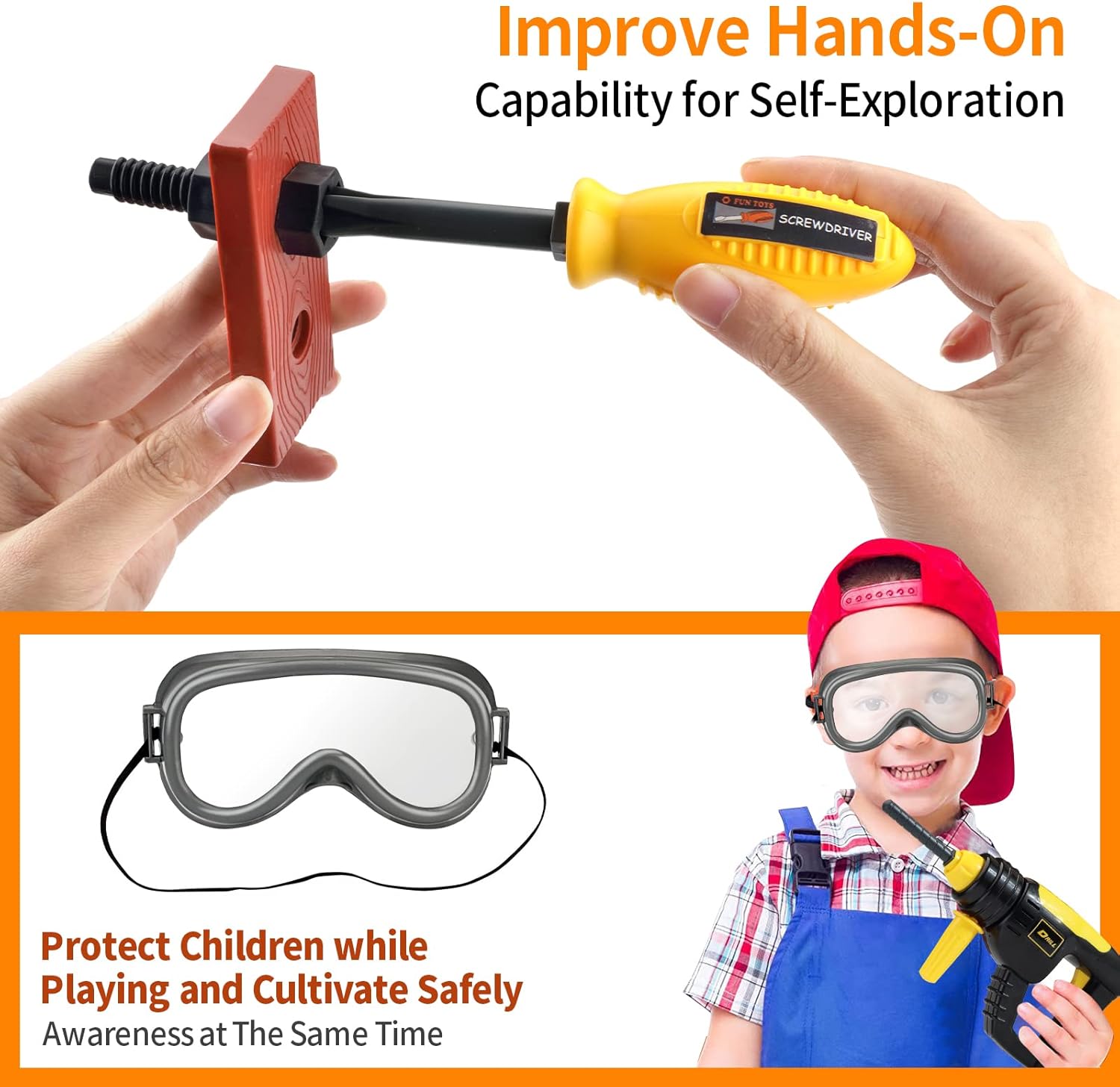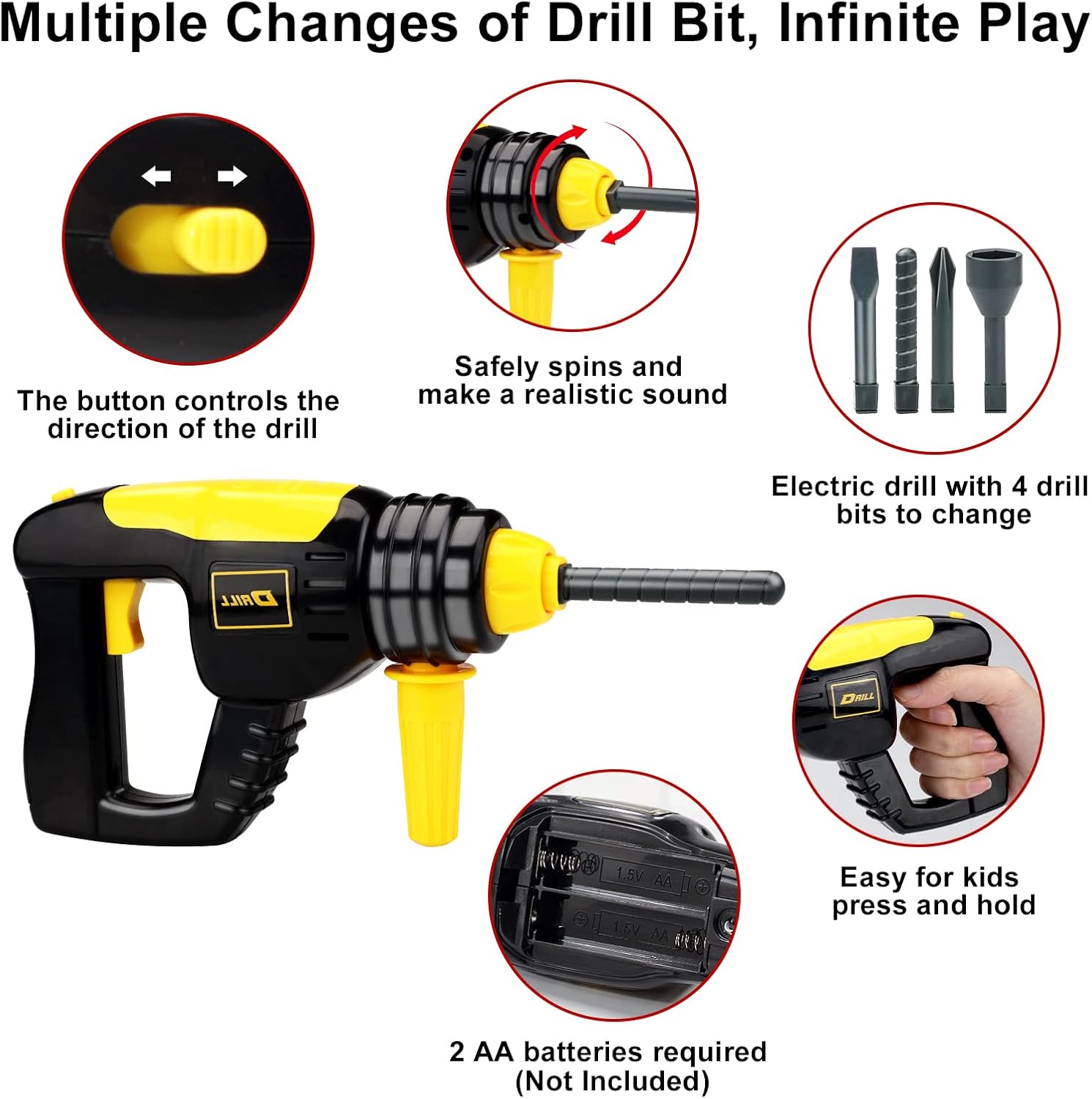【Set di punte per trapano elettrico】 Il trapano giocattolo è dotato di 4 punte intercambiabili per diverse funzioni, richiede solo 2 batterie AA, emette suoni e movimenti simulati per maggiore attrattiva, e aiuta a sviluppare l'immaginazione dei bambini. 【Kit di attrezzi portatile e facilmente riponibile】 Questo set di 45 pezzi di giocattoli per bambini include tutto il necessario in una valigetta simile a quella del papà. Il set include un trapano giocattolo a batteria, martello, cacciavite, occhiali protettivi, coltello, valigetta degli attrezzi, tuta da lavoro, chiave inglese, viti e altro ancora. 【Materiali durevoli e sicuri】 Questo set di attrezzi per bambini è realizzato in plastica ABS di alta qualità, sicura e non tossica. Inoltre, rende i nostri giocattoli più robusti e duraturi. Tutti gli utensili sono progettati appositamente per i bambini, con bordi arrotondati e superfici lisce. 【Giocattoli per giochi di imitazione educativi】 Sono progettati per stimolare l'immaginazione dei bambini, aiutandoli a sviluppare capacità e abilità infinite e a divertirsi a diventare piccoli artigiani. 【Il regalo perfetto per i bambini】 Questo set di attrezzi è adatto ai bambini che amano gli attrezzi e fare lavori manuali. È un regalo perfetto per Natale o compleanni per ragazzi di 3, 4, 5, 6, 7, e 8 anni. Se non sei soddisfatto dei nostri giocattoli, contattaci immediatamente.