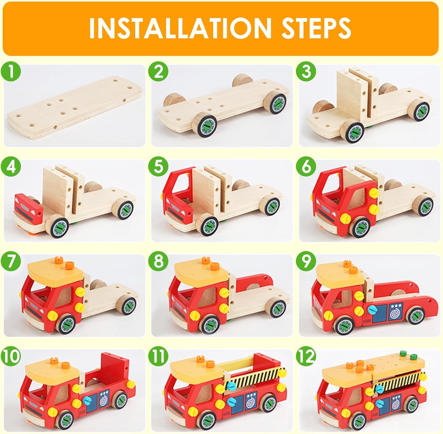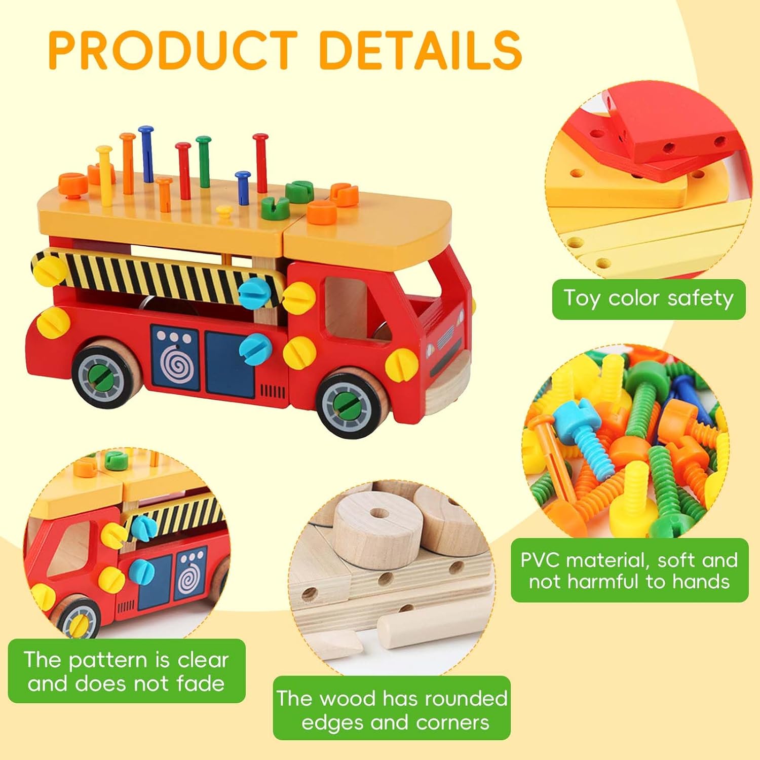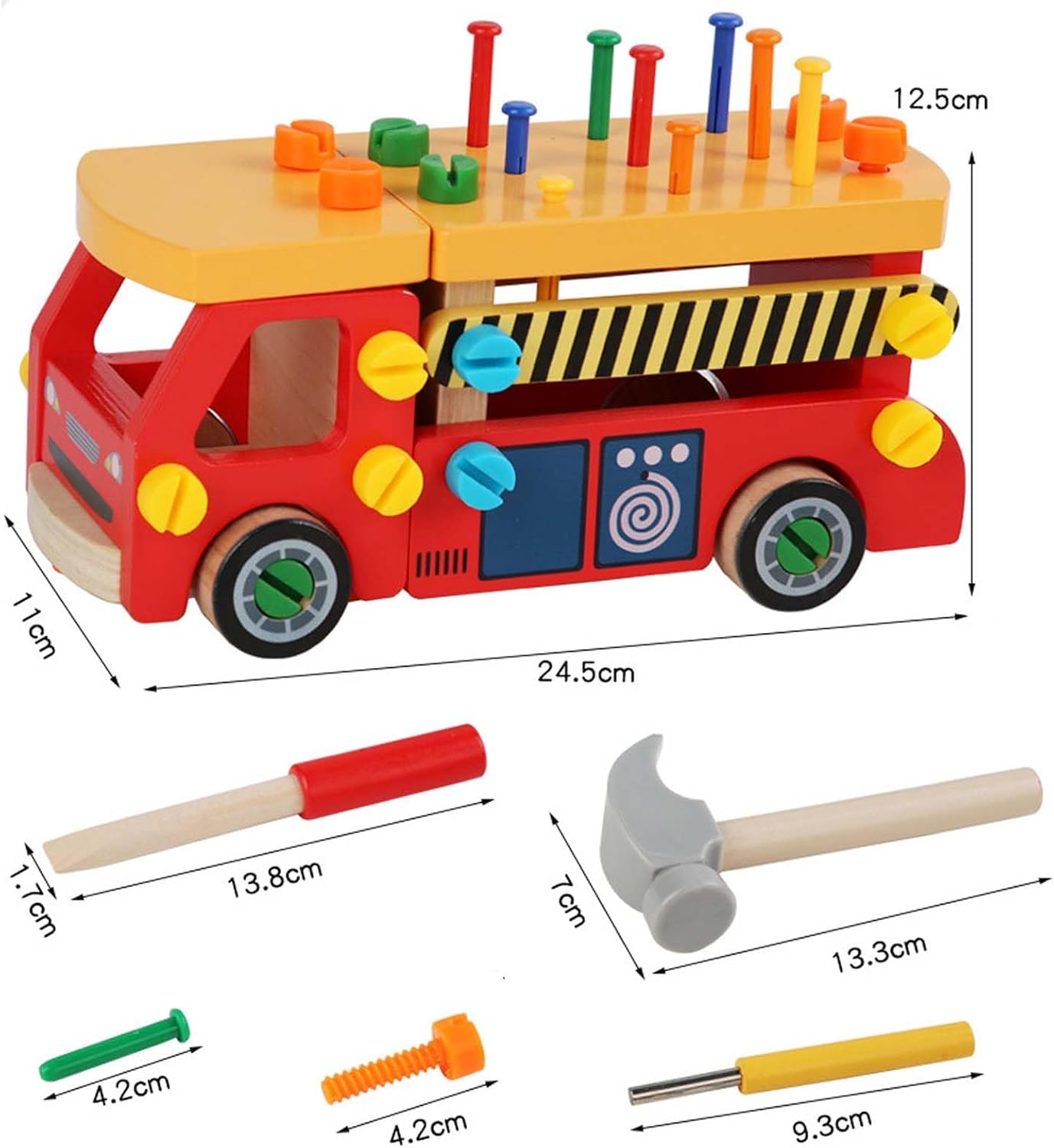 💝【Set di utensili in legno da 62 pezzi】Il set di giocattoli con cassetta degli attrezzi in legno ha ricchi accessori, tra cui 16 viti lunghe, 16 viti corte, 10 chiodi, 13 parti di binari antincendio, quattro ruote, un martello, un cacciavite e uno strumento per chiodi. Il giocattolo con cassetta degli attrezzi multifunzionale è adatto come giocattolo Montessori per bambini. 🛠【Giocattoli in legno Montessori】La macchina degli attrezzi in legno Montessori offre una vasta gamma di attività per i bambini piccoli. I bambini possono martellare chiodi, avvitare viti, ecc., evitando di usare utensili veri e di farsi male accidentalmente. Stimola le capacità motorie fini e la coordinazione occhio-mano. È più adatto a bambini di età superiore ai tre anni. 🌟【Educativo e divertente】I giocattoli educativi Montessori possono essere utilizzati come banchi da lavoro per bambini, cassette degli attrezzi e camion dei pompieri fai-da-te, testando le capacità di assemblaggio e pratiche dei bambini. Ogni piccolo ingegnere sogna di costruire i propri giocattoli. I bambini possono combinare piccole parti in vari giocattoli, come divani, auto da corsa, ecc. Incoraggia i bambini a sviluppare capacità motorie fini, coordinazione occhio-mano e capacità di risoluzione dei problemi quando manipolano strumenti e parti e stimola completamente l'immaginazione dei bambini. 🌈【Sicuro e di alta qualità】Gli accessori del set di giocattoli da banco sono realizzati in legno di alta qualità, questo set di giocattoli è liscio, senza sbavature e sicuro per i bambini. I colori vivaci e atossici aggiungono fascino visivo e stimolano l'immaginazione del tuo bambino. 🎁【Regalo di gioco di ruolo perfetto per bambini】È un fantastico giocattolo didattico che può incoraggiare i bambini a imitare gli adulti nell'uso degli strumenti, il migliore per i più piccoli per creare giochi di finzione e soddisfare la loro curiosità, anche come giocattoli interattivi per promuovere la relazione genitore-figlio durante il gioco. È una buona scelta regalo per bambine di 3 4 5 6 anni per compleanno/Natale/Vacanze.