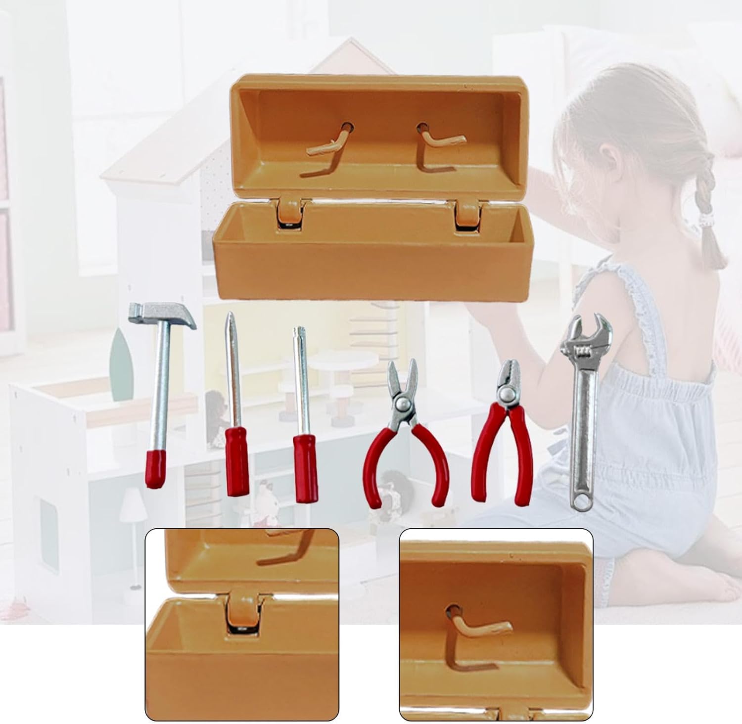 【Multiuso】Il modello di giocattolo per finte foto è adatto per costruire giocattoli con scenari di tavoli di sabbia, modellini di treni, modelli architettonici, giardini delle fate, micro paesaggi, modelli di scene fai da te, ecc. 【Regalo ideale】: questa custodia per attrezzi da giardino fai da te in miniatura è un regalo per appassionati di miniature. Include un martello, una chiave inglese, due cacciaviti, una pinza e un morsetto per utensili in una custodia compatta. 【Caratteristica】Mini modello di cassetta degli attrezzi in legno, con dettagli realistici, set di utensili in miniatura multifunzionale con dettagli realistici, ottimo per la costruzione e la decorazione di case delle bambole 【Set in miniatura versatile】: il set di mini utensili può essere facilmente abbinato ad altri accessori agricoli in miniatura per completare la tua casa delle bambole fai da te con giardino delle fate 【Materiale】: Questo modello di strumento di riparazione in miniatura per casa delle bambole in 1/12 o 1/6 è realizzato in metallo e PP, aggiungendo un tocco di realismo agli accessori della tua casa delle bambole