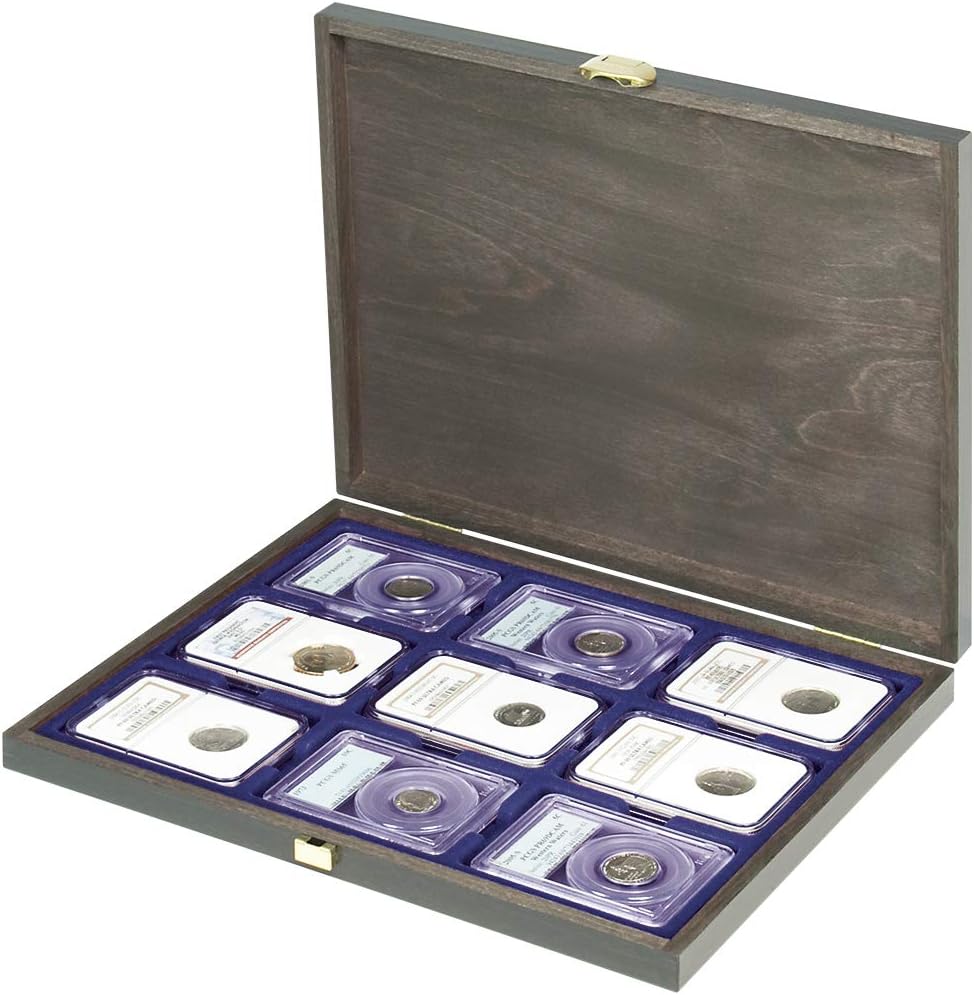 Cassetta in vero legno con inserto portamonete blu scuro con 9 scomparti rettangolari. L'inserto per monete è ricoperto da un fiocco di velluto di alta qualità. Formato: 303 x 240 x 30 mm. PRODOTTO IN GERMANIA. Adatto per capsule portamonete USA (slab) fino al formato 63x85 mm.