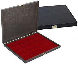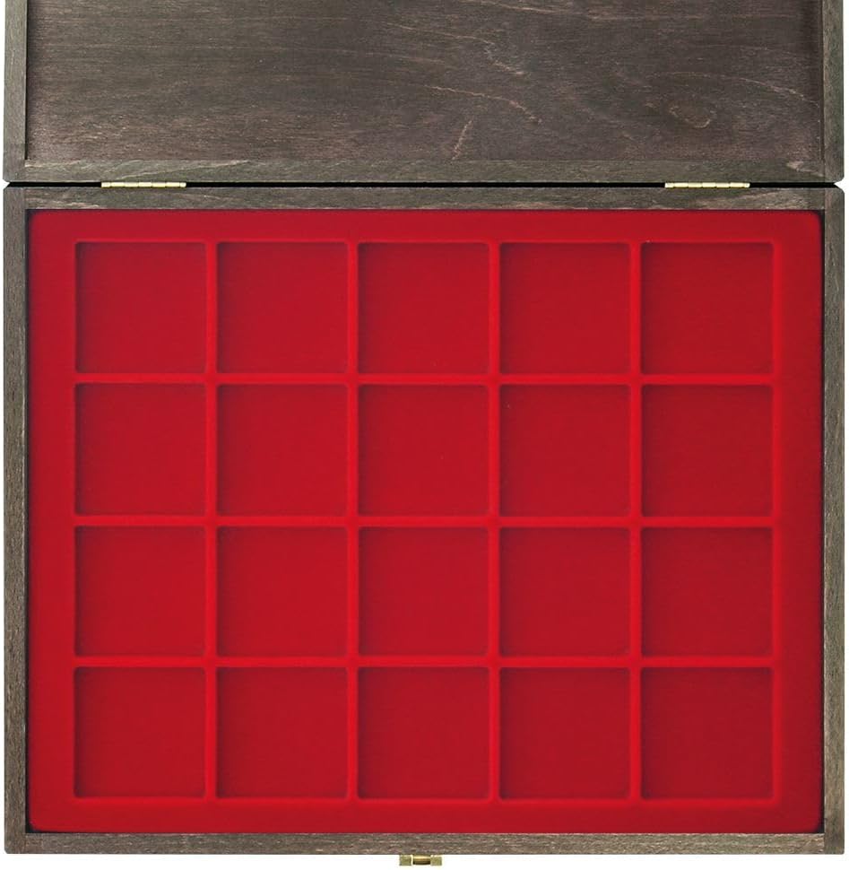 Cassetta in vero legno con inserto per monete rosso scuro con 20 scomparti quadrati. L'inserto per monete è ricoperto da un fiocco di velluto di alta qualità. Formato: 303 x 240 x 30 mm. PRODOTTO IN GERMANIA. Adatto per monete/capsule per monete fino a un diametro esterno di 47 mm.