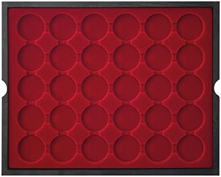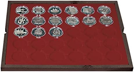 Cassetta in vero legno con 4 vassoi e inserti per monete rosso scuro, ciascuno con 30 rientranze rotonde. Gli inserti per monete sono ricoperti da un fiocco di velluto di alta qualità. Formato: 323 x 265 x 61 mm. PRODOTTO IN GERMANIA. Adatto per capsule per monete con diametro esterno di 39 mm, ad es. per monete d'argento tedesche da 20 Euro/10 Euro in capsule portamonete LINDNER (articolo n. 2250325P).