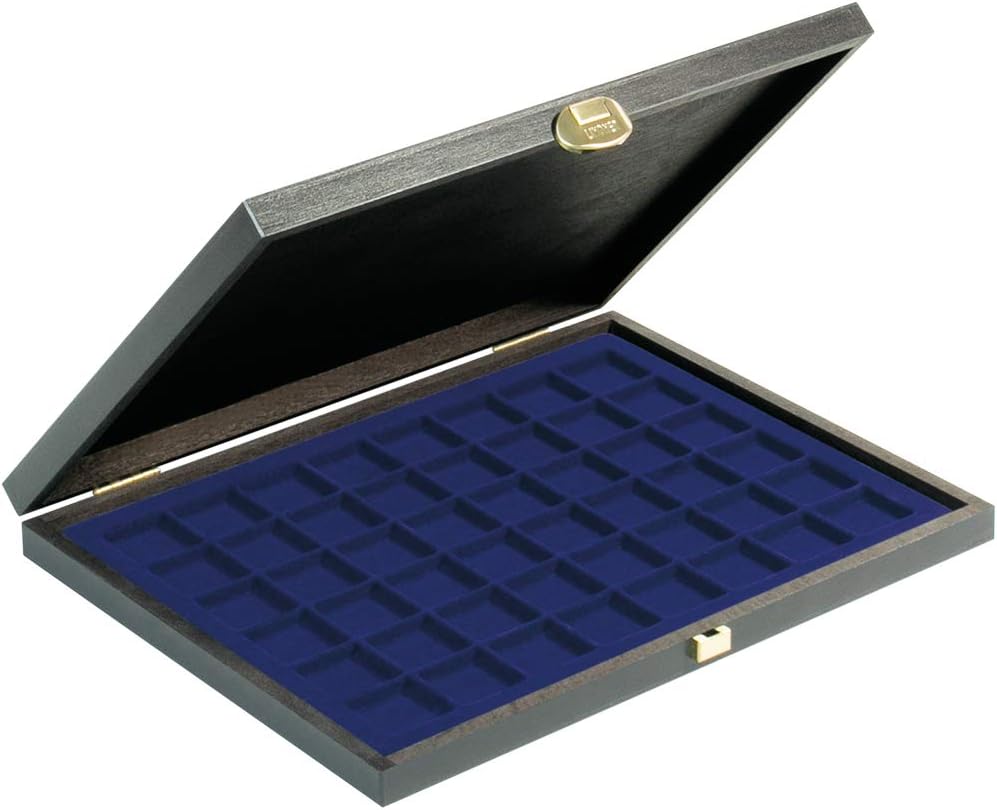 Cassetta in vero legno con inserto portamonete blu scuro con 48 scomparti quadrati. L'inserto per monete è ricoperto da un fiocco di velluto di alta qualità. Formato: 303 x 240 x 30 mm. PRODOTTO IN GERMANIA. Adatto per monete/capsule per monete fino a un diametro esterno di 30 mm o capsule per champagne.