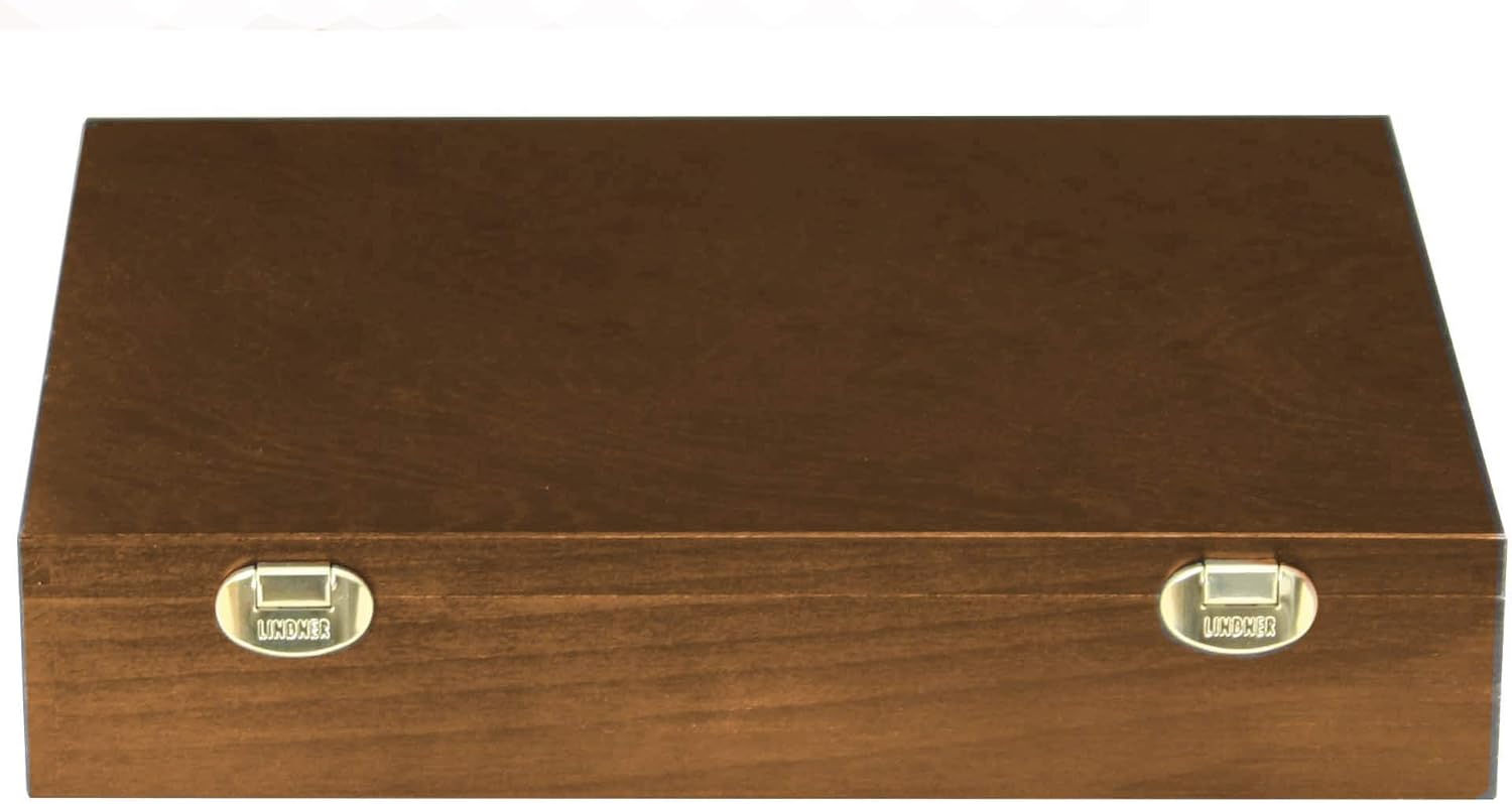 Cassetta in vero legno con 4 vassoi in legno e inserti per monete nere, ciascuno con 20 scomparti quadrati. Con 2 chiusure Gli inserti per monete sono ricoperti da un fiocco di velluto di alta qualità. Adatto per monete/capsule per monete fino a un diametro esterno di 47 mm. Formato: 323 x 265 x 61 mm. PRODOTTO IN GERMANIA.