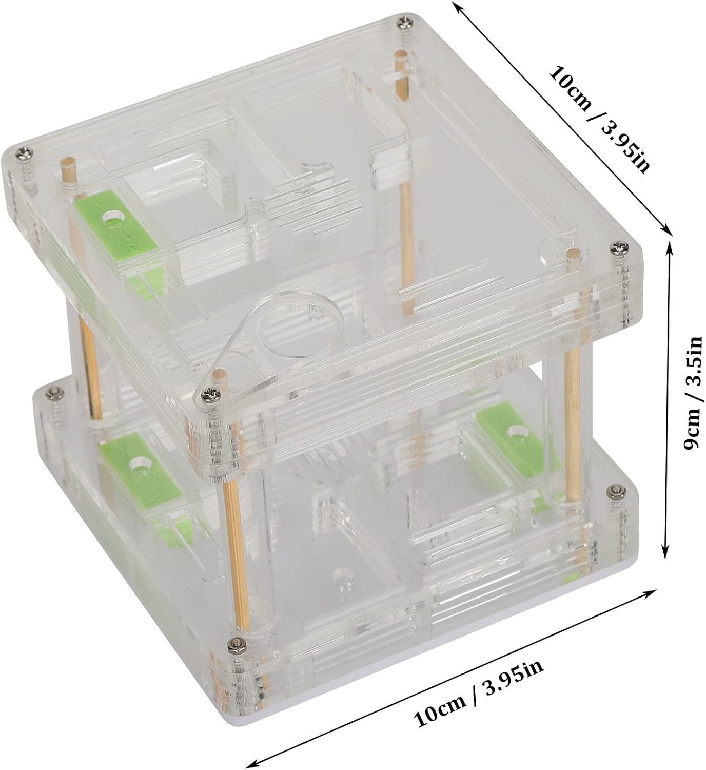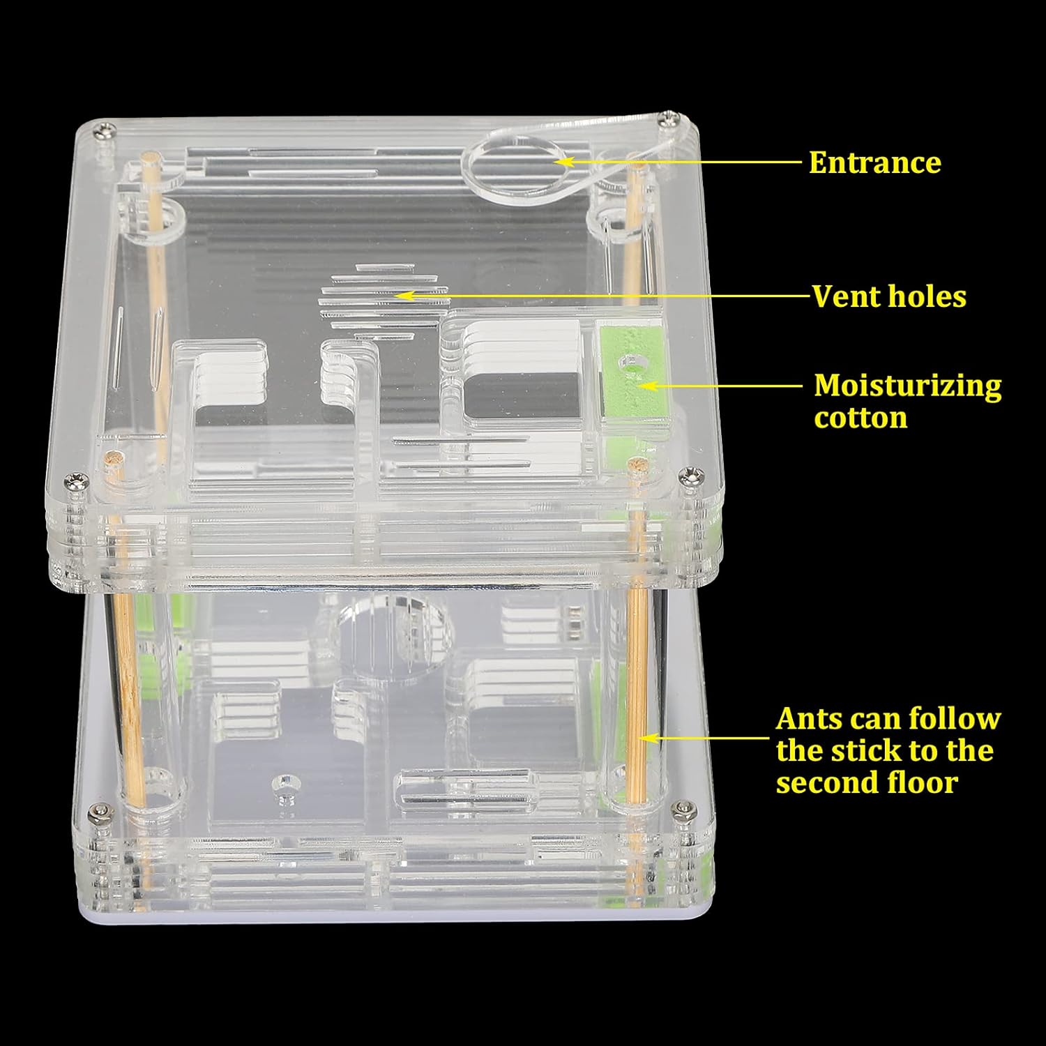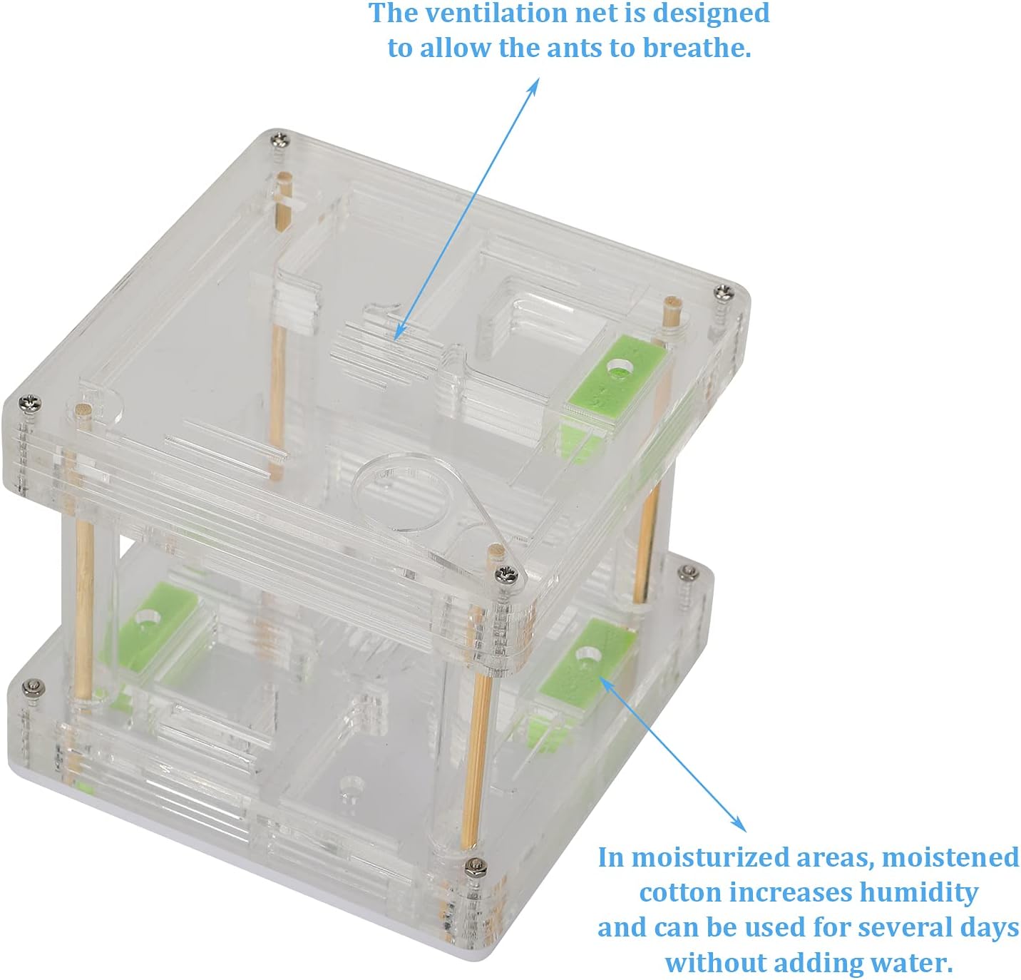 Facile da usare. Nella zona idratante è presente un cotone umidificante per aumentare l'umidità e può essere utilizzato per diversi giorni senza aggiungere acqua. Il design della rete di ventilazione consente alle formiche di respirare e l'ambiente di vita è più confortevole. Realizzato in materiale acrilico di alta qualità, con elevata durezza e alta trasparenza, è comodo da osservare. Ha un buon effetto sigillante per impedire la fuga delle formiche garantendo al tempo stesso la stabilità del formicaio. Il formicaio in acrilico è piccolo e squisito, che può essere utilizzato come giocattolo educativo per coltivare le abilità cognitive e pratiche dei bambini.