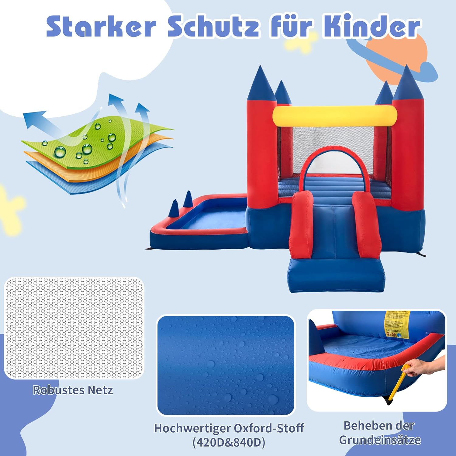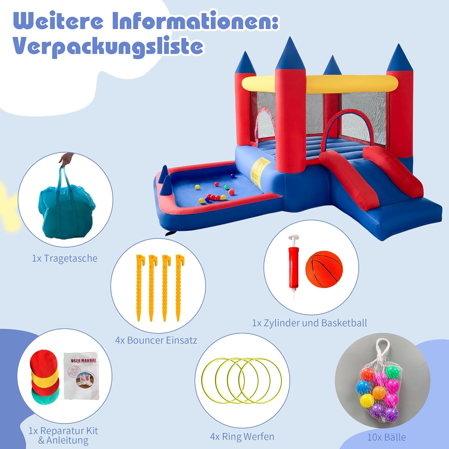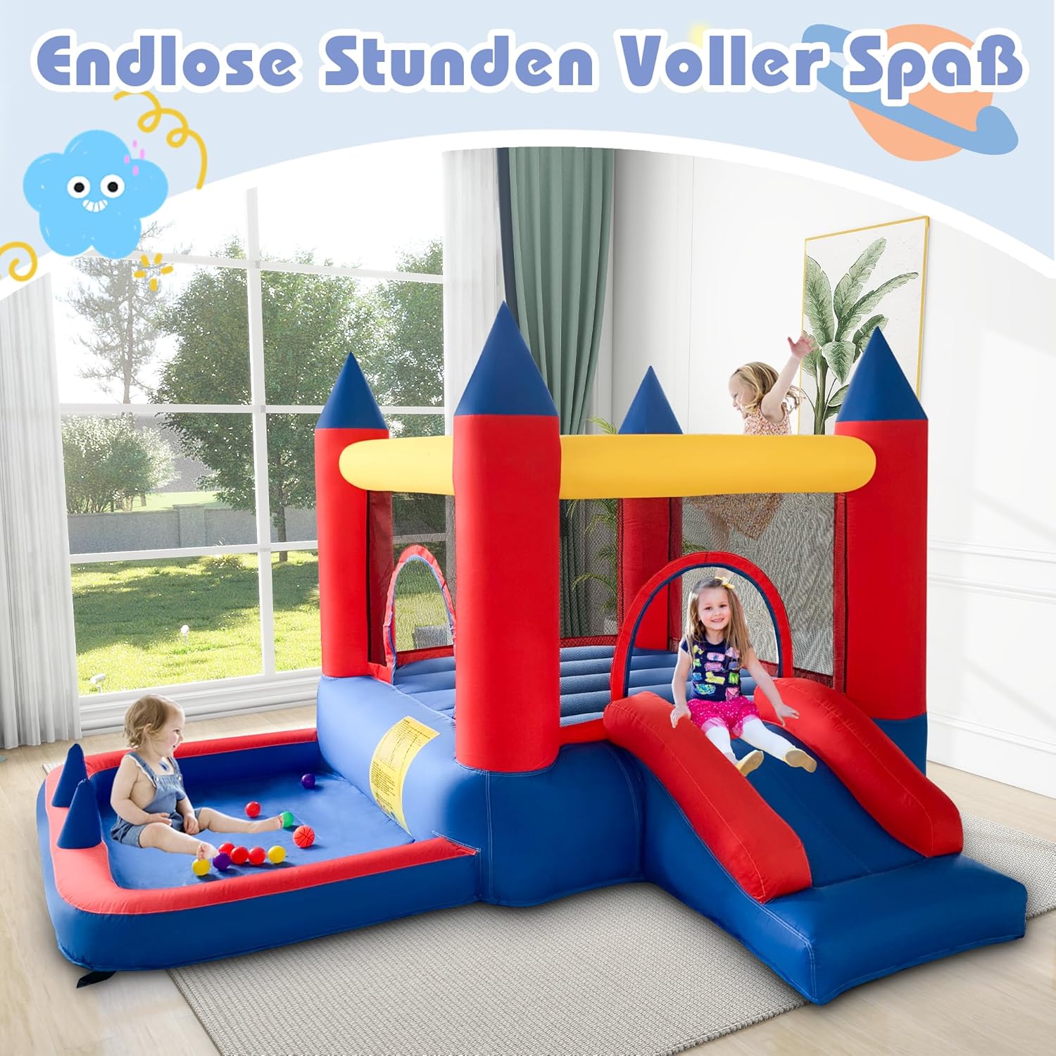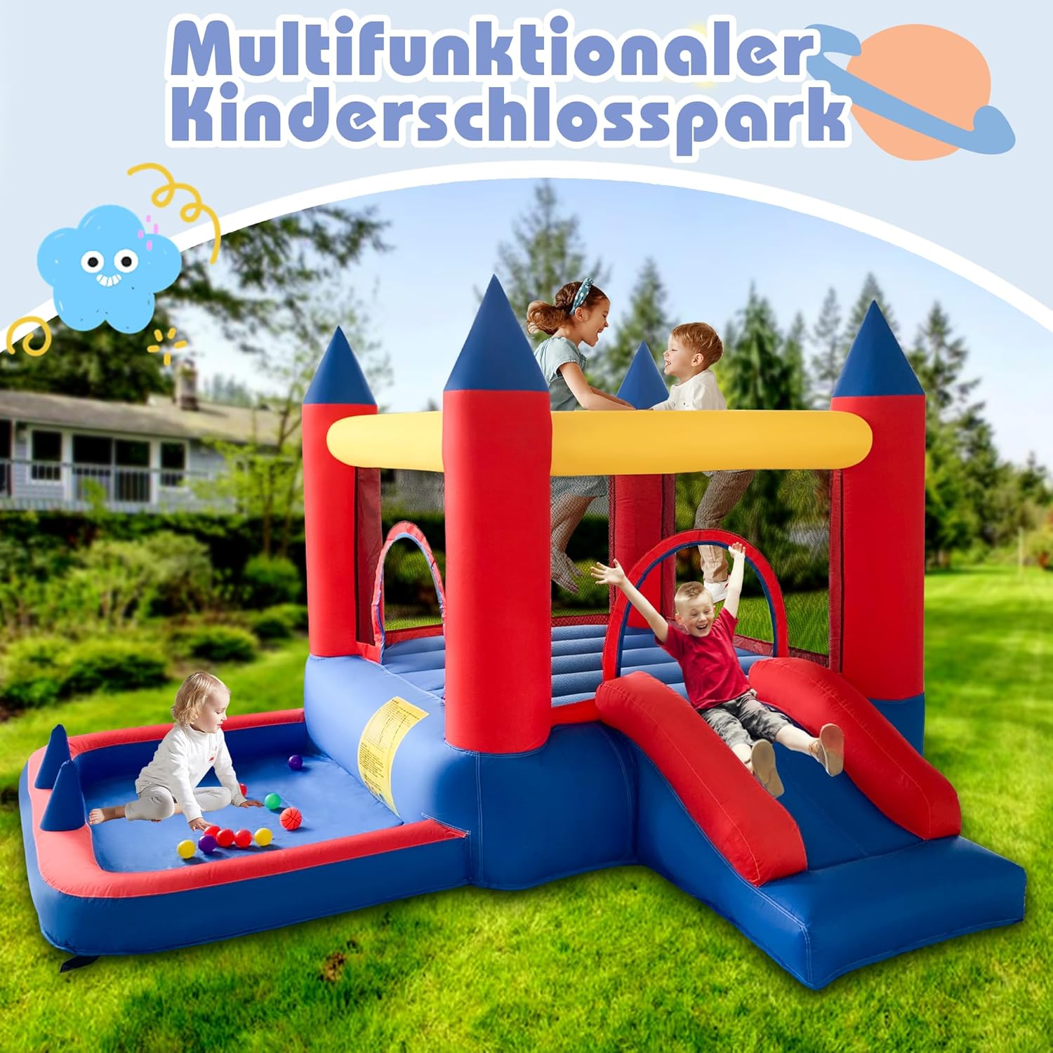 Divertimento combinato senza limiti: trampolino, grande scivolo gonfiabile, vasca con palline, gioco ad anello, ecc. Il nostro castello gonfiabile all'aperto offre la perfetta combinazione di intrattenimento e garantisce divertimento senza fine per i tuoi bambini. Materiale di alta qualità: il nostro castello gonfiabile per bambini è realizzato in tessuto Oxford 840D+420D. Le cuciture sono doppie e il tessuto rinforzato garantisce stabilità e longevità della superficie di salto. Grazie all'avanzata tecnologia di cucito, il nostro castello gonfiabile è estremamente robusto e durevole sia all'interno che all'esterno. Gonfiaggio rapido: grazie al dispositivo gonfiabile il castello gonfiabile per bambini può essere gonfiato completamente in soli 2 minuti. Dopo l'uso, il castello gonfiabile può essere rapidamente sgonfiato, piegato e riposto nella borsa portatile Kit completo di accessori: La casa gonfiabile viene fornita con tutto il necessario per l'uso immediato: un dispositivo gonfiabile, 4 picchetti, parti di riparazione, una borsa per il trasporto, 4 anelli da lancio e altri accessori di gioco come palloni da basket e pompe ad aria Rendi la tua infanzia indimenticabile: questo castello gonfiabile da esterno è il regalo perfetto per parenti, amici e vacanze. Scivoli emozionanti, piscine per bambini e ampie aree per saltare possono aiutare i bambini ad alleviare lo stress, a dimenticare TV e cellulari, a praticare sport e allo stesso tempo a migliorare la propria forma fisica