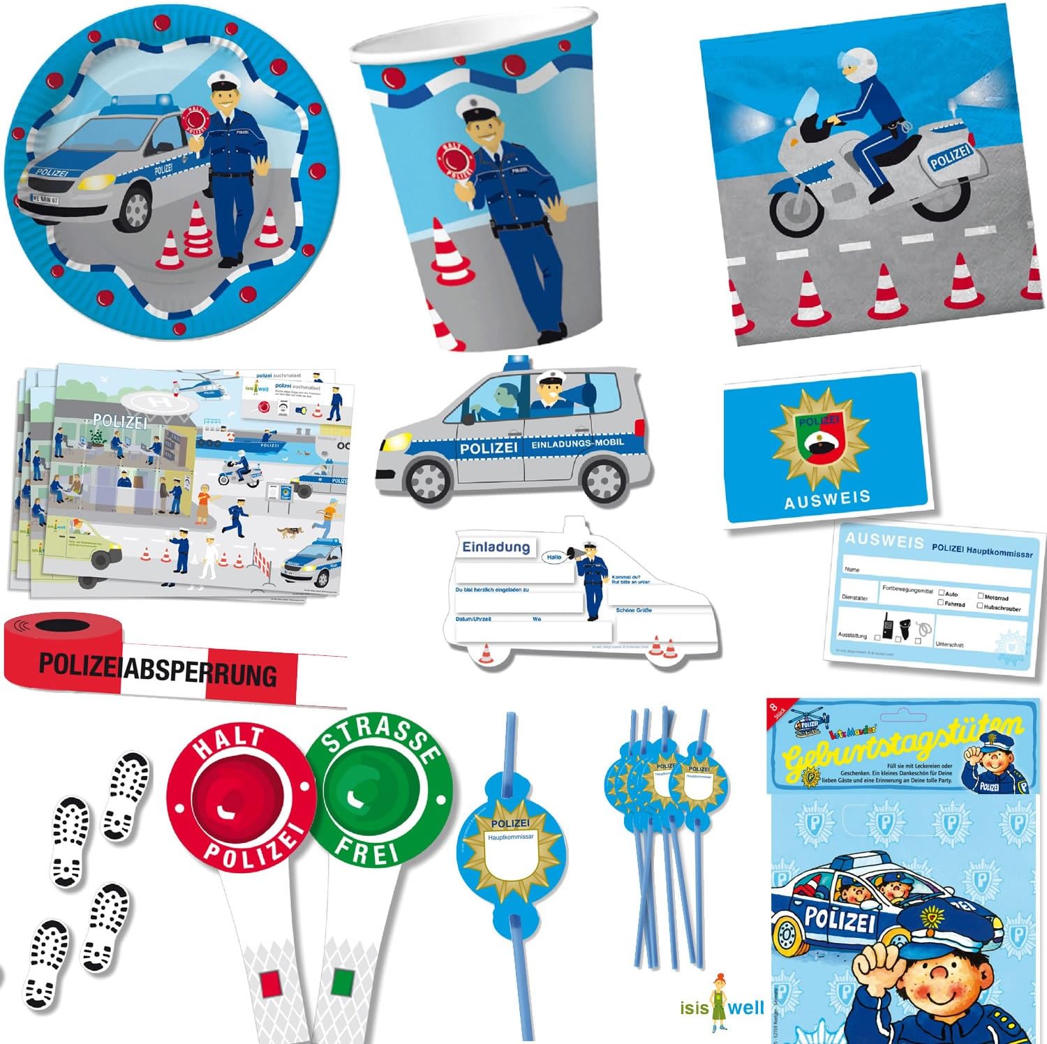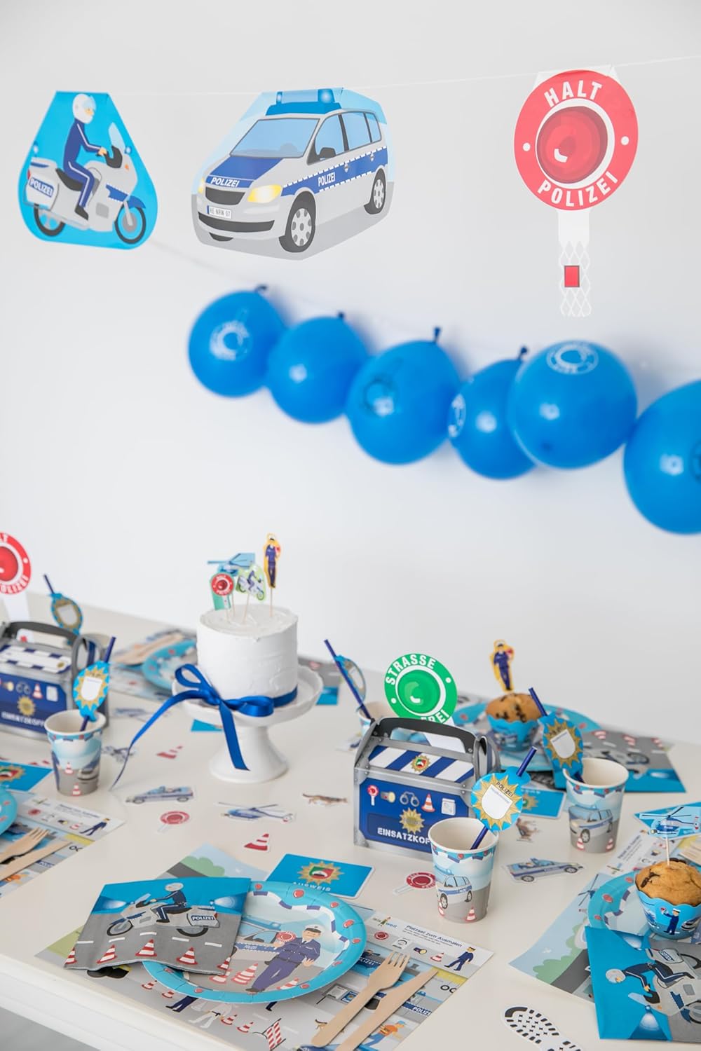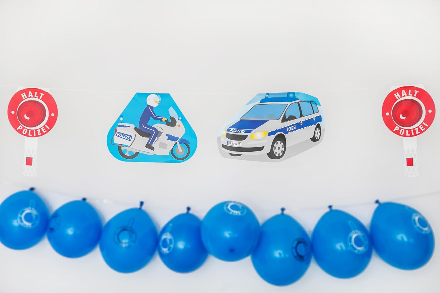 Fantastica catena di gagliardetti come decorazione per una festa a tema o un compleanno per bambini con il motto: POLIZIA Lunghezza: 3,5 m più cordino di fissaggio; con 10 gagliardetti e 4 motivi diversi; Materiale: carta stampata colorata accuratamente termoretraibile Produttore: DH-konzept (Germania) Per questa serie sono disponibili piatti, bicchieri, tovaglioli, cannucce, inviti, ghirlande, palloncini e sacchetti per feste abbinati * POLICE *