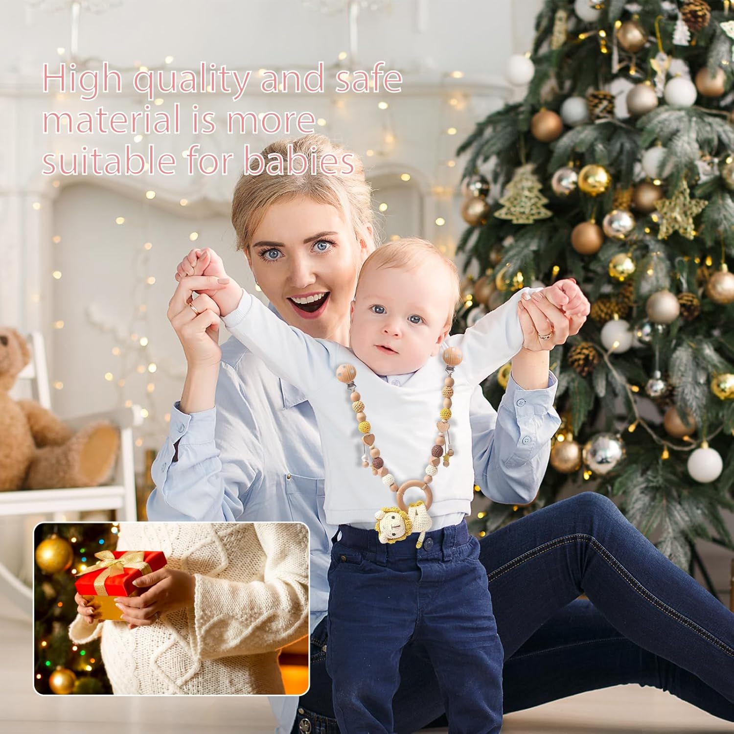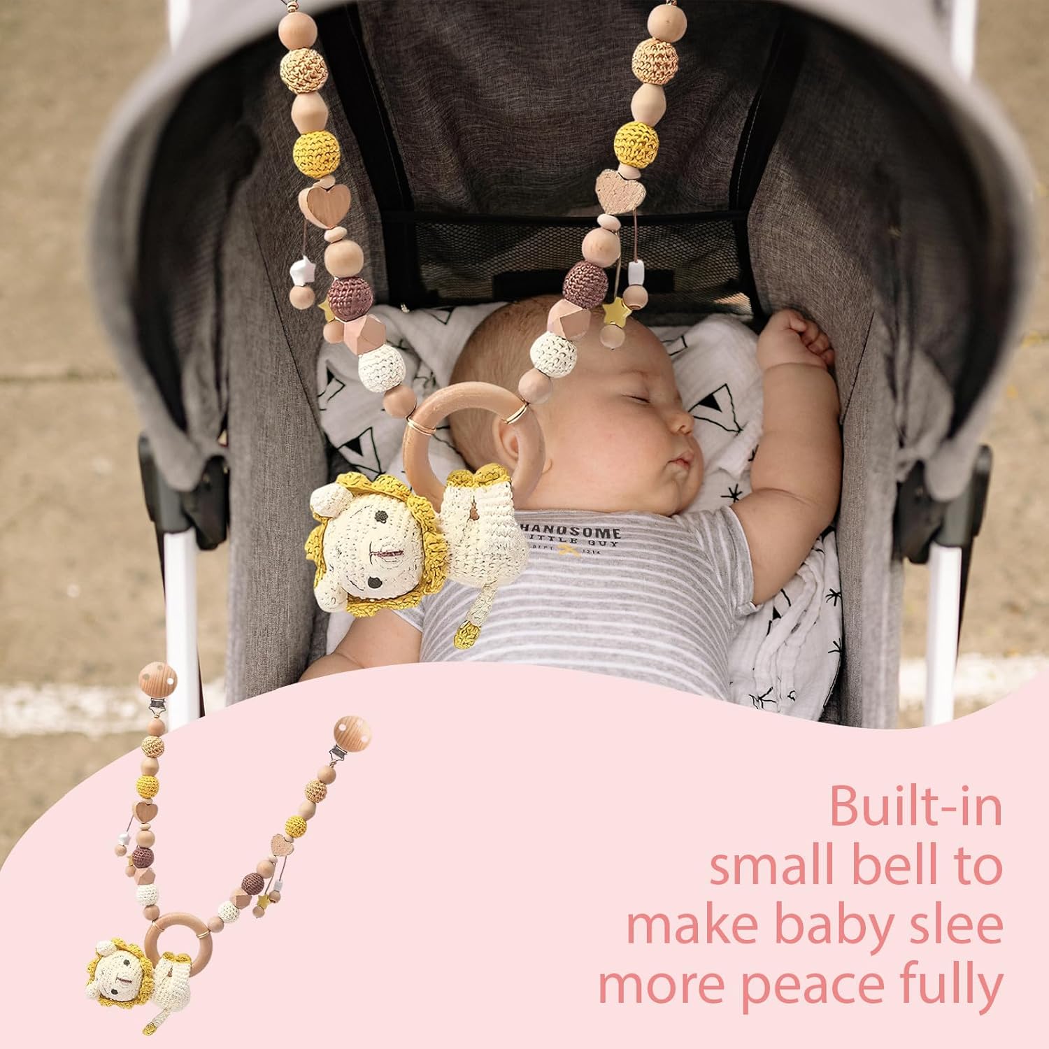Sicuro e di alta qualità: questa incantevole catena per passeggino in legno di faggio naturale e leone all'uncinetto fatto a mano è priva di BPA e garantisce un divertimento senza preoccupazioni per il tuo bambino, sostenibile e resistente. Design unico: il simpatico leone, perfetto per le mani dei bambini, è completato da ciondoli a forma di stella e perle. Un design naturale senza tempo che unisce stile e funzionalità e cattura l'attenzione del bambino. Suoni incantevoli: la catena per passeggino con campana integrata garantisce gioia e curiosità con i suoi toni delicati, una stimolazione ideale per i sensi del tuo bambino. Pratica e affidabile: grazie alle robuste clip in legno e acciaio inossidabile, la catena per passeggino può essere fissata in modo sicuro a passeggini, letti o box. In questo modo tutto rimane lì, anche in viaggio. Il regalo perfetto: per nascita, battesimo o baby shower, questa elegante catena per passeggino è il regalo ideale per genitori e bambini, che unisce funzionalità e fascino.
