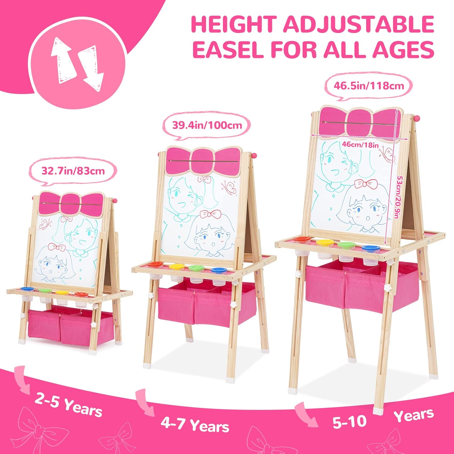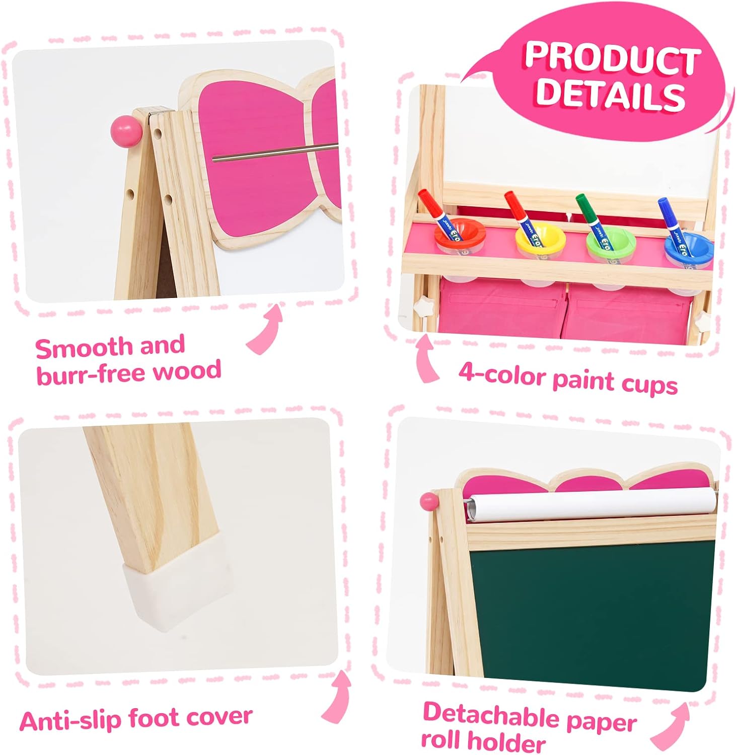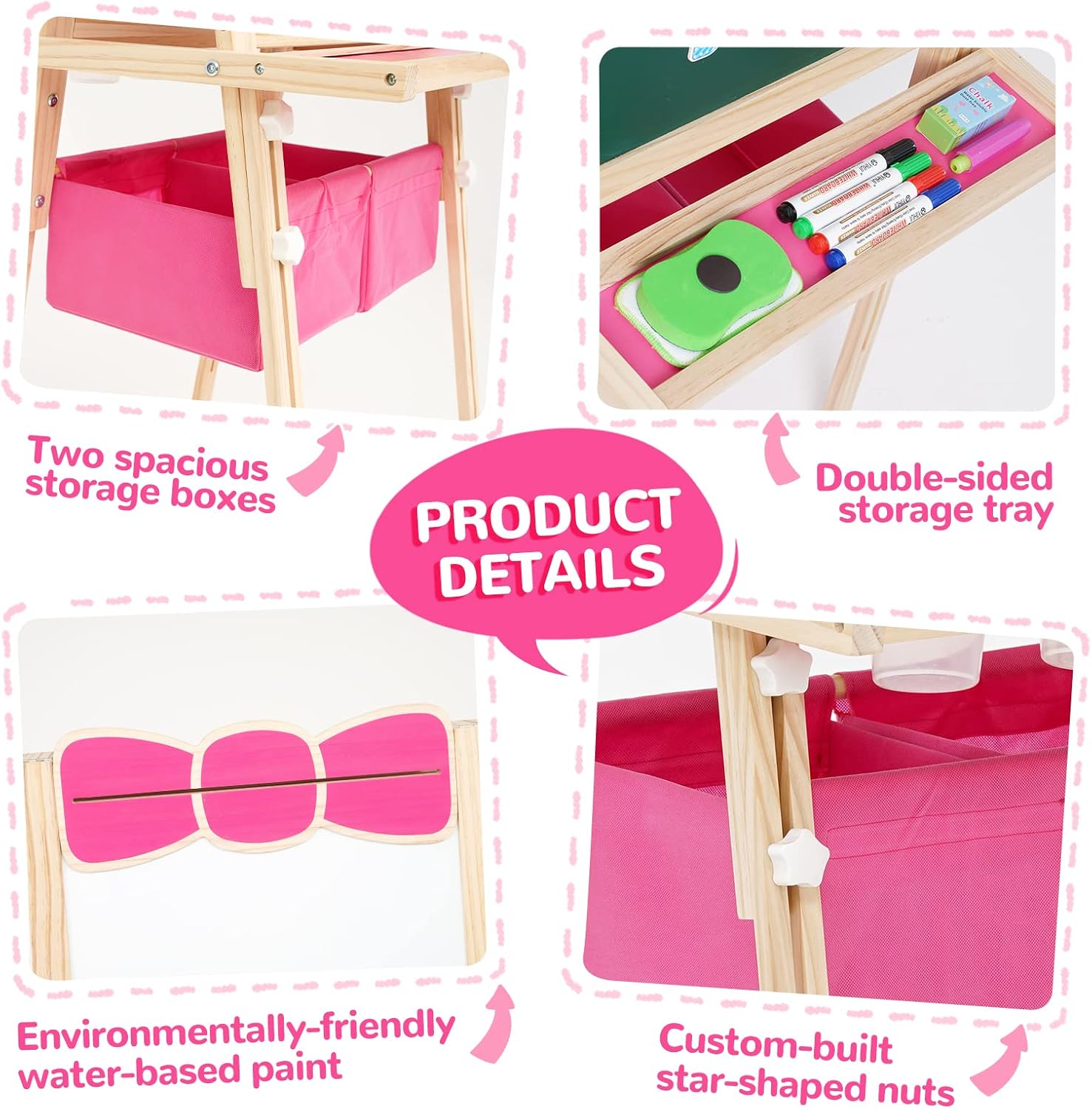 Cavalletto per Bambini 3 in 1: questo cavalletto verticale bifacciale è dotato di lavagna bianca, lavagna e rotolo di carta su entrambi i lati. I vostri bambini potranno disegnare non solo sulla lavagna con un gesso antipolvere, ma anche sulla lavagna bianca e sulla carta con una penna. La superficie della lavagna può essere utilizzata anche come gioco di matematica e lavagna didattica. I genitori possono usare adesivi con lettere e numeri per insegnare ai bambini la matematica di base e le lettere, permettendo ai vostri bambini di imparare divertendosi. Cavalletto Multifunzionale per Bambini: la confezione include diversi accessori: 48 adesivi colorati con lettere e numeri, 12 adesivi con animali, 4 barattoli di vernice, 6 adesivi rotondi, 1 gomma, 1 righello e 1 rotolo di carta. L'altezza del cavalletto può essere regolata da 83 cm a 118 cm, soddisfacendo le esigenze dei bambini nelle diverse fasi di crescita, dai 3 ai 10 anni. Lavagna Bianca e Lavagna per Bambini: il cavalletto artistico in legno tutto in uno per bambini presenta una superficie di alta qualità, liscia e senza sbavature. Cornice in legno. La struttura triangolare e i piedini antiscivolo garantiscono una presa sicura e la sicurezza dei bambini. La vernice a base d'acqua utilizzata è ecologica. Insieme ai dadi a forma di stella appositamente progettati, è completamente a misura di bambino. Cavalletto con Contenitori/Vassoio Portaoggetti e Contenitori per Colori: non preoccuparti che i tuoi bambini possano sporcare. Due grandi contenitori e due vassoi offrono al tuo bambino lo spazio ideale per riporre tutti i suoi materiali artistici e piccoli oggetti. Sono inclusi anche quattro contenitori per colori, così i tuoi bambini possono dipingere comodamente sulla carta. Regalo Educativo Perfetto: per Natale, compleanni o altre feste, il cavalletto in legno bifacciale con contenitore è il regalo perfetto per i bambini piccoli. Stimola la loro immaginazione e creatività e promuove il pensiero spaziale, il disegno e le abilità pratiche. Questo fantastico cavalletto educativo per bambini è ideale per imparare e studiare. Il grazioso design a forma di fiocco cattura immediatamente l'attenzione dei bambini.