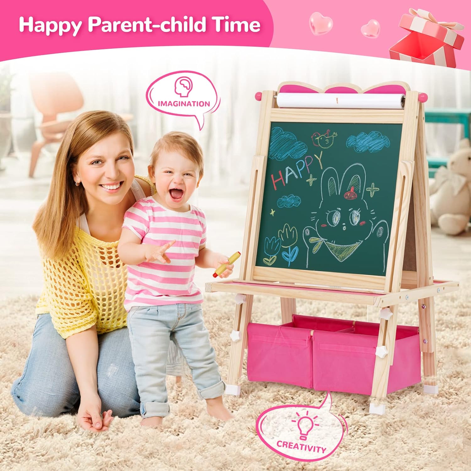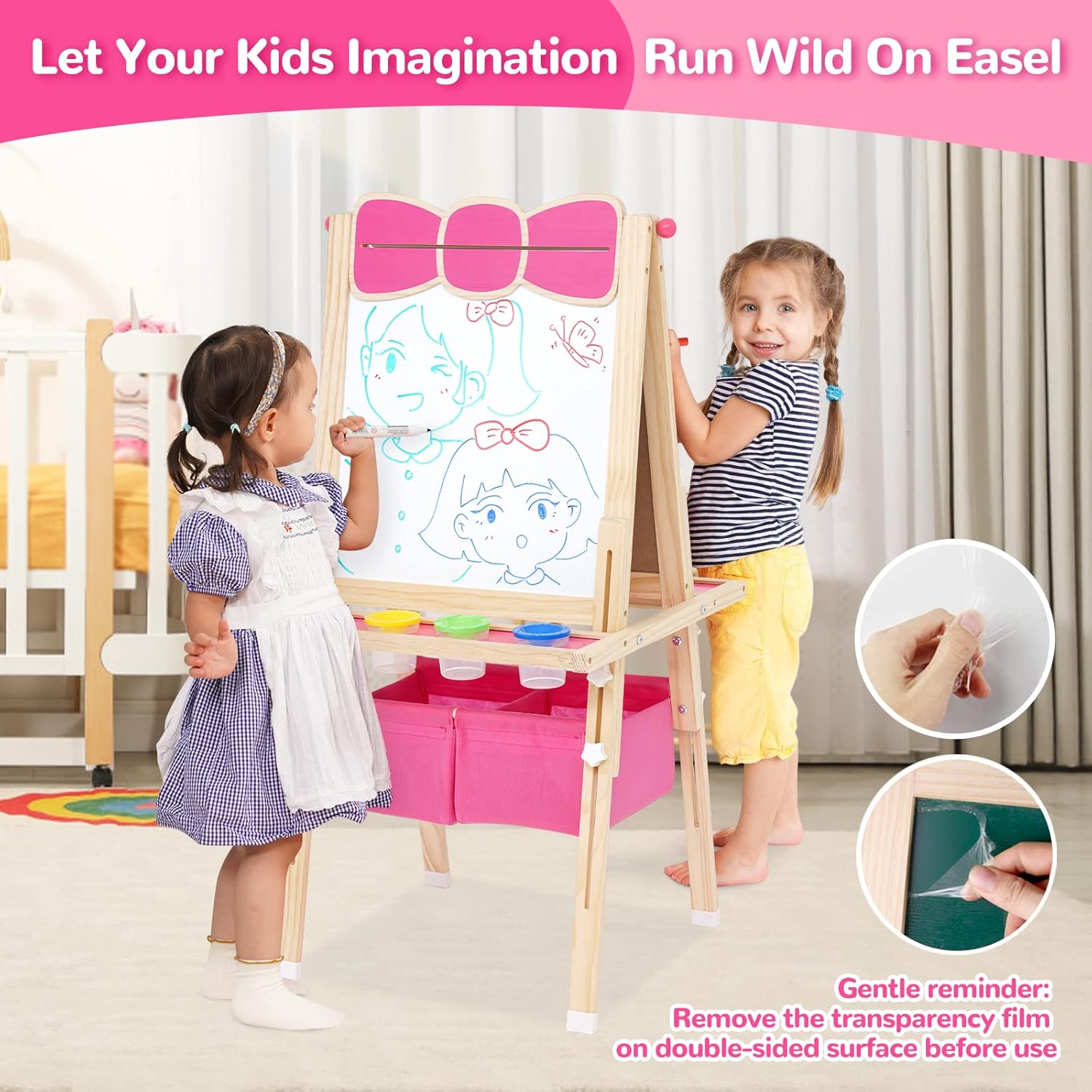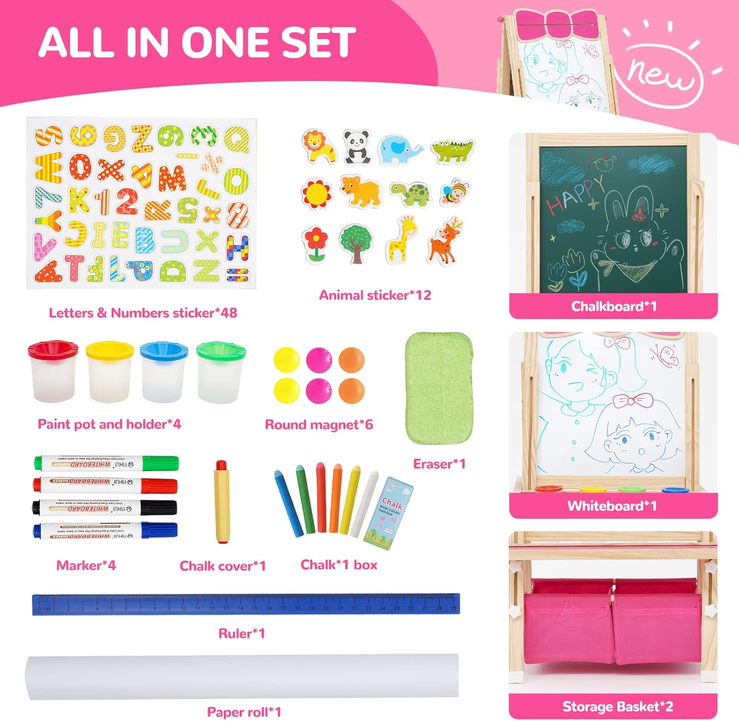 Cavalletto per Bambini 3 in 1: questo cavalletto verticale bifacciale è dotato di lavagna bianca, lavagna e rotolo di carta su entrambi i lati. I vostri bambini potranno disegnare non solo sulla lavagna con un gesso antipolvere, ma anche sulla lavagna bianca e sulla carta con una penna. La superficie della lavagna può essere utilizzata anche come gioco di matematica e lavagna didattica. I genitori possono usare adesivi con lettere e numeri per insegnare ai bambini la matematica di base e le lettere, permettendo ai vostri bambini di imparare divertendosi. Cavalletto Multifunzionale per Bambini: la confezione include diversi accessori: 48 adesivi colorati con lettere e numeri, 12 adesivi con animali, 4 barattoli di vernice, 6 adesivi rotondi, 1 gomma, 1 righello e 1 rotolo di carta. L'altezza del cavalletto può essere regolata da 83 cm a 118 cm, soddisfacendo le esigenze dei bambini nelle diverse fasi di crescita, dai 3 ai 10 anni. Lavagna Bianca e Lavagna per Bambini: il cavalletto artistico in legno tutto in uno per bambini presenta una superficie di alta qualità, liscia e senza sbavature. Cornice in legno. La struttura triangolare e i piedini antiscivolo garantiscono una presa sicura e la sicurezza dei bambini. La vernice a base d'acqua utilizzata è ecologica. Insieme ai dadi a forma di stella appositamente progettati, è completamente a misura di bambino. Cavalletto con Contenitori/Vassoio Portaoggetti e Contenitori per Colori: non preoccuparti che i tuoi bambini possano sporcare. Due grandi contenitori e due vassoi offrono al tuo bambino lo spazio ideale per riporre tutti i suoi materiali artistici e piccoli oggetti. Sono inclusi anche quattro contenitori per colori, così i tuoi bambini possono dipingere comodamente sulla carta. Regalo Educativo Perfetto: per Natale, compleanni o altre feste, il cavalletto in legno bifacciale con contenitore è il regalo perfetto per i bambini piccoli. Stimola la loro immaginazione e creatività e promuove il pensiero spaziale, il disegno e le abilità pratiche. Questo fantastico cavalletto educativo per bambini è ideale per imparare e studiare. Il grazioso design a forma di fiocco cattura immediatamente l'attenzione dei bambini.