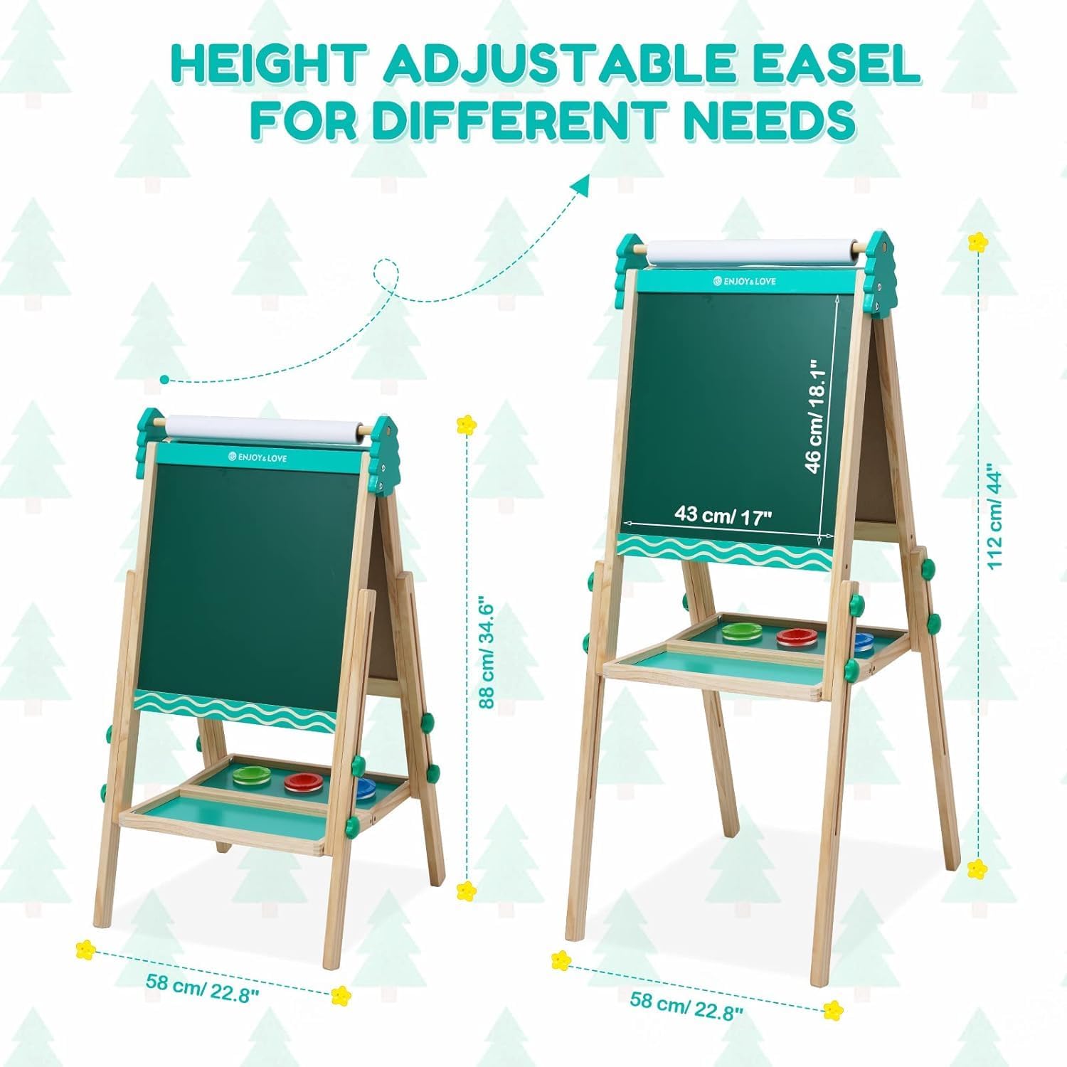 Cavalletto artistico tutto in 1: il cavalletto può essere ripiegato, il che lo rende molto facile da riporre e non occupa molto spazio. Cavalletto con vassoio e tazze di vernice, non c'è bisogno di preoccuparsi che i bambini rovinino la casa. Inoltre, la confezione include vari accessori per bambini. Altezza regolabile: l'altezza del cavalletto può essere regolata da 88 cm a 112 cm, per soddisfare le esigenze dei bambini in diverse età di crescita. Design su entrambi i lati: il cavalletto a doppia faccia viene fornito con lavagna bianca e lavagna che offrono spazio adeguato. Questo design permette a due bambini di giocare contemporaneamente. Inoltre, è dotato anche di rotolo di carta. I tuoi bambini possono disegnare su carta usando gli strumenti. Sicuro e amichevole: realizzato con materiali sicuri ed ecologici per garantire ai bambini il divertimento. La struttura robusta e durevole assicura che la tavola possa resistere all'uso dei bambini e accompagnarli attraverso il loro felice tempo creativo. Regalo ideale: per Natale, compleanno o altre feste, il cavalletto in legno a doppia faccia per bambini con contenitore è il regalo perfetto per i bambini piccoli. Può coltivare l'interesse dei bambini nel disegno stimolando la loro immaginazione e creatività.