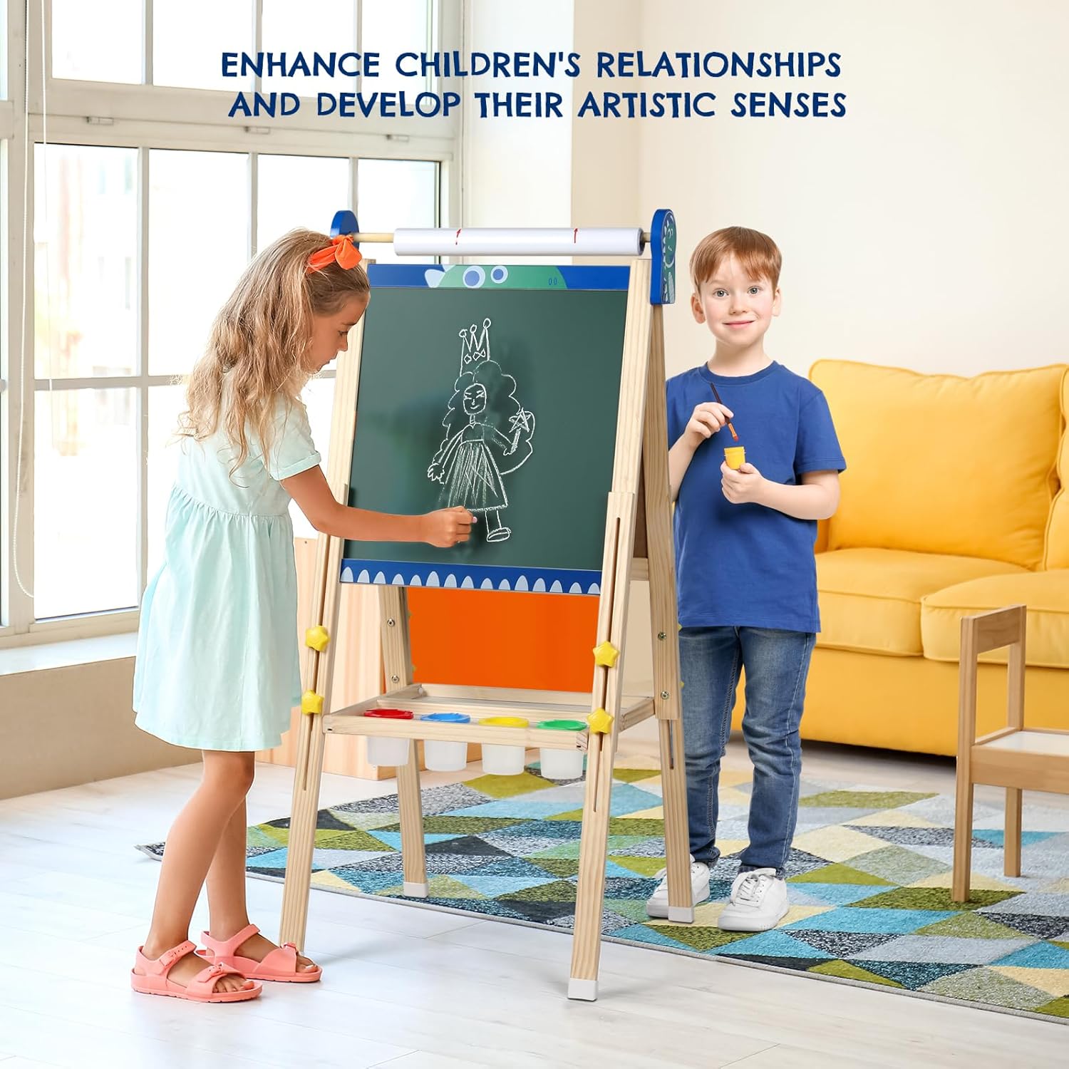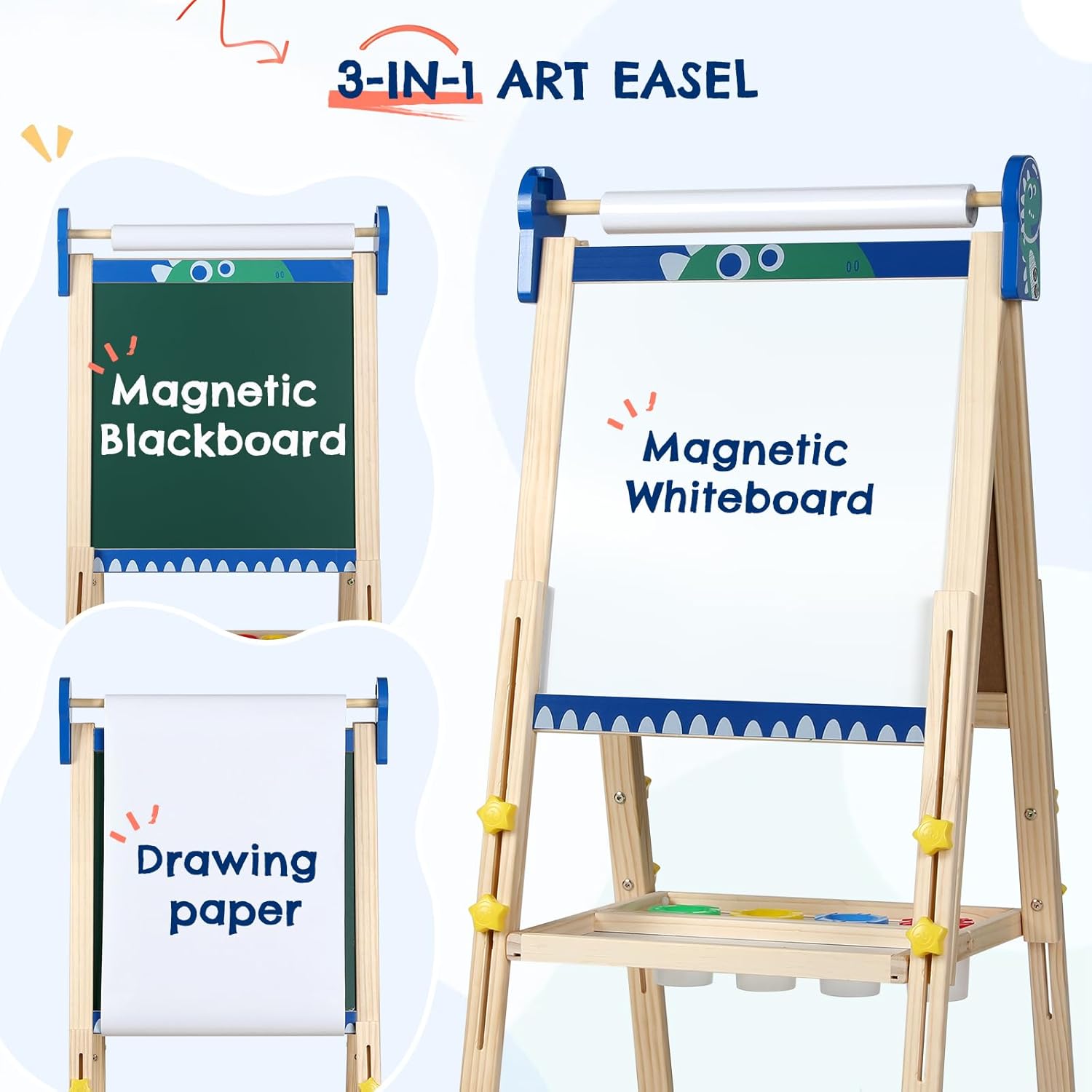 Design 3 in 1: lavagna e lavagna bianca, possono supportare 2 o più bambini per disegnare insieme, il nostro cavalletto artistico per bambini può essere utilizzato come lavagna con scrittura e creazione di gesso, anche la nostra lavagna è E il cavalletto artistico per bambini con un rotolo di carta, può essere fissato sulla lavagna o sulla lavagna magnetica sopra, con il cavalletto artistico per bambini incluso per creare come preferisci, che può migliorare il rapporto tra i bambini. Ricche forniture artistiche per bambini: 41 adesivi magnetici digitali e lettere, 12 magneti a forma di animali, 6 colori di gesso senza polvere (per disegnare sulla lavagna), 6 pennelli di diverse dimensioni ciascuno, 6 magneti di posizionamento, 6 matite con le dita, 4 scatole di vernice, 2 rotoli di carta da pittura, una gomma asciutta, un simpatico grembiule artistico realizzato in tessuto, una tavolozza di colori. Design magnetico interessante: la lavagna bianca a doppia faccia ha una funzione magnetica, più comoda per posizionare piccoli accessori magnetici sulla parte superiore della lavagna, riducendo notevolmente la possibilità di danni o perdita di accessori. Include tutti i pennelli da pittura, cancellini per lavagna e tutti i tipi di magneti. Il rullo di carta artistica può anche essere fissato saldamente al cavalletto del bambino utilizzando magneti rotondi. Design squisito: il cavalletto per bambini ha un ripiano sotto dove possono essere posizionati tutti i colori e i pennelli, che può consentire ai bambini di creare e giocare liberamente la loro arte e sviluppare la loro capacità di archiviazione. Facile da installare: l'installazione del cavalletto per bambini è progettata per essere molto semplice e viene fornita con istruzioni dettagliate che includono i metodi di installazione e l'introduzione dei prodotti allegati per garantire che sia possibile completare l'installazione in un periodo di tempo molto breve. La confezione viene fornita con un cacciavite esagonale per aiutarti a completare rapidamente l'installazione del cavalletto per bambini. Più salvaspazio: il cavalletto per bambini può essere piegato, può essere posizionato nella stanza dei bambini o nel soggiorno della cameretta dei bambini, può essere appoggiato alla parete o all'angolo del cavalletto per bambini. Idile non occupa spazio. Ampia gamma di età: l'altezza può essere regolata ruotando la manopola sul lato del cavalletto per bambini. Puoi realizzare la libertà di espansione e contrazione. Il più alto può arrivare fino a 14,8 m, adatto a tutte le età dei bambini per esplorare le proprie capacità artistiche e creative. Adatto per regali per bambini: il cavalletto per bambini è realizzato in puro legno di pino, naturale e sicuro senza odore. Siate certi che il bambino esprimerà la sua creatività artistica, il talento creativo, ispirerà la capacità di dipingere e la parte superiore potenziale ispirata del cavalletto per bambini è avvolta intorno ai bordi del trattamento per evitare che i bambini utilizzino il cavalletto per bambini nel processo di urti causati da lesioni, il fondo della staffa del cavalletto per bambini viene utilizzato anche nell'avvolto intorno ai bordi del design..