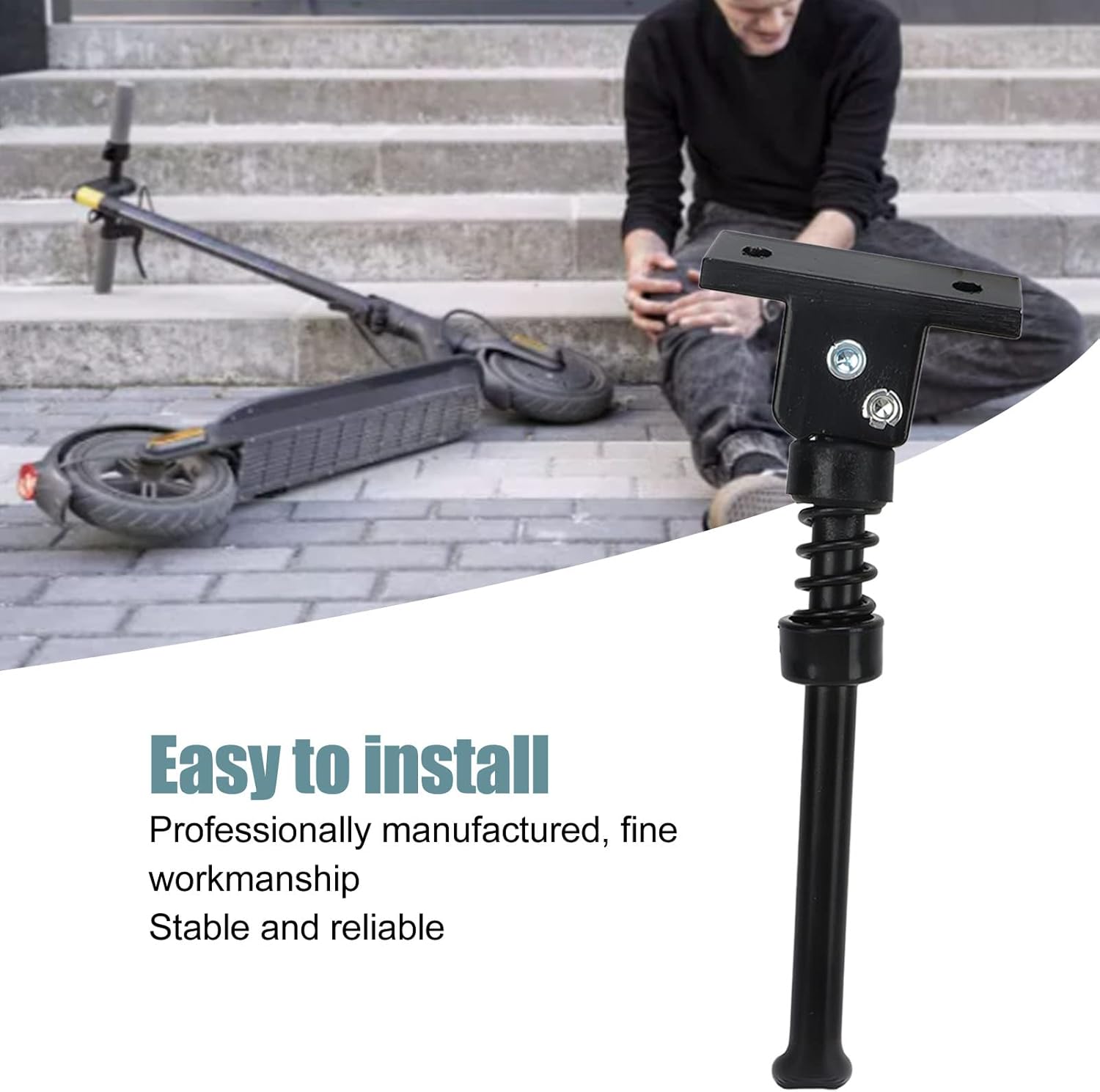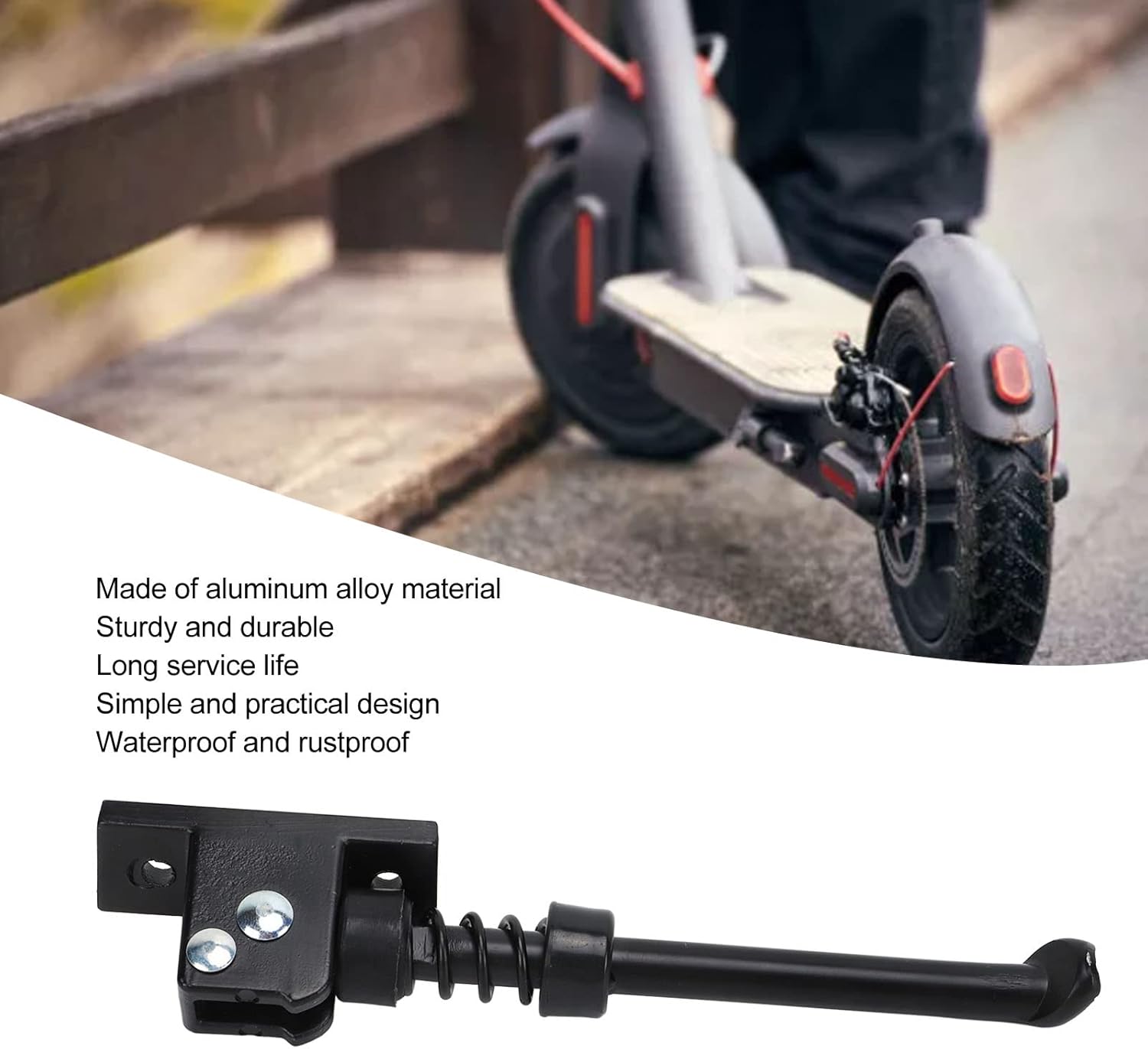 MATERIALE IN LEGA DI ALLUMINIO: il cavalletto per scooter elettrico è realizzato in materiale in lega di alluminio, resistente e robusto, impermeabile e antiruggine. FACILE DA INSTALLARE: il supporto per il parcheggio dello scooter elettrico è facile da installare e rimuovere, molto comodo da fissare sul fondo dello scooter, facile da usare. FACILE DA PARCHEGGIARE: il supporto per scooter elettrico semplifica il parcheggio e può essere parcheggiato su prati, supermercati, uffici e ovunque. FINE LAVORAZIONE: la staffa del cavalletto per scooter è ben realizzata, stabile e non graffierà il tuo scooter elettrico. LUNGA DURATA: il supporto del piede dello scooter elettrico è stabile, con una lunga durata, quindi non devi preoccuparti della qualità.