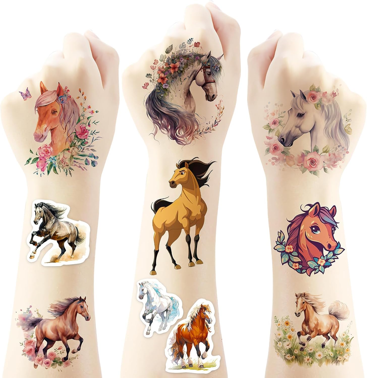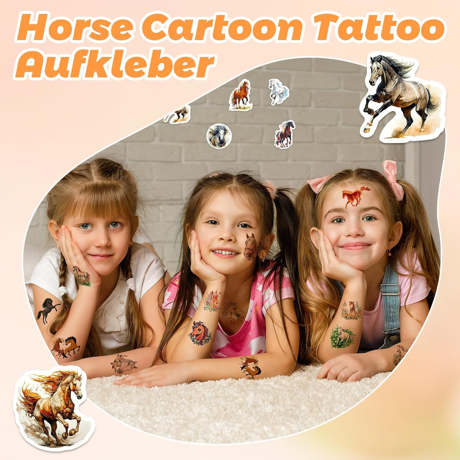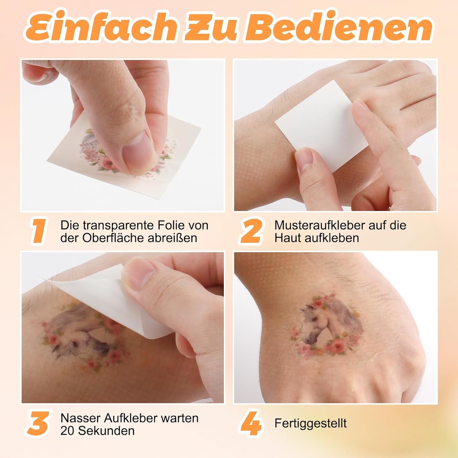 Set per sviluppare il mondo creativo del vostro bambino: questo set di tatuaggi per cavalli contiene 20 diversi design tra cui i bambini possono scegliere e combinare liberamente a piacimento – oggi un cavallo al galoppo, domani un puledro vivace. Con i diversi motivi potrete dare libero sfogo alla vostra creatività ed esprimere la propria personalità sul polso e sulle spalle. Delicato sulla pelle e resistente: i bambini si divertono a giocare: questi tatuaggi temporanei sono realizzati con materiali ecologici, sicuri e non irritanti e particolarmente delicati sulla pelle sensibile dei bambini. Non solo aderiscono bene e non si staccano facilmente, ma sono anche resistenti all'acqua e al sudore. Anche quando i bambini giocano selvaggiamente e sudano o entrano in contatto con l'acqua, rimangono stabili "al loro posto", in modo che i bambini possano godere della gioia del tatuaggio e durare più a lungo. Facile da applicare e da utilizzare: facile da rimuovere: scegliere un motivo, rimuovere la pellicola protettiva e incollarla nel punto desiderato. Premere sulla carta di supporto per 30 secondi con un panno umido e poi staccare delicatamente – fatto! Se vuoi cambiare il soggetto è molto semplice: con olio per bambini, alcol o olio d'oliva è facile da rimuovere, così anche i bambini possono farlo da soli, comodo e pratico! Durevole e resistente all'abrasione: questi adesivi non sono solo impermeabili e resistenti all'abrasione, ma durano anche da 4 a 6 giorni. La durata esatta dipende dalla frequenza di pulizia e dal luogo in cui sono attaccati, ma è sufficiente affinché i bambini possano usarli dalla festa alla vita di tutti i giorni e godere di questa piccola sorpresa più a lungo. L'accessorio perfetto per le feste: garantisce un sacco di divertimento con i bambini: sia che si tratti di creare l'atmosfera divertente per feste di compleanno per bambini, foto creative, costumi di Halloween, feste di uova di Pasqua o travestimenti di Natale, questo accessorio è sempre con te! Si applica facilmente su braccia, gambe, schiena, spalle e persino sulle guance e trasforma i bambini nelle piccole stelle più belle in un batter d'occhio.