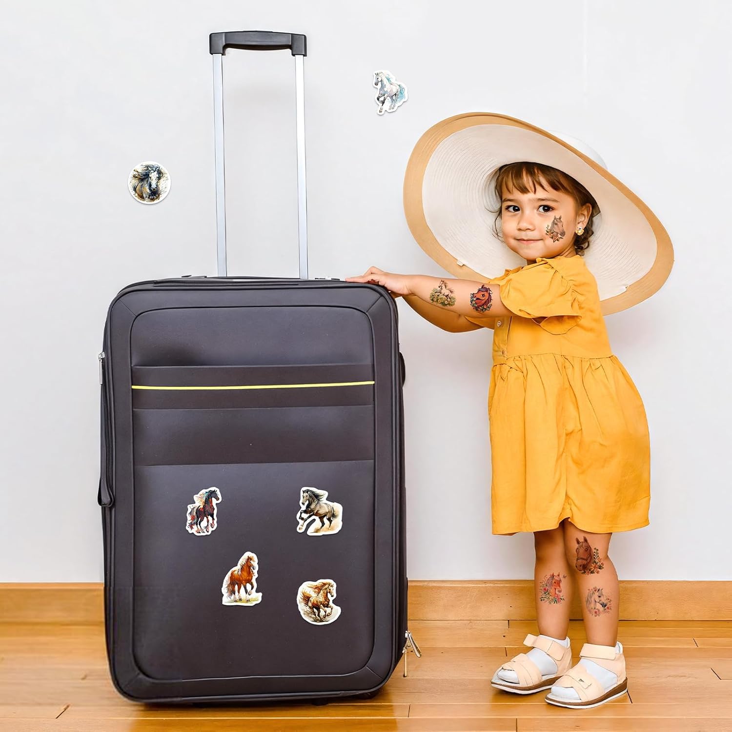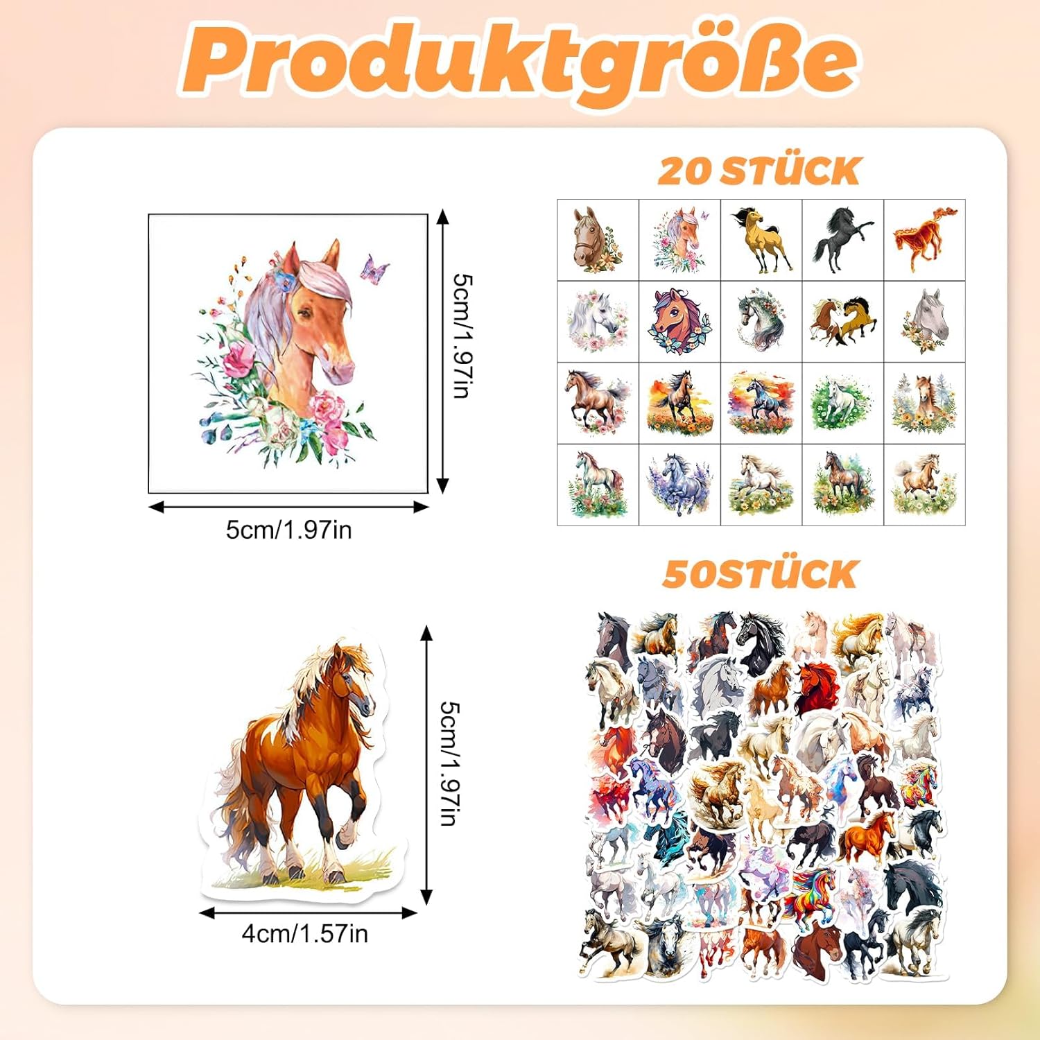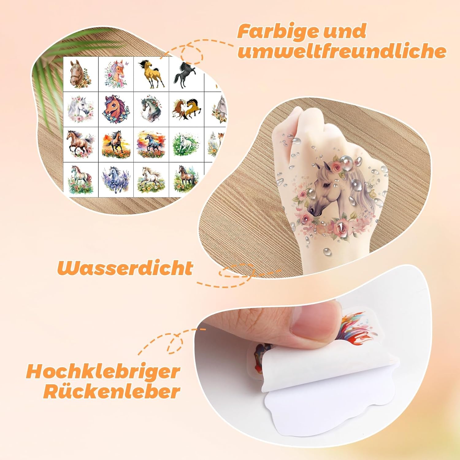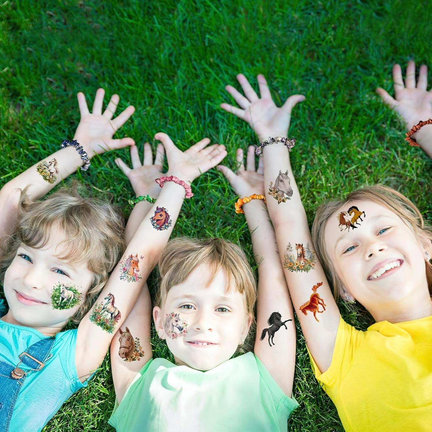 Set per sviluppare il mondo creativo del vostro bambino: questo set di tatuaggi per cavalli contiene 20 diversi design tra cui i bambini possono scegliere e combinare liberamente a piacimento – oggi un cavallo al galoppo, domani un puledro vivace. Con i diversi motivi potrete dare libero sfogo alla vostra creatività ed esprimere la propria personalità sul polso e sulle spalle. Delicato sulla pelle e resistente: i bambini si divertono a giocare: questi tatuaggi temporanei sono realizzati con materiali ecologici, sicuri e non irritanti e particolarmente delicati sulla pelle sensibile dei bambini. Non solo aderiscono bene e non si staccano facilmente, ma sono anche resistenti all'acqua e al sudore. Anche quando i bambini giocano selvaggiamente e sudano o entrano in contatto con l'acqua, rimangono stabili "al loro posto", in modo che i bambini possano godere della gioia del tatuaggio e durare più a lungo. Facile da applicare e da utilizzare: facile da rimuovere: scegliere un motivo, rimuovere la pellicola protettiva e incollarla nel punto desiderato. Premere sulla carta di supporto per 30 secondi con un panno umido e poi staccare delicatamente – fatto! Se vuoi cambiare il soggetto è molto semplice: con olio per bambini, alcol o olio d'oliva è facile da rimuovere, così anche i bambini possono farlo da soli, comodo e pratico! Durevole e resistente all'abrasione: questi adesivi non sono solo impermeabili e resistenti all'abrasione, ma durano anche da 4 a 6 giorni. La durata esatta dipende dalla frequenza di pulizia e dal luogo in cui sono attaccati, ma è sufficiente affinché i bambini possano usarli dalla festa alla vita di tutti i giorni e godere di questa piccola sorpresa più a lungo. L'accessorio perfetto per le feste: garantisce un sacco di divertimento con i bambini: sia che si tratti di creare l'atmosfera divertente per feste di compleanno per bambini, foto creative, costumi di Halloween, feste di uova di Pasqua o travestimenti di Natale, questo accessorio è sempre con te! Si applica facilmente su braccia, gambe, schiena, spalle e persino sulle guance e trasforma i bambini nelle piccole stelle più belle in un batter d'occhio.