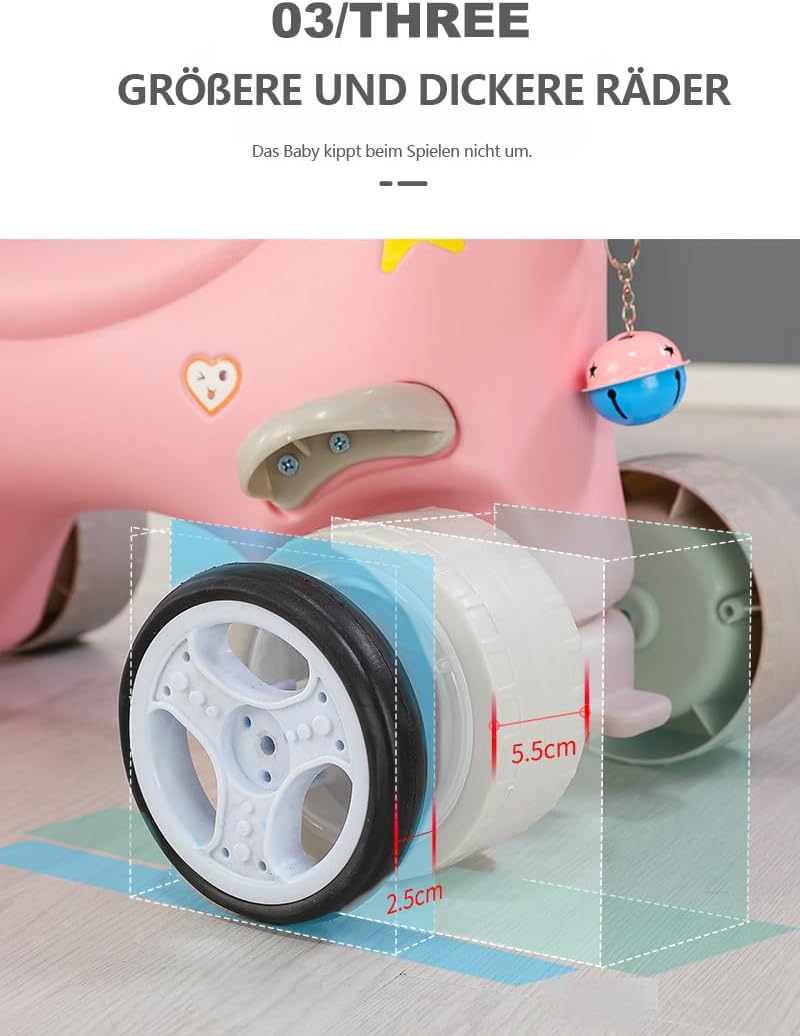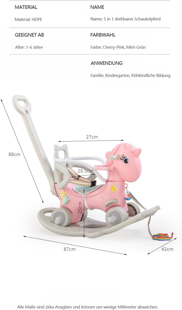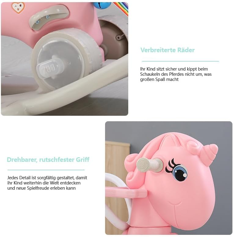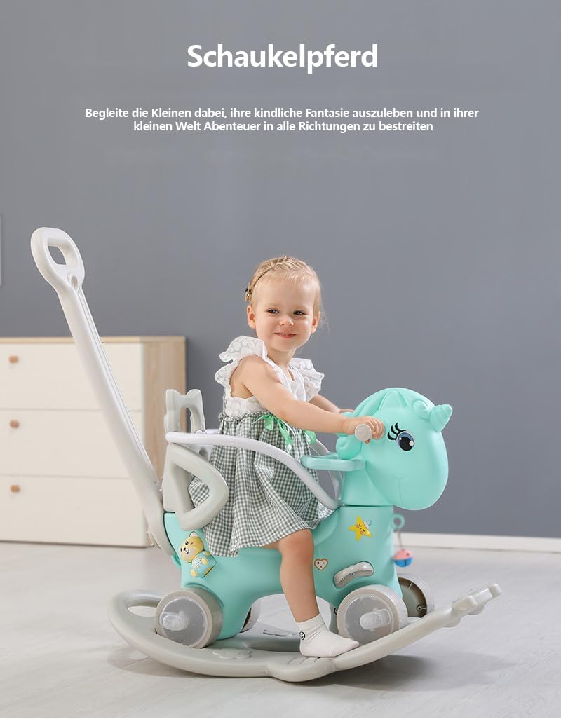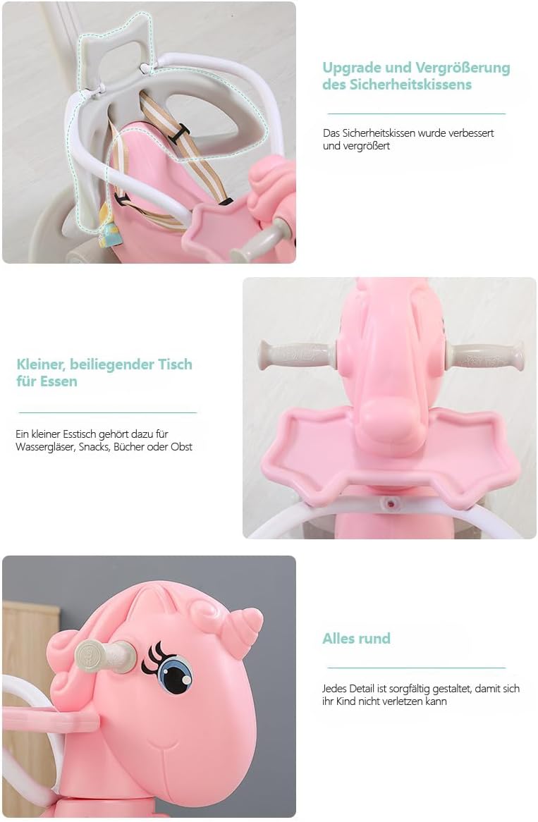 DESIGN: Cavallo a dondolo di alta qualità in plastica con dimensioni di 87 x 88 x 42 cm, disponibile in turchese e rosa, ideale per bambini da 1 a 4 anni CARATTERISTICHE DI SICUREZZA: Piastra di base allargata (76x40 cm) con ruote rinforzate e cintura di sicurezza integrata per la massima stabilità MULTIFUNZIONE: Pratica maniglia di spinta per i genitori, può essere utilizzata sia come classico cavallo a dondolo che come veicolo da cavalcare COMFORT: Maniglia girevole e antiscivolo e bordi arrotondati per la sicurezza e gioco confortevole ATTREZZATURA AGGIUNTIVA: tavolino integrato per bevande, snack o giocattoli, perfetto per un divertimento più lungo