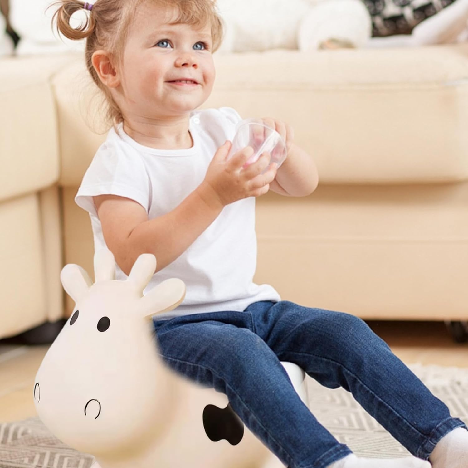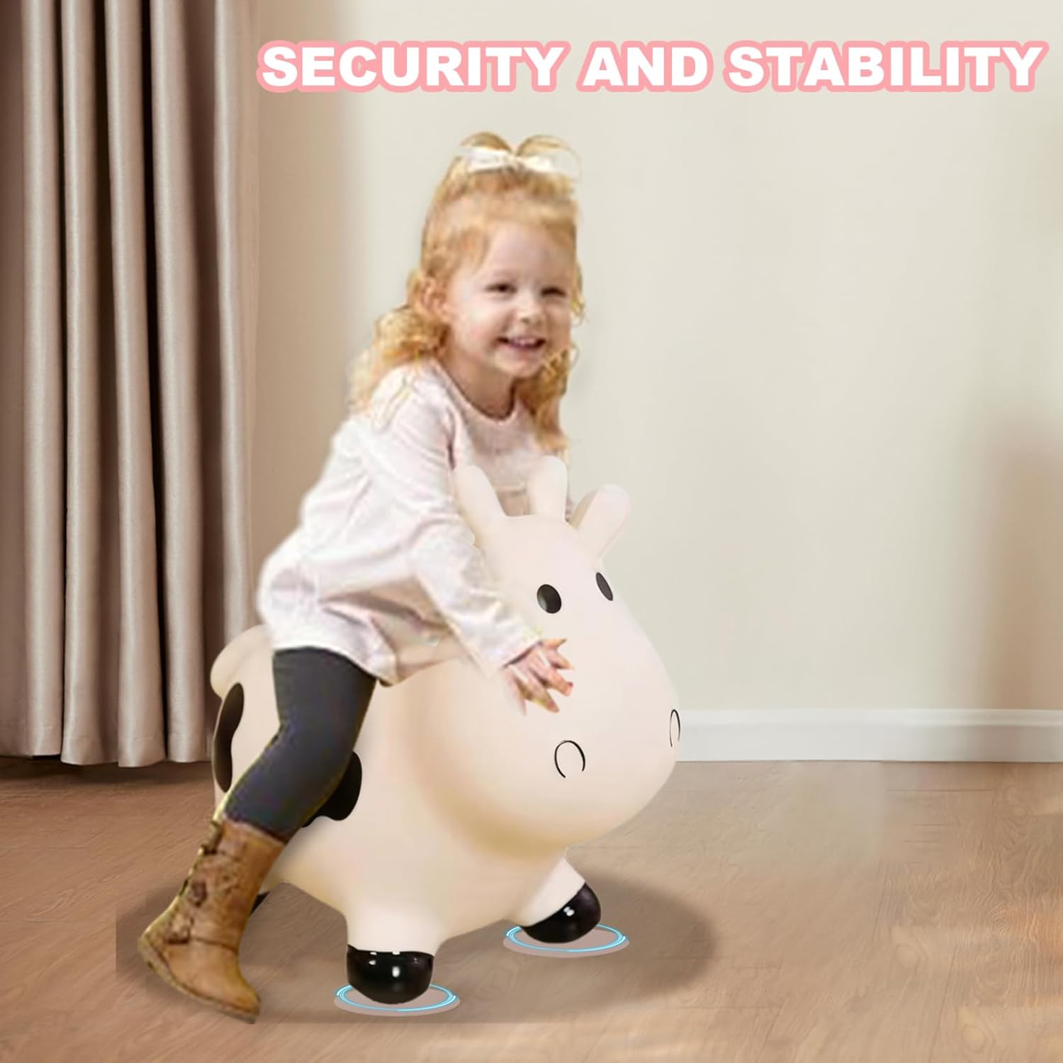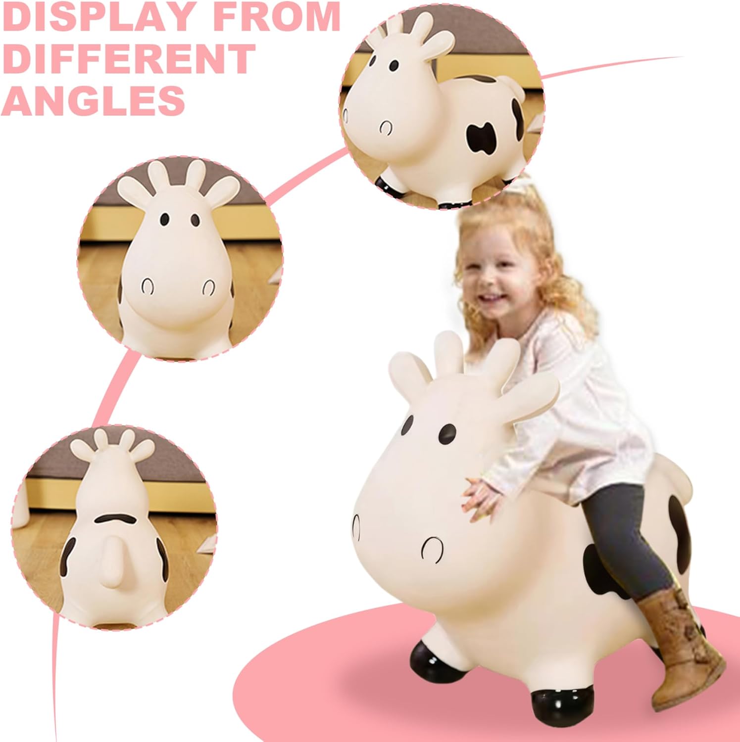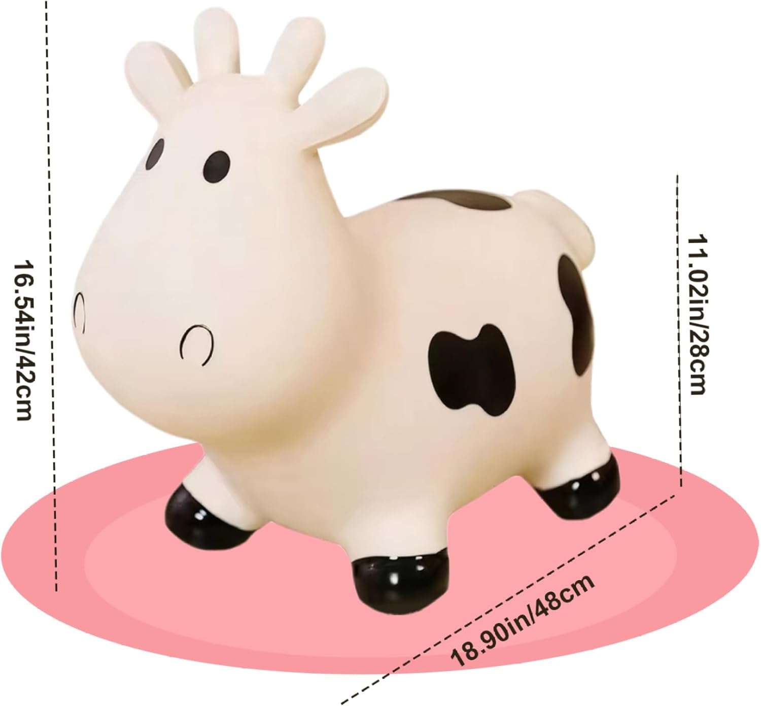 Perfetto: rende fantastico un compleanno o una vacanza per i più piccoli. Sicuramente porterà sorrisi e infinite ore di gioia al piccolo e incoraggerà l'immaginazione e l'attività fisica. Design adorabile: questa mucca gonfiabile è progettata per deliziare i bambini con il suo aspetto animale carino e amichevole, rendendola una compagna di giochi affidabile per il divertimento indoor e outdoor. Gonfiaggio facile: questa mucca rimbalzante consente un rapido gonfiaggio con una pompa ad aria (non inclusa) e uno sgonfiaggio. Basta rimuovere il tappo dell'aria, inserire la pompa, gonfiare alla dimensione desiderata e sostituire il tappo. È portatile e comodo da riporre quando non in uso, perfetto per parchi o appuntamenti di gioco. Tempo di gioco attivo: questi animali gonfiabili incoraggiano il gioco attivo e aiutano a sviluppare le capacità motorie mentre i bambini saltano e rimbalzano. I nostri animali gonfiabili sono ideali per migliorare l'equilibrio e la coordinazione in modo divertente e coinvolgente. Sicura e stabile: questa mucca che rimbalza è realizzata con materiali in PVC di alta qualità e garantisce un ambiente di gioco sicuro per i bambini dai 18 mesi in su. È abbastanza robusto da gestire sessioni di gioco attive.