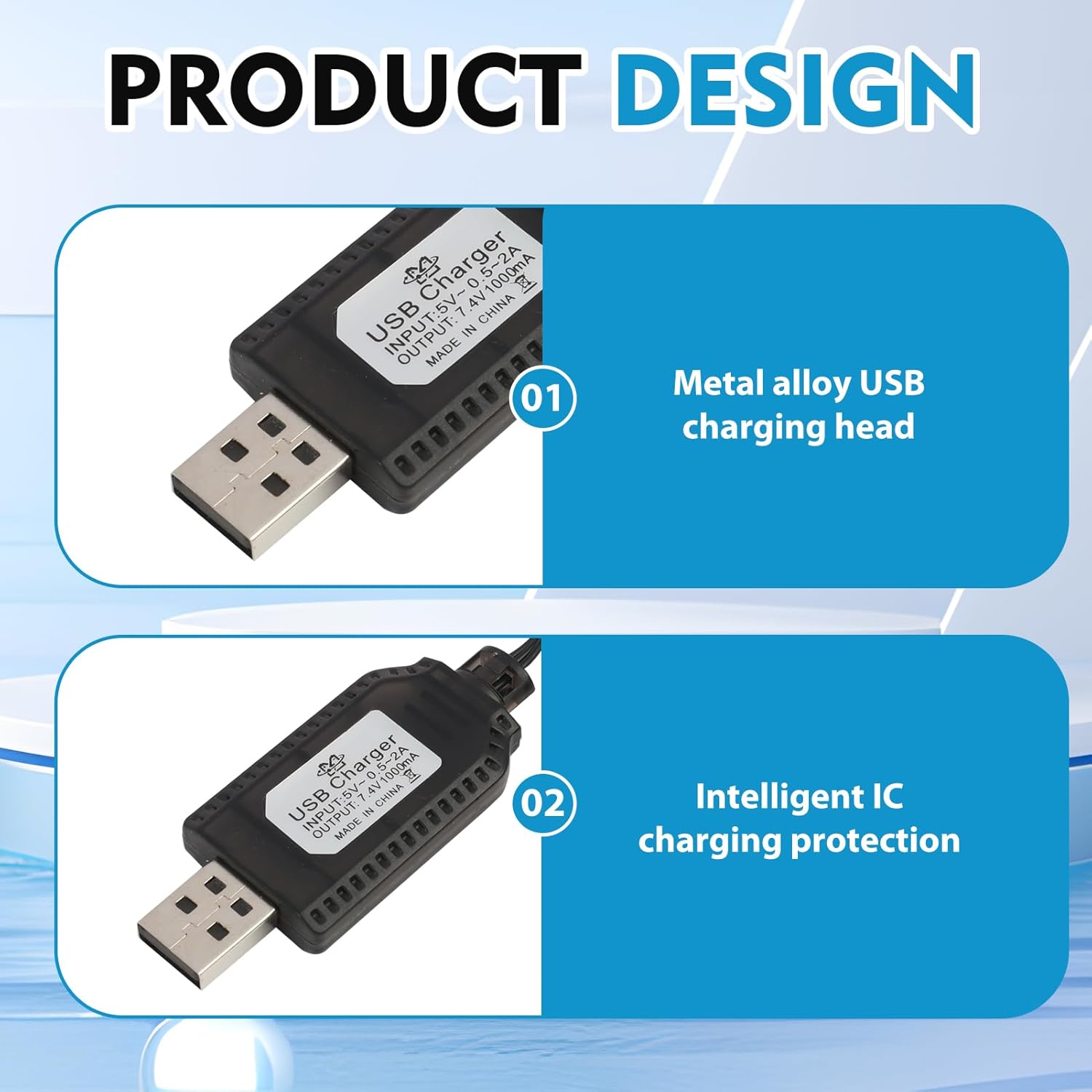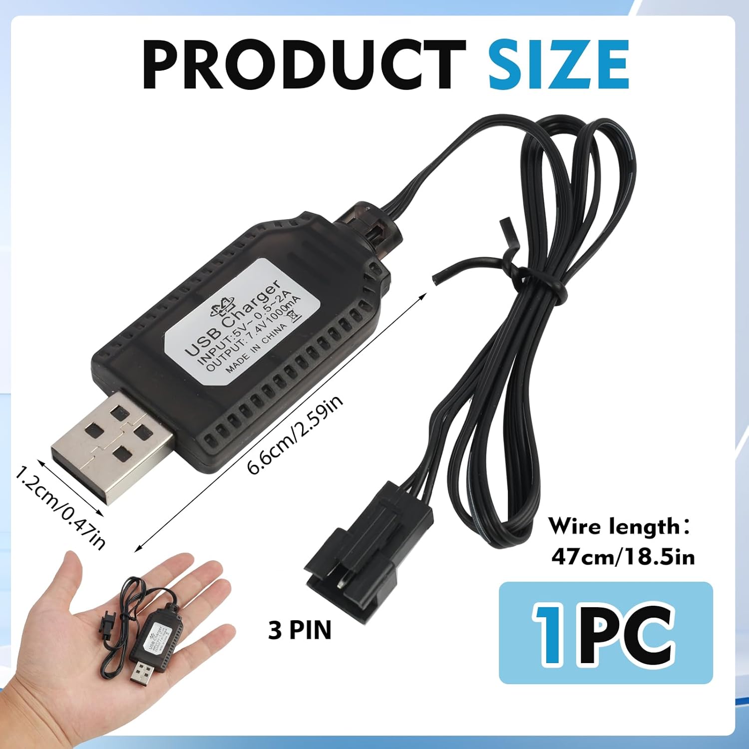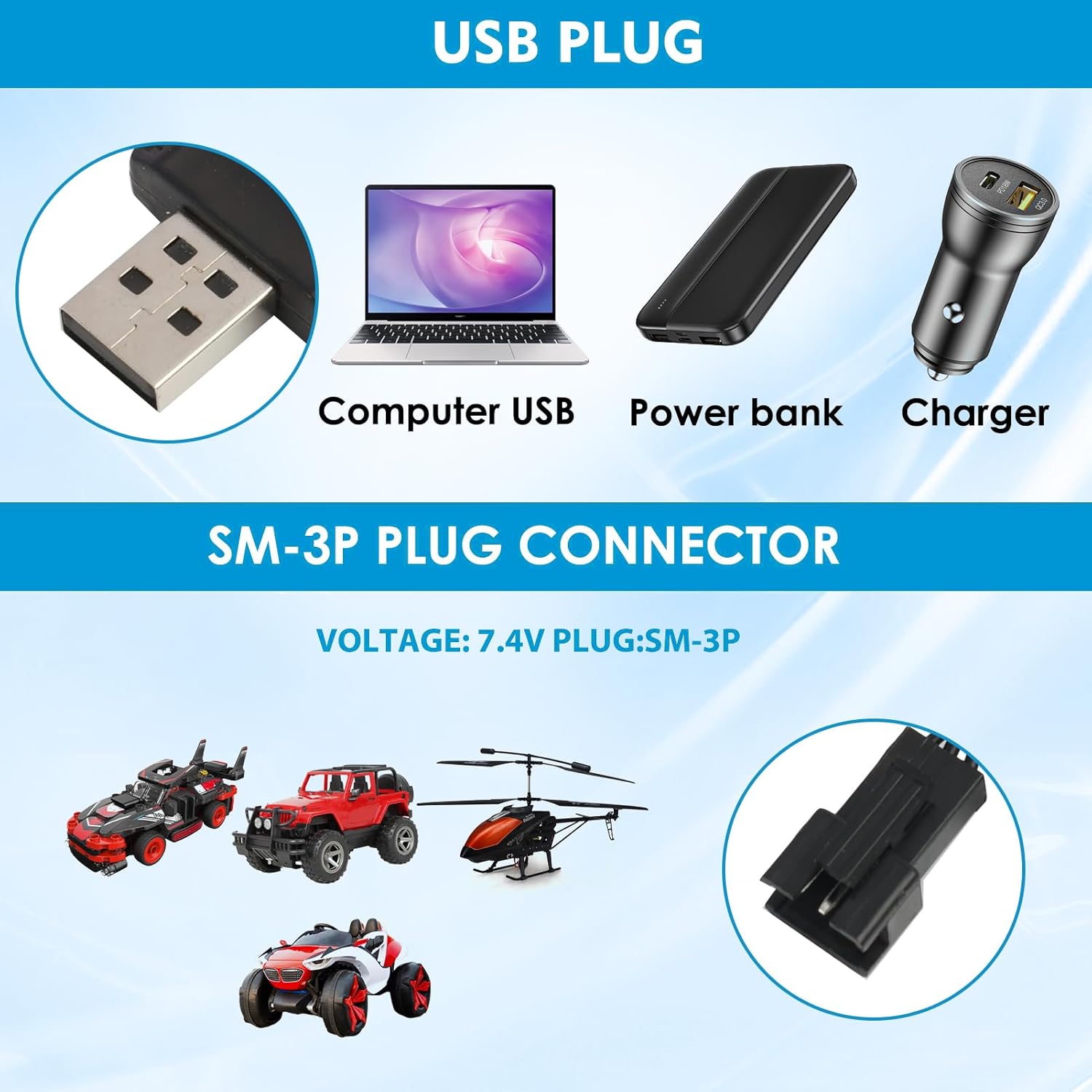 Compatibilità Specifica: Progettato esclusivamente per batterie LiPo 2S da 7,4V, questo cavo caricabatterie USB è dotato di connettore SM-3P, garantendo una compatibilità universale con una vasta gamma di dispositivi RC, inclusi auto, barche, droni e aerei. Sicurezza Avanzata: Dotato di protezioni integrate contro sovratensioni, sovraccarichi e cortocircuiti, questo cavo offre una carica sicura e affidabile. Assicurati che la tensione di 7,4V sia compatibile con il tuo dispositivo prima dell'uso per evitare danni. Indicatori LED Intuitivi: Monitora facilmente lo stato di carica con gli indicatori LED; il verde lampeggia durante la carica e rimane fisso quando la batteria è completamente carica. Un LED rosso fisso segnala eventuali anomalie durante la carica. Design Leggero e Portatile: Con un peso di soli 14 grammi, questo cavo caricabatterie è incredibilmente leggero e facile da trasportare, rendendolo l'accessorio ideale per gli appassionati di modellismo RC che sono spesso in movimento. Versatilità d'Uso: Utilizza questo cavo per caricare efficacemente qualsiasi giocattolo RC dotato di batteria LiPo 2S 7.4V. È l'accessorio perfetto per mantenere i tuoi dispositivi sempre pronti all'uso, sia che tu stia gareggiando o semplicemente giocando.