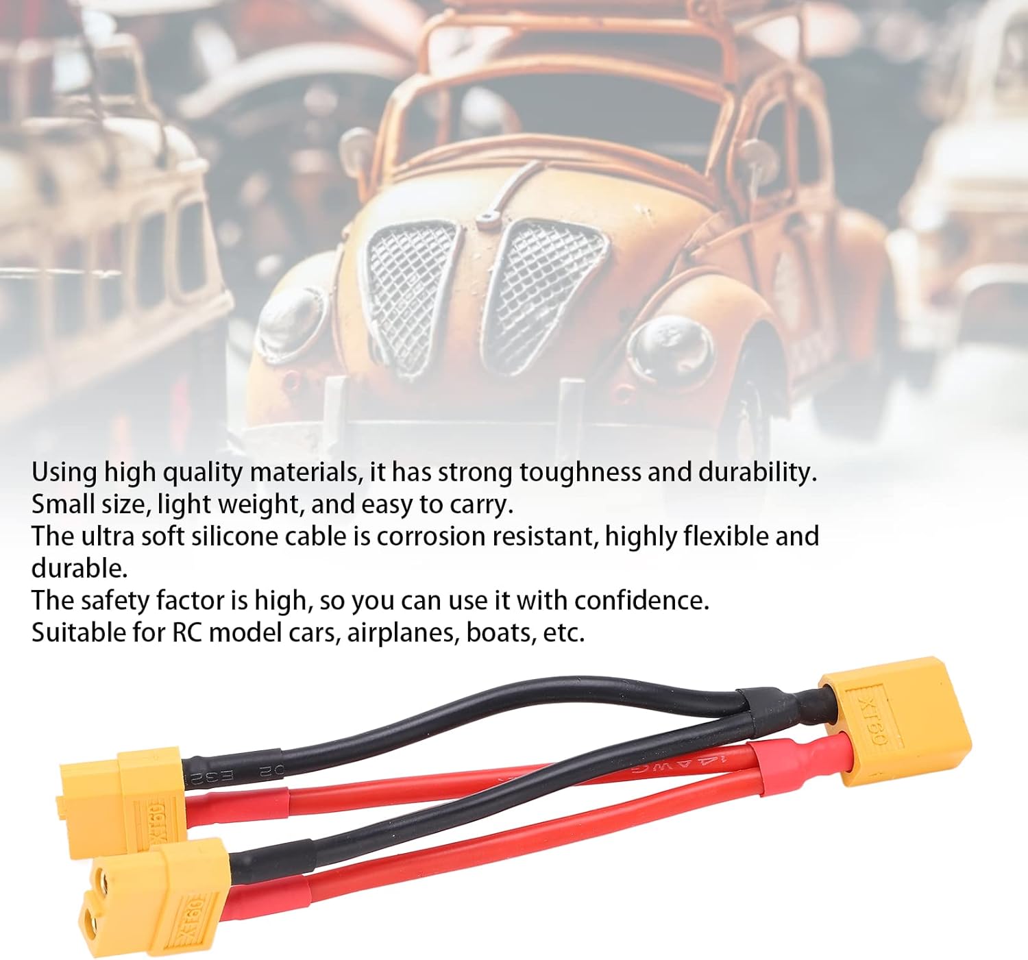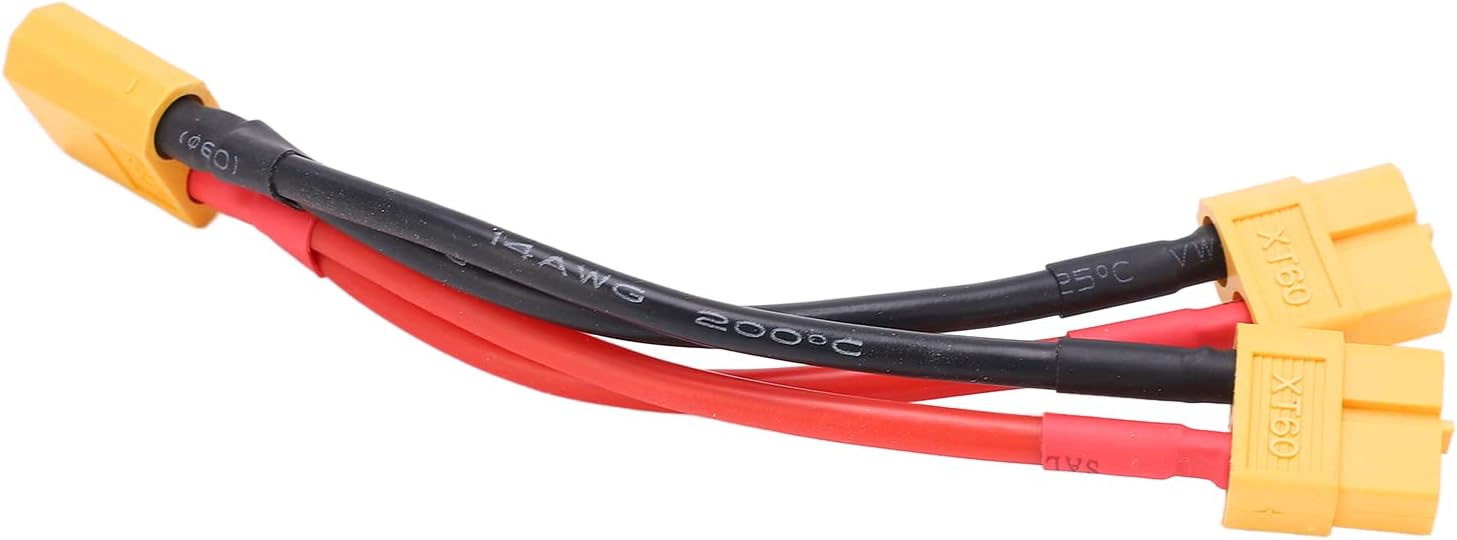 Ampia compatibilità: il cavo connettore parallelo della batteria XT60 ha una forte compatibilità ed è adatto a vari modellini di auto, aeroplani, barche, ecc. Mini e portatile: di piccole dimensioni, leggero, lo splitter a Y XT60 è facile da trasportare e può offrire agli utenti una buona esperienza. Cavo in silicone: il cavo in silicone super morbido è resistente alla corrosione e presenta elevata flessibilità, robustezza e durata. Sicuro da usare: grazie alla pregevole fattura, alle prestazioni eccellenti e all'elevato fattore di sicurezza, il cavo adattatore può essere utilizzato con sicurezza. Materiale: utilizzando materiali di alta qualità, il cavo parallelo XT60 ha una forte tenacità ed è robusto e robusto.