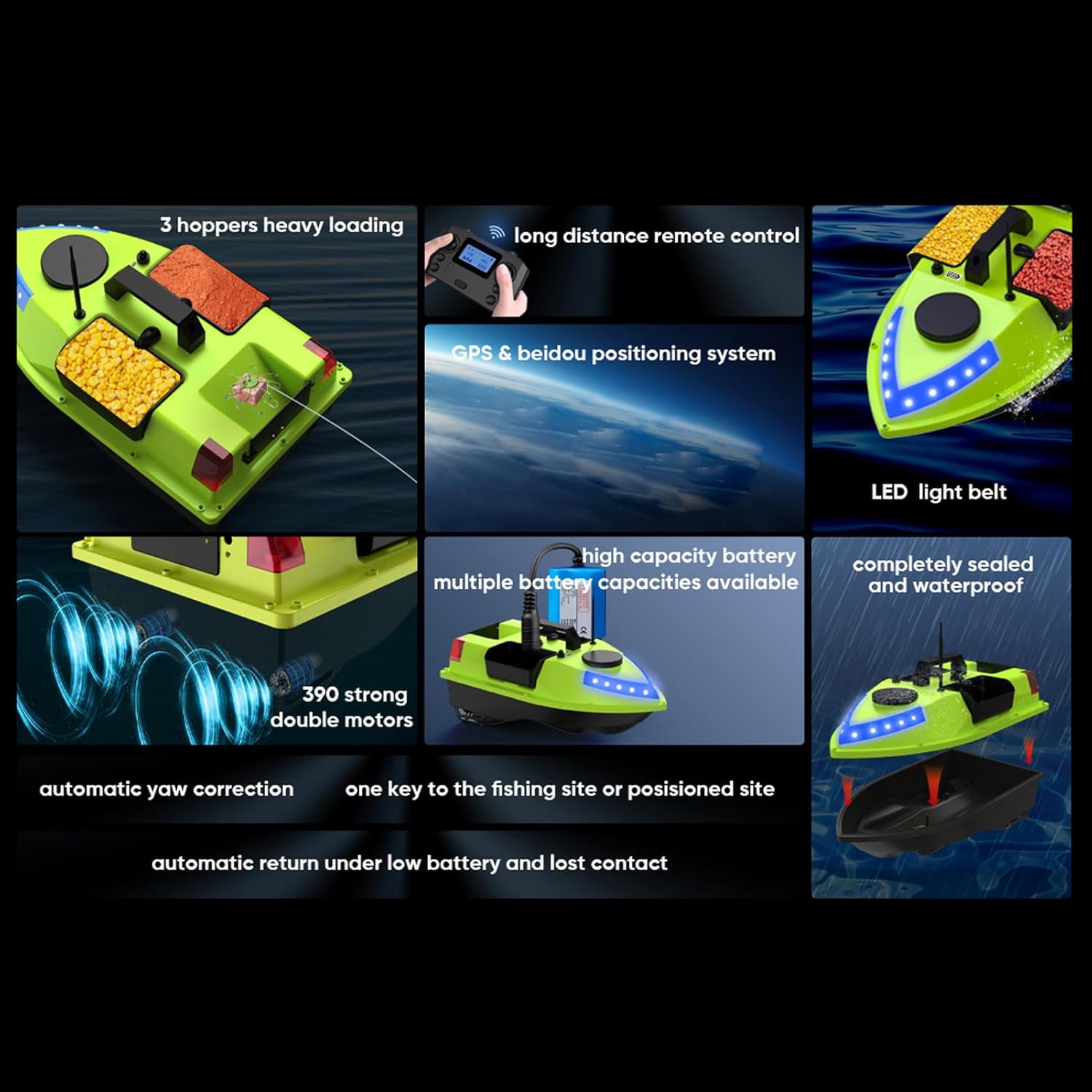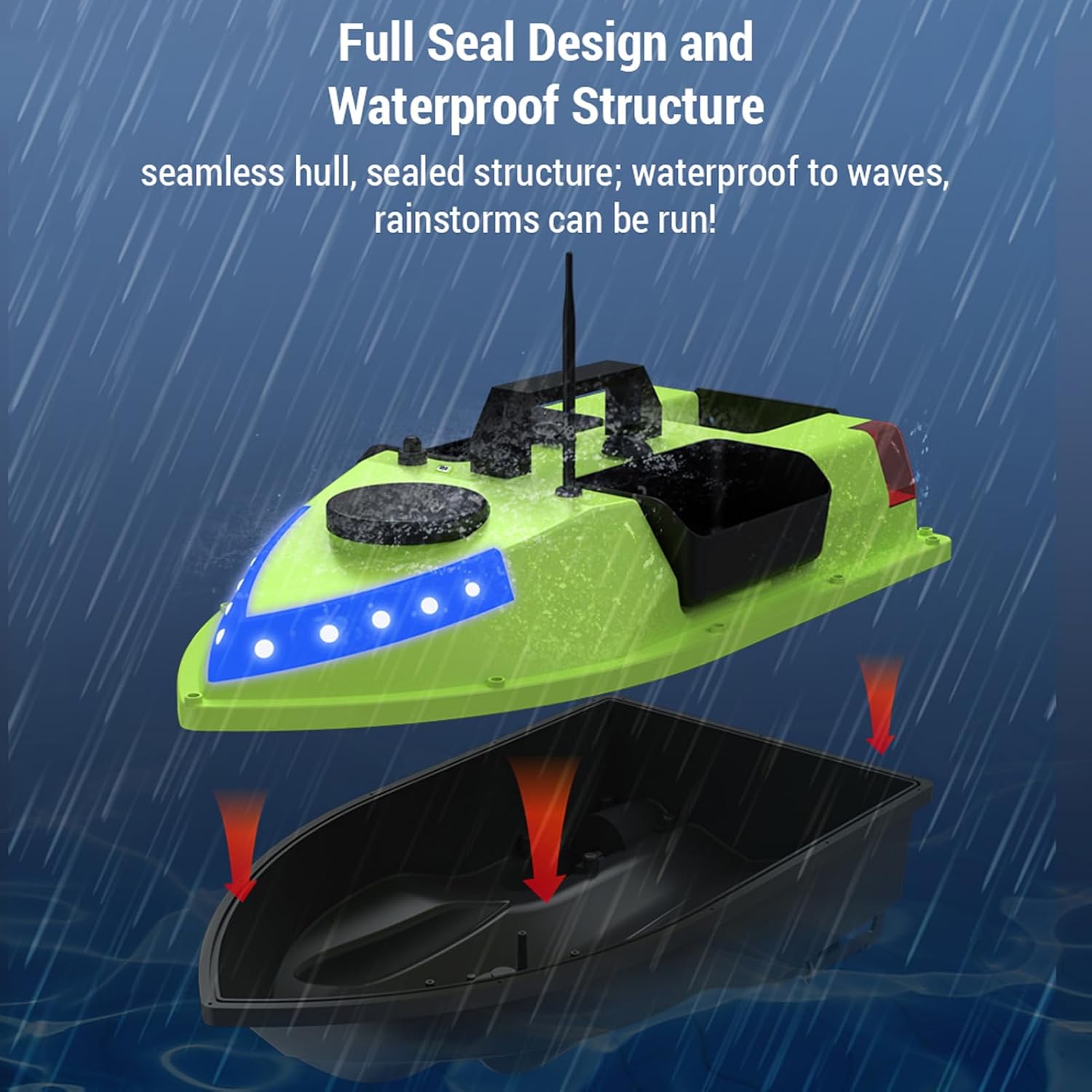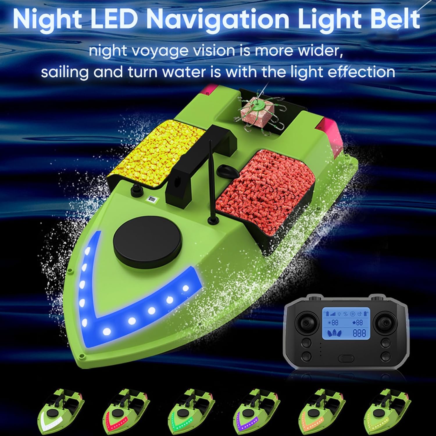 Navigazione automatica: mantiene una rotta dritta anche in acque difficili con rotte corrette automatiche. Remoto controllato: gestire la barca fino a 500 metri di distanza senza lasciare la riva, ottimo per la pesca. Design resistente alle intemperie: il design completamente sigillato garantisce la durabilità in condizioni meteorologiche rigide e acque turbolente. Barca da pesca illuminata: le luci a LED a 7 colori offrono una maggiore visibilità di notte, facendo brillare l'intero corpo. Navigazione GPS: impostare fino a 99 punti esche con la funzione GPS, permettendoti di tornare facilmente ai tuoi punti preferiti.