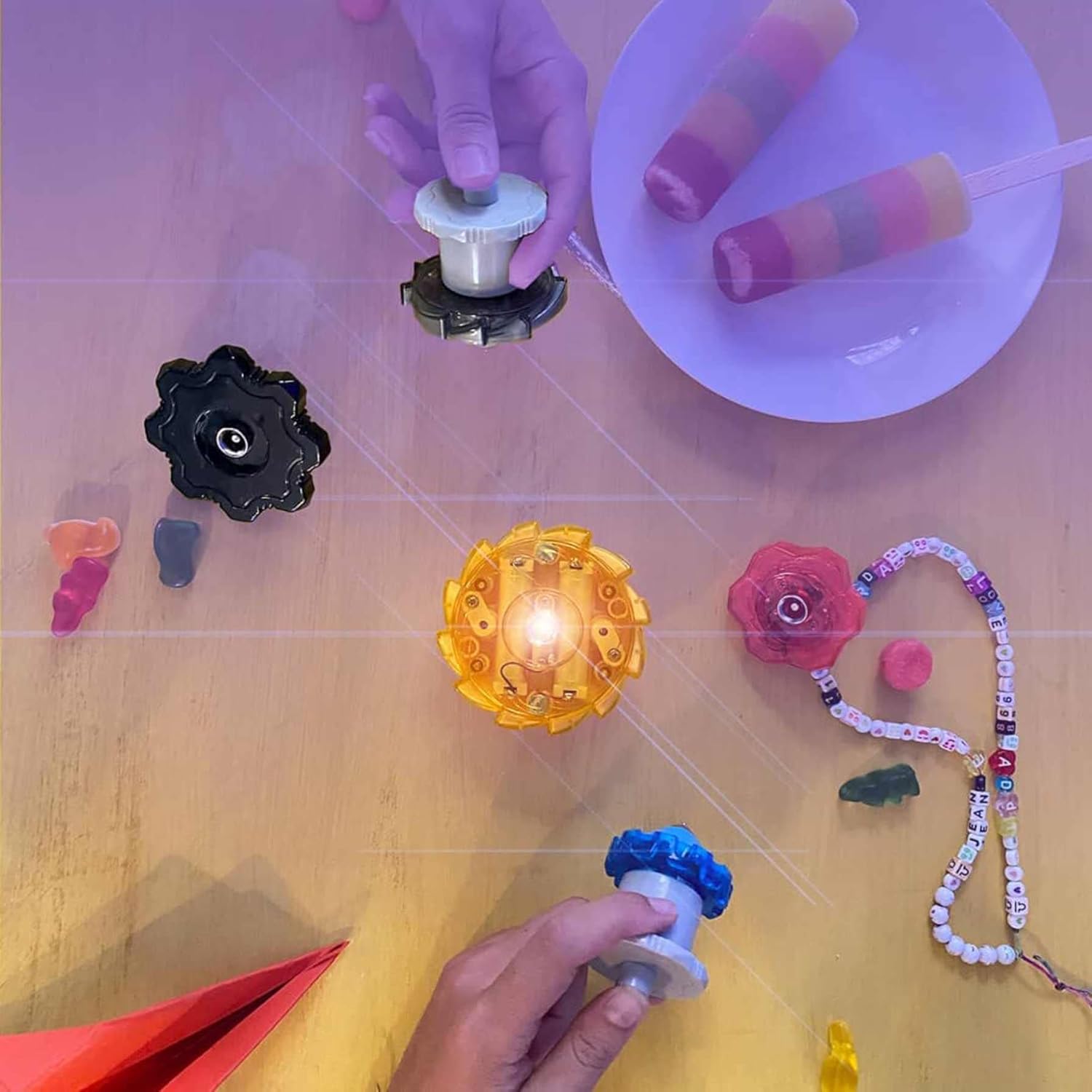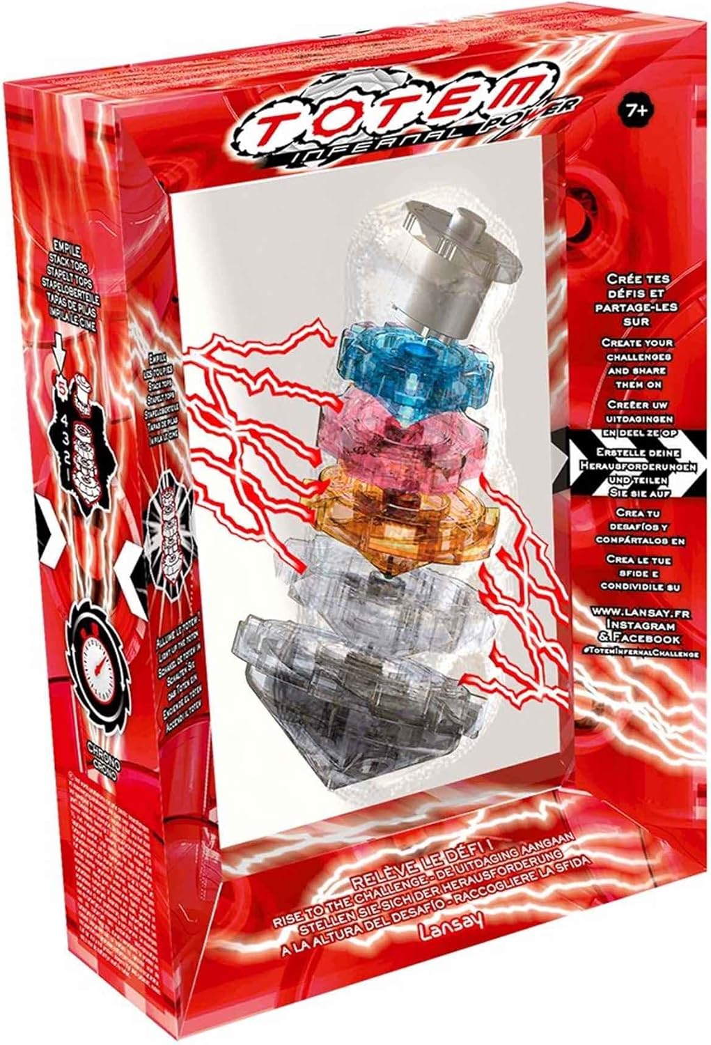 Totem Infernal Power contiene cinque spinners dotati di luce LED di diversi colori che si illuminano quando impilati. Per bambini dai 7 anni in su Fai girare gli spinner con l'aiuto del lanciatore e impilarli su una superficie dura Pratica la tua destrezza impilando gli spinner da più a più piccoli Costruisci un totem con tutte le trotole prima che smettano di ruotare, facendo attenzione che la struttura non si distrugga Questo prodotto funziona con 2 batterie LR03 non incluse nella confezione