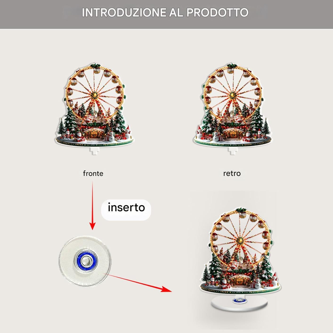 Creatore di Atmosfera : La decorazione a ruota panoramica con tema natalizio funge da affascinante addobbo festivo che esalta l'atmosfera delle feste, rendendola perfetta per creare un ambiente caldo e gioioso durante le riunioni di Natale e le celebrazioni in famiglia. Questo articolo decorativo natalizio migliora lo spirito festivo e si integra facilmente in diversi spazi domestici, aggiungendo un tocco accogliente e allegro alla tua casa nel periodo delle festività. La sua presenza cos Decor Adattabile e Modulabile: Il decor natalizio per tavolo presenta opzioni di posizionamento adattabile che si integrano con vari stili di decor per tavolo domestico, assicurando un design salva-spazio. per cene festive o celebrazioni familiari intime, ottimizza l'uso dello spazio disponibile e si adatta a diverse esigenze di arredamento, valorizzando l'ambiente domestico. Materiale Trasparente Resistente: I centrotavola natalizi progettati con acrilico robusto e trasparenza uniscono charme e resilienza, perfetti per abbellire i tavoli in riunioni festive o eventi le impressioni sono essenziali, offrendo prestazioni affidabili e un design elegante per ogni celebrazione. Regalo Stagionale Incantevole: Le decorazioni per la tavola di Natale offrono una incantevole come regalo cerimoniale, trasformando le tavole quotidiane in centrotavola straordinari che celebrano tradizioni consolidate e portano allegria a qualsiasi raduno festivo o occasione speciale, un modo unico per abbellire e unire. Rotazione Accattivante: Grazie alla sua base rotante, questo centrotavola natalizio fornisce un'azione di rotazione e costante, producendo un display dinamico e coinvolgente che è ideale per aggiungere charme e fascino a qualsiasi tavola imbandita per le feste o evento speciale. Il movimento regolare attira lo sguardo e crea un punto focale incantevole, migliorando l'estetica generale e l'esperienza per tutti i presenti. La visualizzazione rotante esalta le decorazioni natalizie i