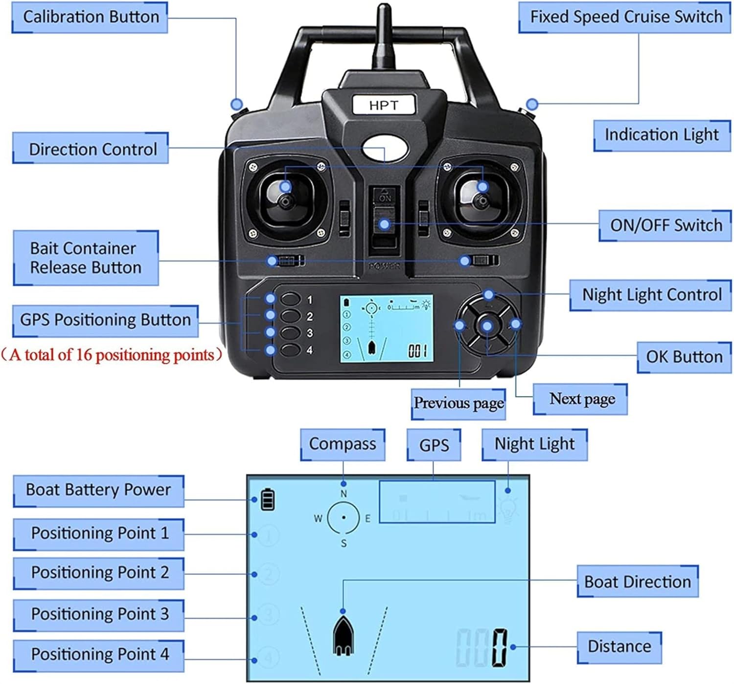 (Controllo intelligente): la barca da pesca è dotata di un telecomando GPS, che può implementare diverse funzioni, come: marcatura di 16 punti di pesca; controllo a 360° della direzione della barca; crociera a velocità fissa e ritorno automatico; apertura indipendente del serbatoio dell'esca; luci LED di controllo, ecc. È possibile visualizzare il supporto della batteria della barca da pesca, la bussola e la distanza percorsa dalla barca tramite lo schermo LCD del telecomando. (Rilevamento della distribuzione dei pesci): La nostra barca di alimentazione è dotata di un fish finder intelligente, che con l'aiuto del posizionamento del sonar riconosce le condizioni e il contorno del suolo dell'acqua in tempo reale. Se la temperatura dell'acqua è indicata in ° C o ° F, i simboli dei pesci indicano, determina la posizione e la profondità dei pesci. La ricezione del segnale del fish finder è di 100 m e l'intervallo di profondità di misurazione: da 0,6 a 36 m. (Contenitore per esche di grande capacità): la barca per esche ha 3 contenitori per esche indipendenti che caricano 2 kg di esche e posizionano l'esca senza problemi in vari spazi di pesca, il che attrae un gran numero di pescatori per la raccolta. Migliora notevolmente il tasso di successo durante la pesca. Inoltre, la barca per mangimi può anche tirare una rete galleggiante con una lunghezza di 15 metri e una larghezza di 1 metro, che è molto adatta ai pescatori per la pesca. (Adatto a diversi ambienti): la barca di alimentazione è dotata di due motori ed eliche a tre ali che offrono molta potenza per viaggi veloci, una forma monoblocco completamente chiusa e uno scafo anticollisione adatto a una varietà di acque. (Batteria al litio ad alte prestazioni): la barca di alimentazione è alimentata da una batteria al litio da 5200 mAh. Può essere caricata separatamente ed è facile da installare. Dopo ogni carica completa, la batteria da 5200 mAh può essere utilizzata per circa 2-3 ore. Il rilevatore può essere caricato tramite USB. È possibile scegliere un altro numero di batterie di backup in base alle esigenze.