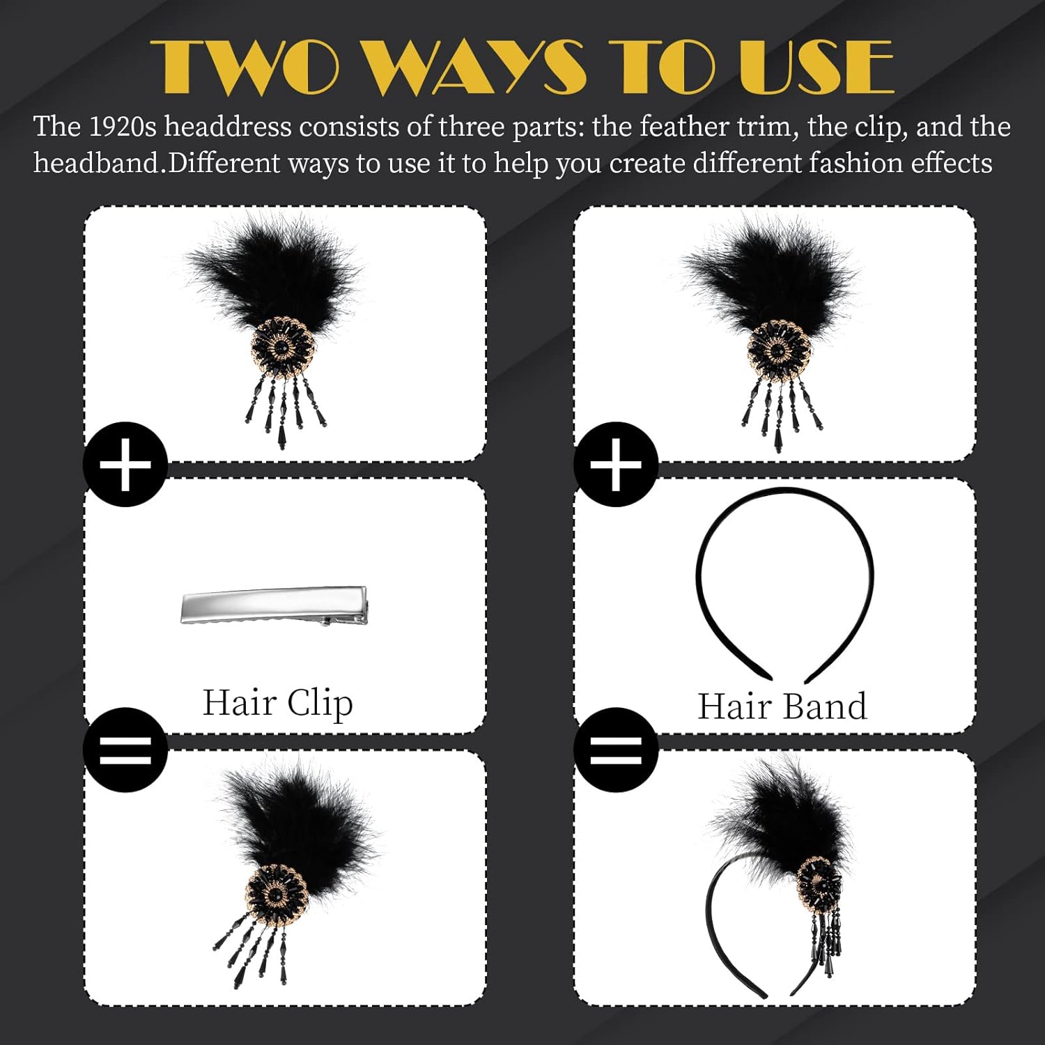 Design squisito: questa fascia da flapper degli anni '20 è composta da 3 parti: decorazione di piume, forcina e cerchietto; Puoi scegliere di indossarlo in base a diversi abbinamenti; Soffici piume si combinano con una classica frangia di accessori per capelli per creare il tuo look vintage Dimensioni adatte: il copricapo da flapper degli anni '20 misura circa 11,5 x 13 cm/ 4,53 x 5,12 pollici, quindi è elastico e si adatta alla maggior parte delle persone; La frangia sull'accessorio per capelli in piuma è lunga circa 6 cm/ 2,36 pollici e la lunghezza della piuma è di circa 10 cm/ 3,94 pollici Materiale di qualità: la parte del cerchietto per capelli con piume è composta da piume, morbide e delicate, e la nappa è composta da perline di cristallo che vengono infilate attraverso un filo, insieme a un pezzo di fissaggio in lega; Formano un accessorio per capelli molto abbagliante; La clip è realizzata in lega, che è robusta e solida, e l'archetto è leggero e non aumenterà il carico sulla testa Abbinamento diverso: questa fascia di bellezza può essere abbinata in 2 modi diversi; Il fermaglio per capelli, la fascia e la piuma sfrangiata possono essere staccati, quindi la piuma e il fermaglio possono essere applicati come accessori per capelli a forcina; La piuma e l'archetto possono essere considerati un accessorio per capelli; Può anche essere abbinato a diversi vestiti per creare il tuo stile retrò Ampia occasione: questo cerchietto da flapper con piume è adatto per feste a tema, cocktail party, ritorno a casa, ballo di fine anno, feste serali, banchetti, concorsi di bellezza, feste di matrimonio, costumi cosplay, feste con decorazioni artistiche, feste in maschera o altre occasioni; Sei sicuro di essere l'esistenza più accattivante e abbagliante tra la folla
