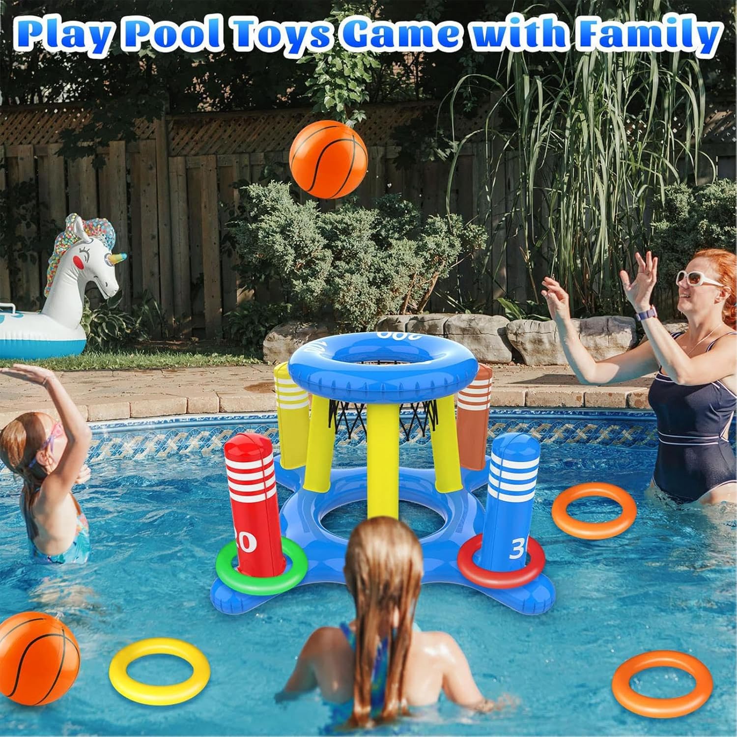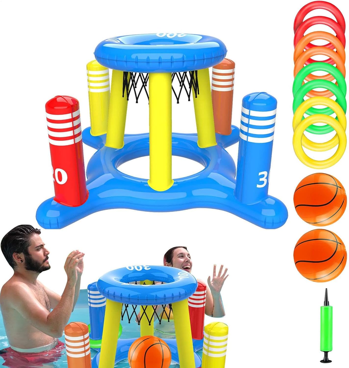 Set di giochi da piscina 2 in 1: con questo cerchio da basket per piscina puoi giocare sia a basket che a pneumatici in acqua. Ha un aspetto carino e colorato che attrae bambini e adulti allo stesso modo. Rende il tuo gioco d'acqua più divertente e ti aiuta a sviluppare la coordinazione occhio-mano e le abilità motorie. Durevole: questo pneumatico galleggiante da basket per piscina è realizzato in materiale PVC resistente che può resistere a danni e perdite. Si può giocare a basket in acqua con più divertimento ed emozione. Compatto e divertente: non c'è bisogno di preoccuparsi di complicate installazioni o strumenti. Questo cerchio da basket gonfiabile 2 in 1 fiorisce in pochi minuti e si svuota rapidamente quando non viene utilizzato. È comodo da trasportare e riporre ovunque tu voglia. Awesome Pool Set: con 2 palline da basket gonfiabili, 1 giocattolo da lancio incrociato, 1 giocattolo multifunzionale da piscina con 8 anelli di lancio e 8 cerchi gonfiabili, puoi giocare a diversi giochi d'acqua e divertirti con il tuo LO Generalmente applicabile: con questo gioco multifunzionale per piscina con 8 anelli di lancio, puoi goderti giochi in spiaggia o attività all'aperto come feste in piscina in un modo nuovo. Puoi usarlo per diverse occasioni come feste di compleanno, feste in spiaggia o giochi in cortile. È anche adatto a tutte le età e abilità, quindi tutti possono divertirsi.