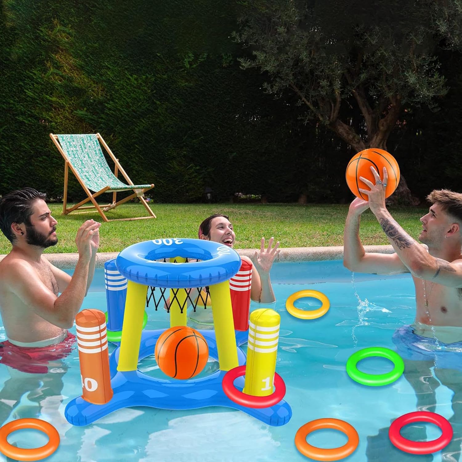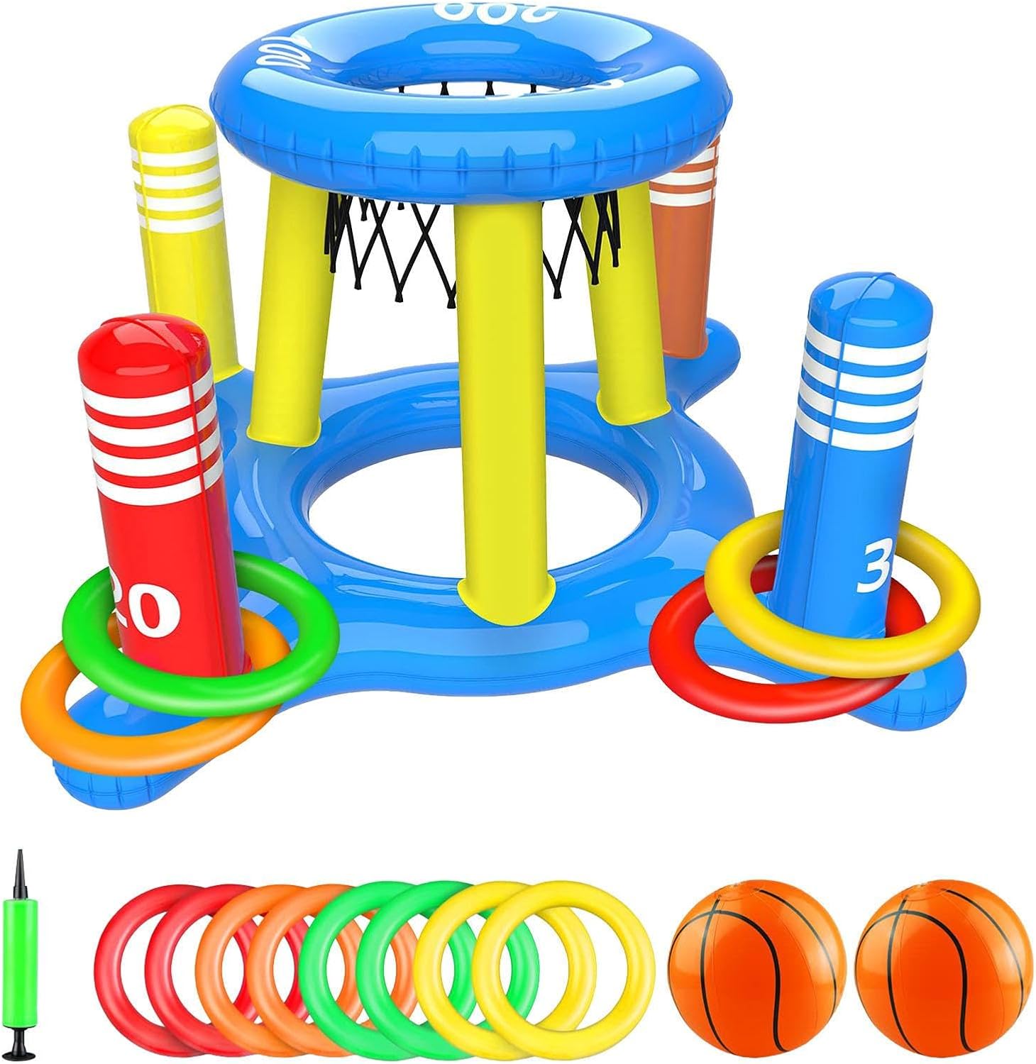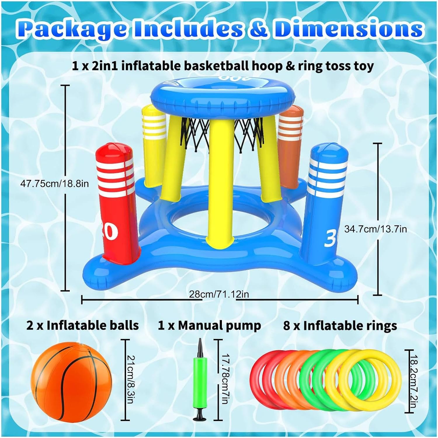 2 in 1 gioco di piscina: con questo cerchio da basket per piscina, puoi giocare sia a basket che a cerchio in acqua. Ha un aspetto carino e colorato che attrae sia gli adulti. Aggiunge più divertimento al tuo gioco d'acqua e ti aiuta a sviluppare la coordinazione occhio-mano e le capacità motorie. Durevole: questo cerchio da basket galleggiante per la piscina è realizzato in materiale PVC resistente che resiste a danni e perdite. Puoi giocare a basket in acqua con più divertimento e brivido per molto tempo. Compatto e divertente: non c'è bisogno di preoccuparsi di installazione o strumenti complicati. Questo cerchio da basket gonfiabile da 2 su 1 si gonfia in minuti e si sgonfia rapidamente quando non in uso. È comodo da trasportare e riporre dove vuoi. Set da piscina impressionante: con 2 palloni da basket gonfiabili, 1 giocattolo di lancio a cerchio incrociato, 1 set di giocattoli da piscina multifunzionali con 8 anelli da lancio e 8 cerchi gonfiabili, puoi giocare a diversi giochi d'acqua e divertirti con il tuo LO Ampiamente applicabile: questi giochi di giocattoli da piscina multifunzionali con 8 anelli di lancio ti consentono di goderti giochi in spiaggia o attività all'aperto come feste in piscina in modo nuovo. Puoi usarlo per varie occasioni come feste di compleanno, feste in spiaggia o giochi in cortile. È adatto anche per età e livelli di abilità, in modo che tutti possano divertirsi.