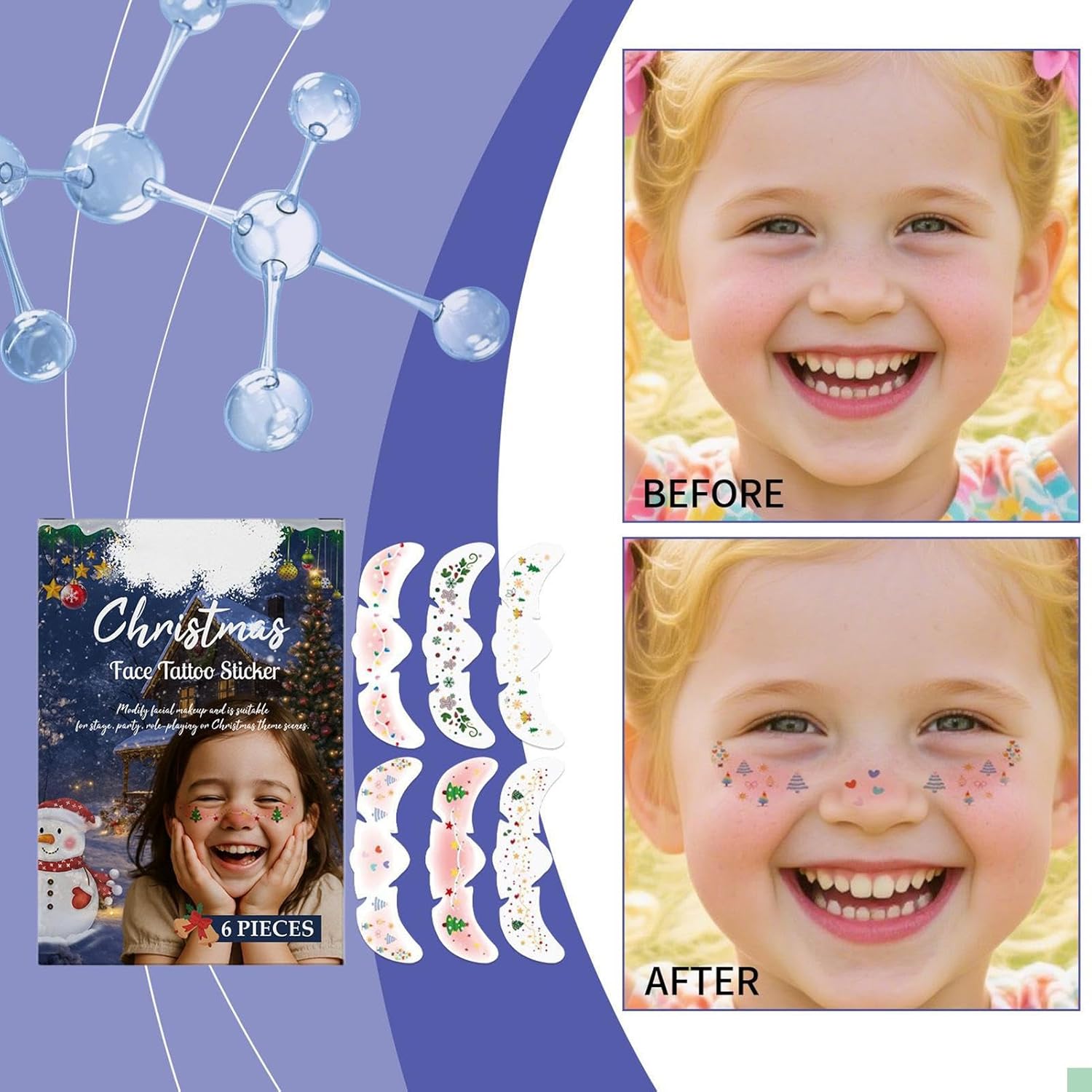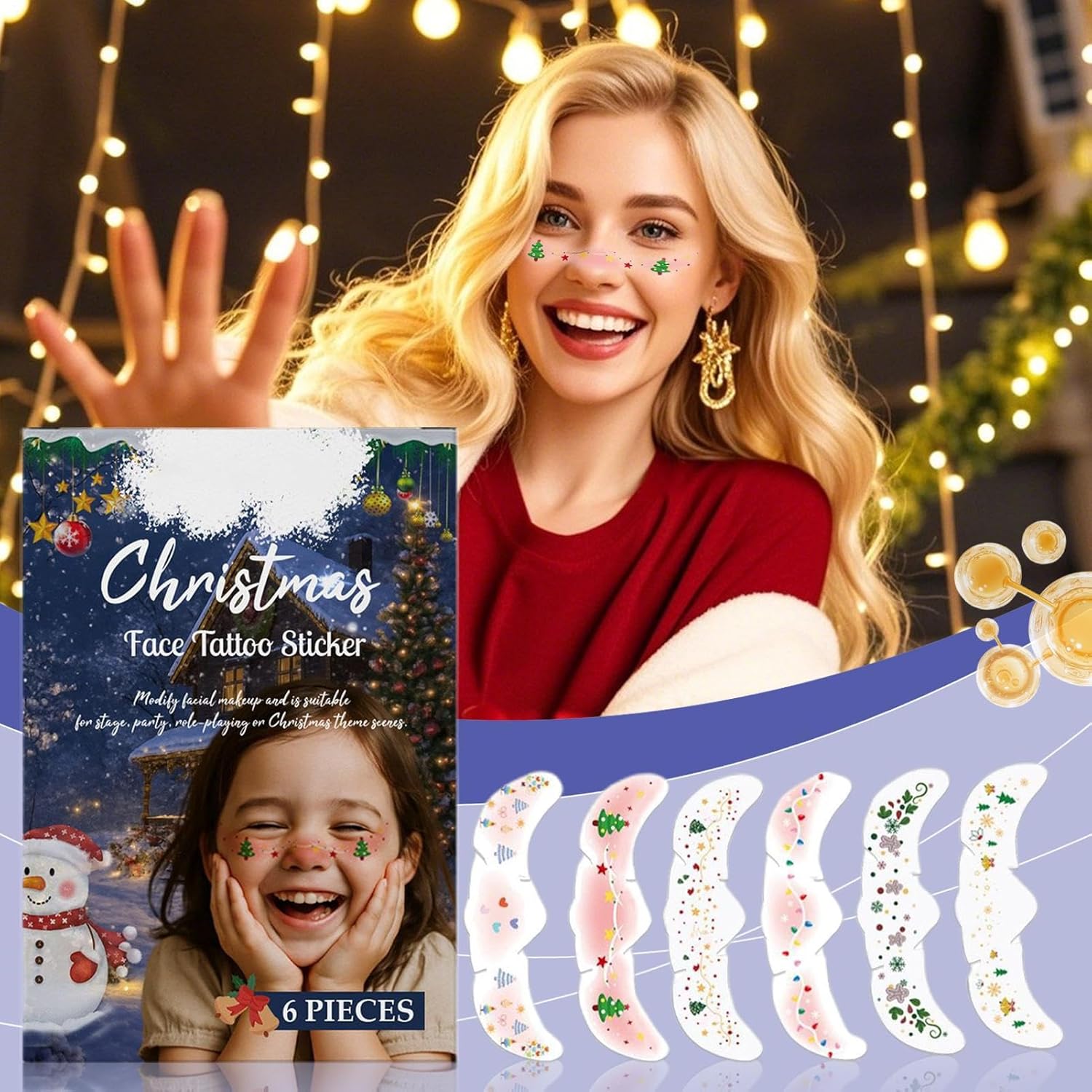 Design anti-arricciamento: Grazie ai materiali adattabili e delicati sulla pelle, i cerotti aderiscono saldamente alle curve del viso, prevengono il sollevamento dei bordi e una base liscia per un trucco sicuro e preciso Varietà di Disegni Creativi: Con una gamma di modelli assortiti studiati per adattarsi a diverse estetiche di trucco, questi cerotti per lentiggini si fondono senza sforzo e permettono regolazioni creative per ogni occasione, valorizzando il look in modo naturale e versatile Look Natalizio Festoso: Migliora il tuo ensemble festivo facilmente applicando toppe per lentiggini con stampe ispirate al Natale, offrendo un modo semplice per ravvivare il tuo aspetto abbracciando il fascino gioioso e divertente della stagione delle feste Semplicità d'Uso: Grazie alla tecnologia a trasferimento ad acqua, le lentiggine decorative si applicano con minimo sforzo e pressione delicata, senza richiedere competenze specifiche o attrezzi complessi Dissoluzione Veloce: Grazie alla formula innovativa, i cerotti si sciolgono agevolmente a contatto con acqua calda e soluzioni detergenti, permettendo una rimozione indolore e rispettosa della pelle senza lasciare residui