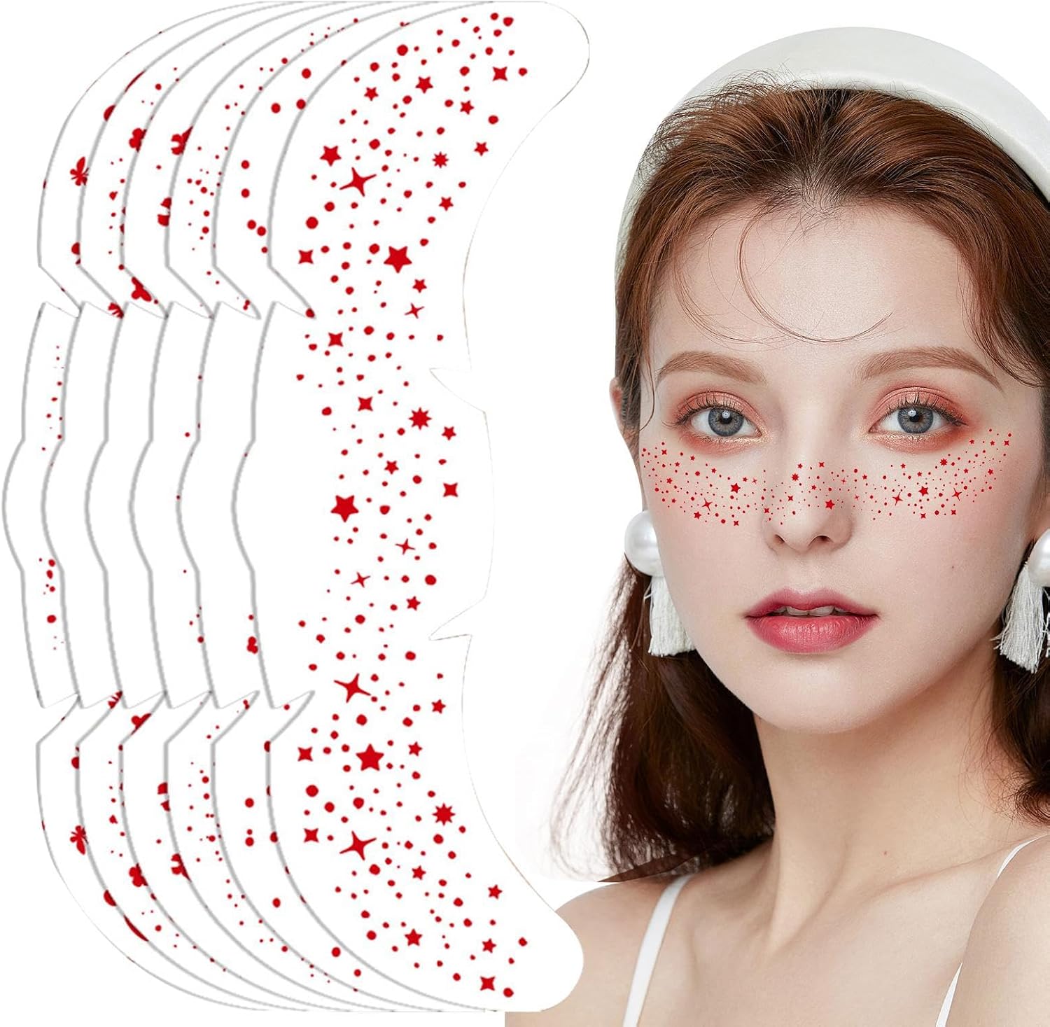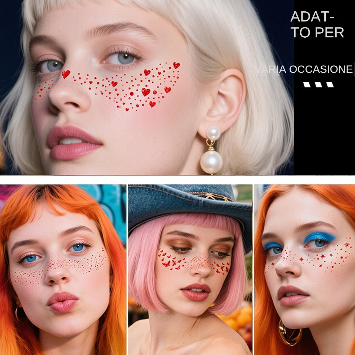 Performance Climatica: Adatta a tutte le condizioni atmosferiche, protegge il trucco da sudore e umidità mantenendo intatta l'eleganza grazie alla formula waterproof con tecnologia a resistenza avanzata Perfetti per Eventi: Si adattano con naturalezza a qualsiasi tema grafico, risultando perfetti per concerti, feste a tema e performance artistiche, mantenendo al contempo un utilizzo pratico nel makeup quotidiano grazie alla rapida applicazione e rimozione Materiali delicati e sicuri: Formula priva di componenti aggressivi, sviluppata con polimeri dermatologicamente testati per garantire massima compatibilità con epidermide secca, grassa o mista. Struttura traspirante che rispetta il pH naturale. Processo moderno: ottieni un trucco in soli 60 secondi grazie alla tecnica user-friendly peel, press e remove. Nessun metodo avanzato o passaggi lunghi, solo semplicità e risultati impeccabili perfetta: Resistenti all'umidità elevata, questi cerotti trucco offrono coprenza duratura senza arricciarsi o staccarsi, aderendo perfettamente alle texture cutanee e mantenendo l'effetto impeccabile anche durante giornate dinamiche.