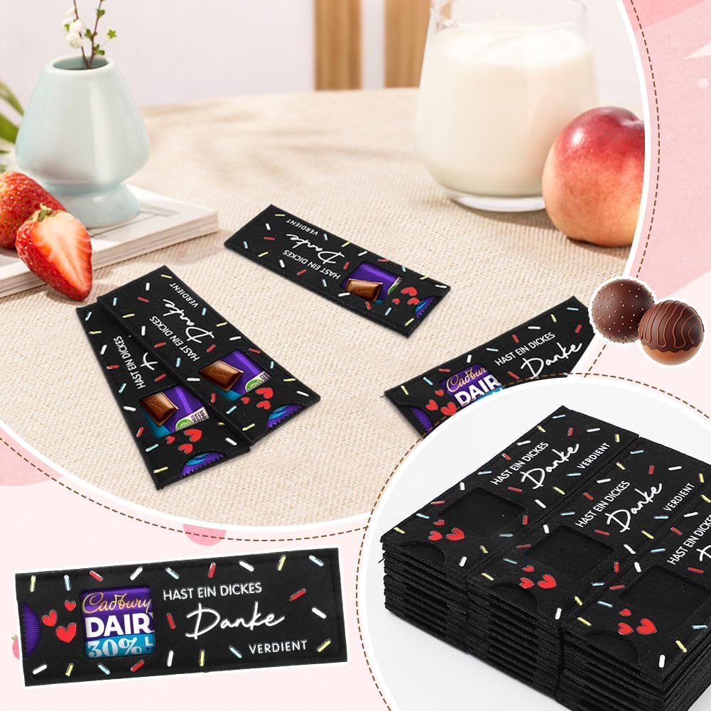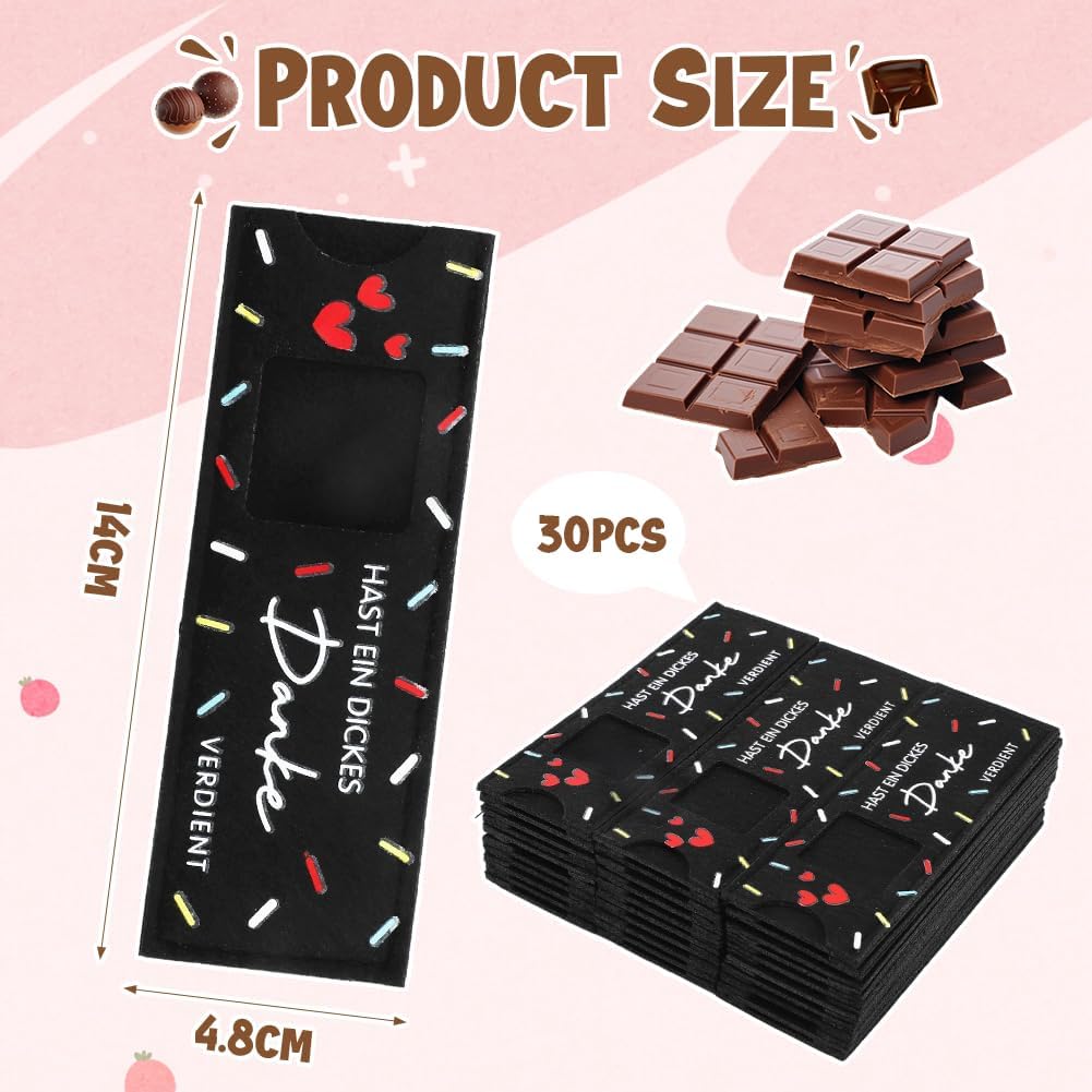 SET IN FELTRO DI CIOCCOLATO PERSONALIZZATO - Riceverai 30 involucri di cioccolato in feltro di alta qualità, ideali come confezione regalo per barrette di cioccolato. Le eleganti copertine danno ai tuoi regali un tocco festoso e rendono i piccoli regali ancora più speciali. ALTA QUALITÀ E SOSTENIBILE - La confezione regalo per gli ospiti per il cioccolato è realizzata in feltro resistente ed ecologico. Il materiale è morbido, protegge il cioccolato ed è riutilizzabile - un'alternativa sostenibile agli imballaggi usa e getta CON UN MESSAGGIO AMOREVOLE - Ogni copertura di cioccolato in feltro è decorata con parole calde come "È bello che tu sia qui". Ideale per esprimere gratitudine - sia per la famiglia, gli amici, i colleghi, i dipendenti o gli ospiti VESTIBILITÀ PERFETTA - Misurando 14 x 5 cm, le maniche in feltro di cioccolato si adattano perfettamente alle barrette di cioccolato standard. Si adattano perfettamente, hanno un aspetto visivamente accattivante e sono facili da trasportare e distribuire agli ospiti. VERSATILI - Questi involucri di cioccolato in feltro sono la scelta perfetta come regalo per gli ospiti in occasione di matrimoni, compleanni, battesimi, Natale, feste aziendali, anniversari o feste di laurea. Un piccolo ma nobile gesto di riconoscenza