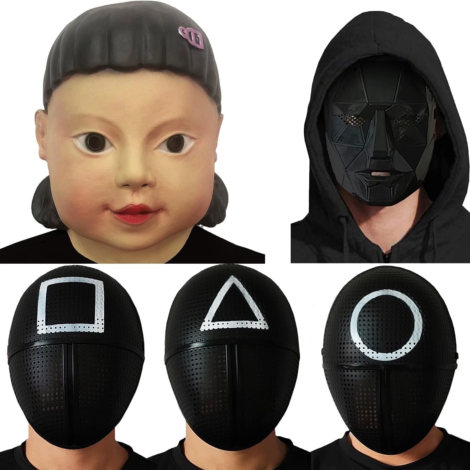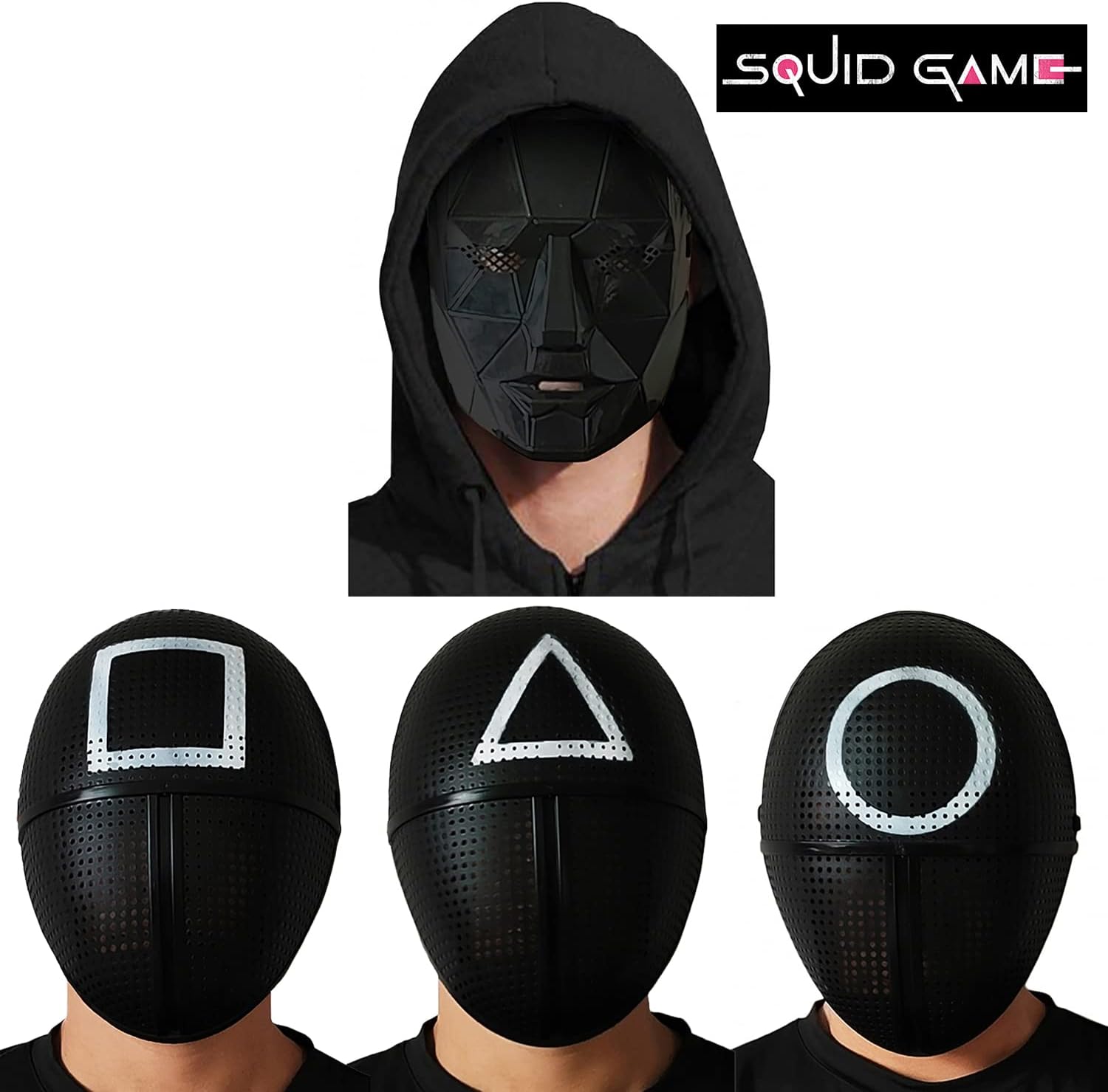 Maschera nera Squad Killer con motivo a triangolo bianco, stile Squid Game, the Gamer. Visione possibile grazie alle microperforazioni. Realizzato in plastica di qualità, tenuto da elastico. Per costumi o cosplay. Taglia unica adulto.