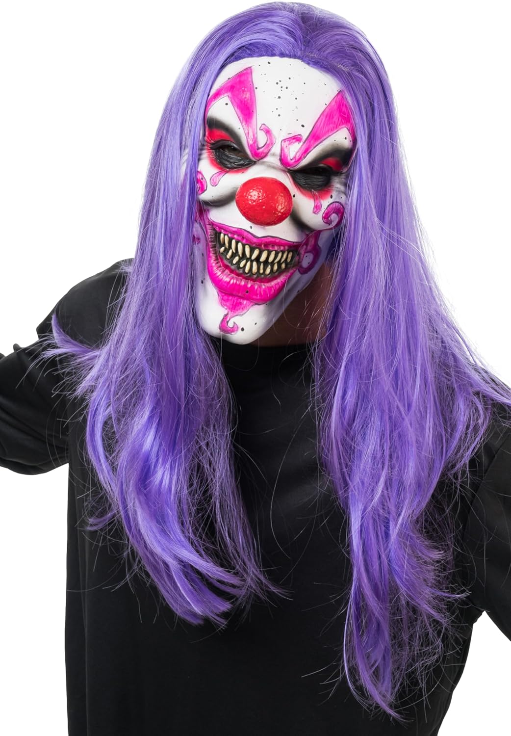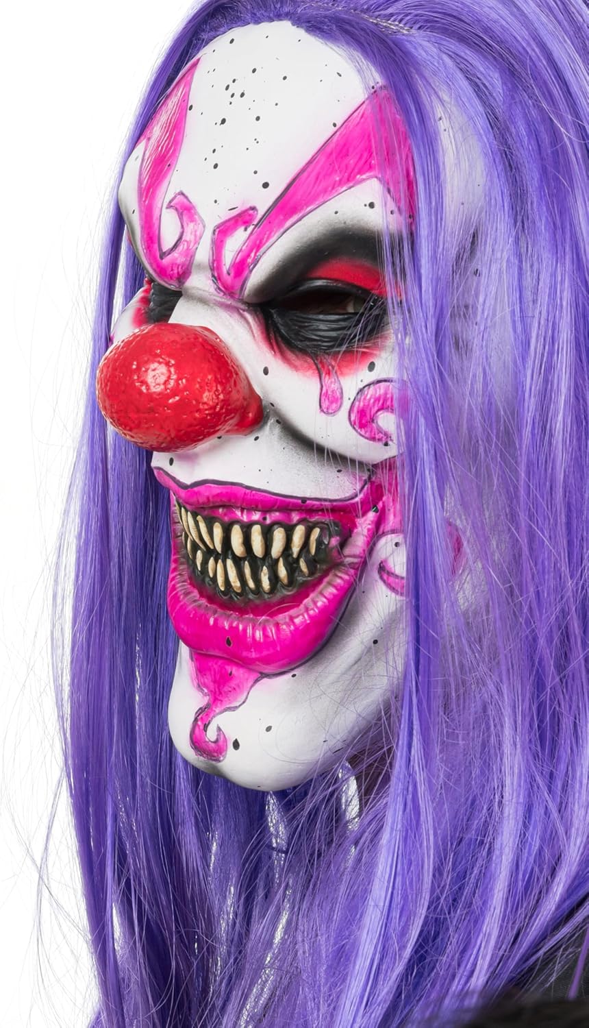 Descrizione Questa maschera da clown horror in lattice flessibile combina tratti grotteschi con vistosi capelli sintetici viola, creando un effetto inquietante per Halloween, Carnevale o feste a tema raccapriccianti. I contorni netti, gli occhi nero intenso e gli accenti rosa creano un look da incubo che impressiona sia da vicino che da lontano. Grazie alla comoda vestibilità e al materiale flessibile, la maschera può essere indossata comodamente per lunghi periodi di tempo senza limitare la libertà di movimento. I lunghi capelli sintetici accentuano la silhouette bizzarra e possono essere acconciati a piacere. Che sia parte di un costume spaventoso o un accessorio a sé stante, questa maschera è un'aggiunta impressionante a qualsiasi look da brivido e attira l'attenzione. Avviso di sicurezza Warning! ADULT PRODUCT. This product is not a toy and is not designed or intended for children under 14 years of age. Contenuto della confezione Maschera Visualizza di più