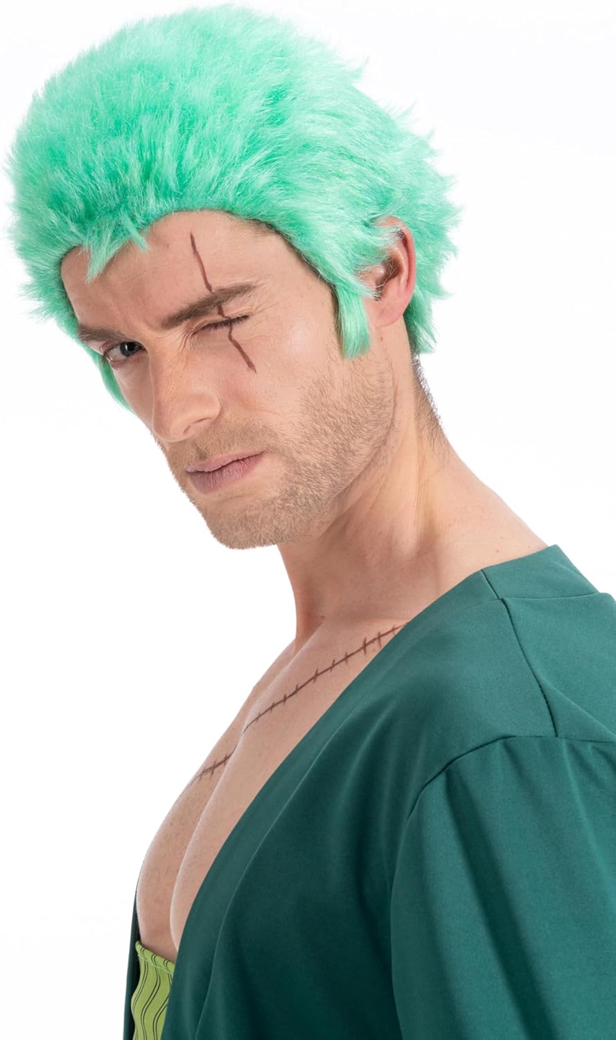 Parrucca One Piece Pirata Roronoa Zoro verde da uomo Contenuto della confezione: 1 pezzo. Parrucca (senza costume), taglia unica I fan di One Piece attenzione: con questa parrucca originale con licenza vi trasformerete nel popolare personaggio manga Zoro del successo anime e della serie "OnePiece". Con questa parrucca dal caratteristico colore verde pungente vestirete Roronoa Zoro, il primo assistente del capitano pirata Monkey D. Ruffy! La parrucca colpisce per il suo colore verde chiaro ed è ispirata al pirata Zoro con la sua acconciatura a pelo corto e le semplici basette. Accessorio ideale per il costume per trasformarsi in spadaccino Zoro! Accessorio ideale per carnevale, feste a tema e cosplay