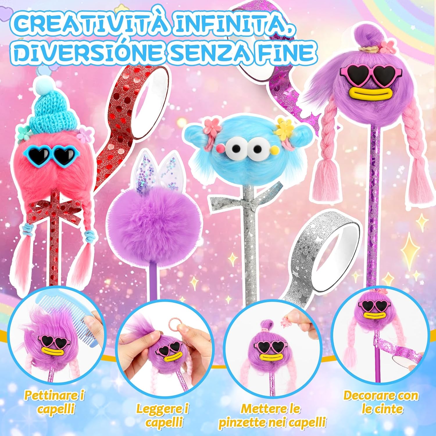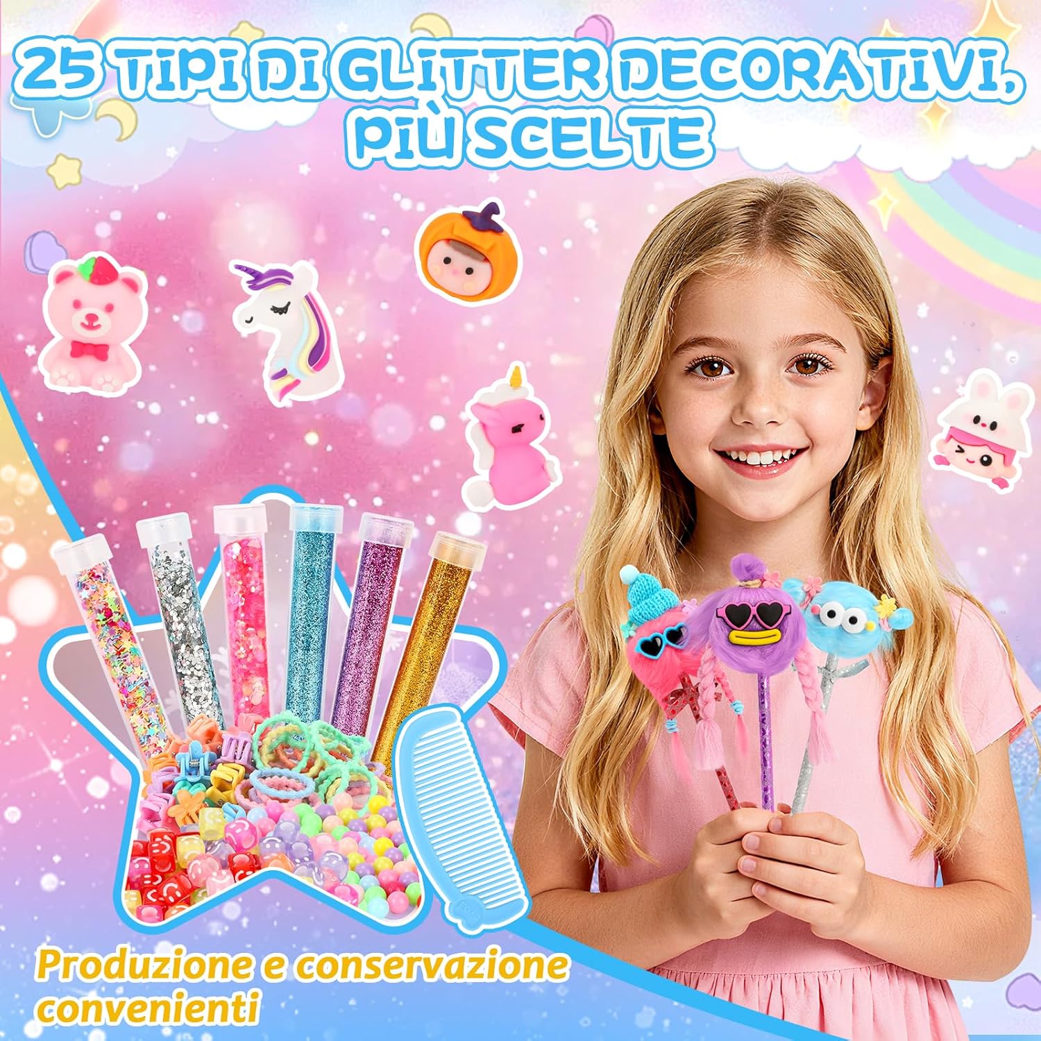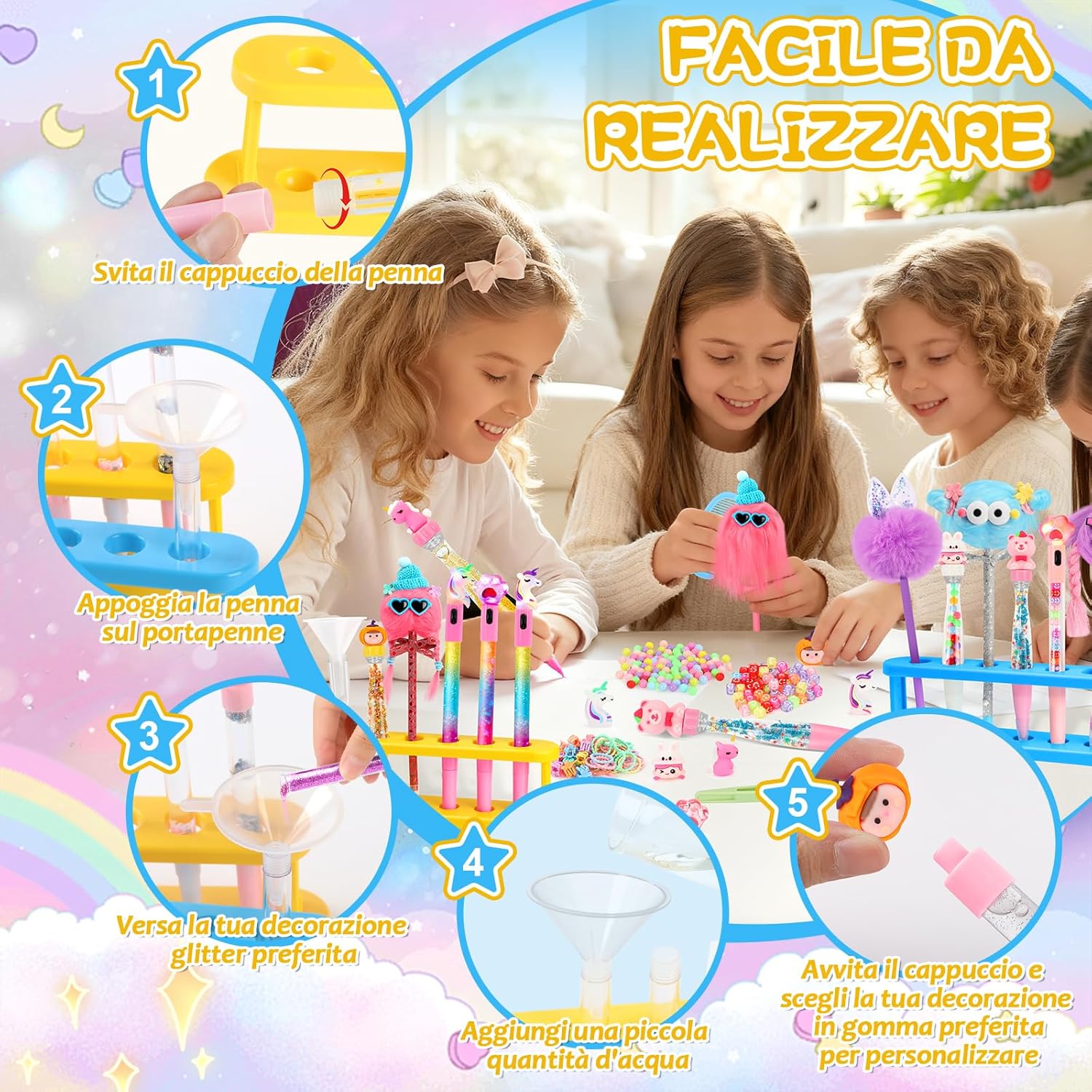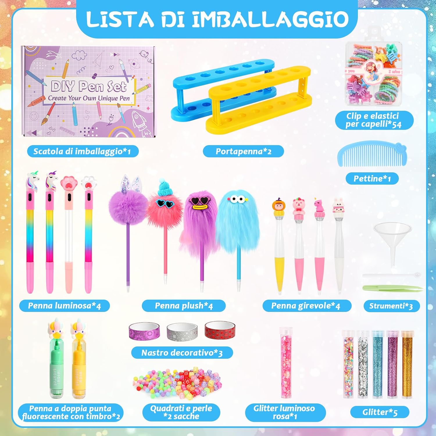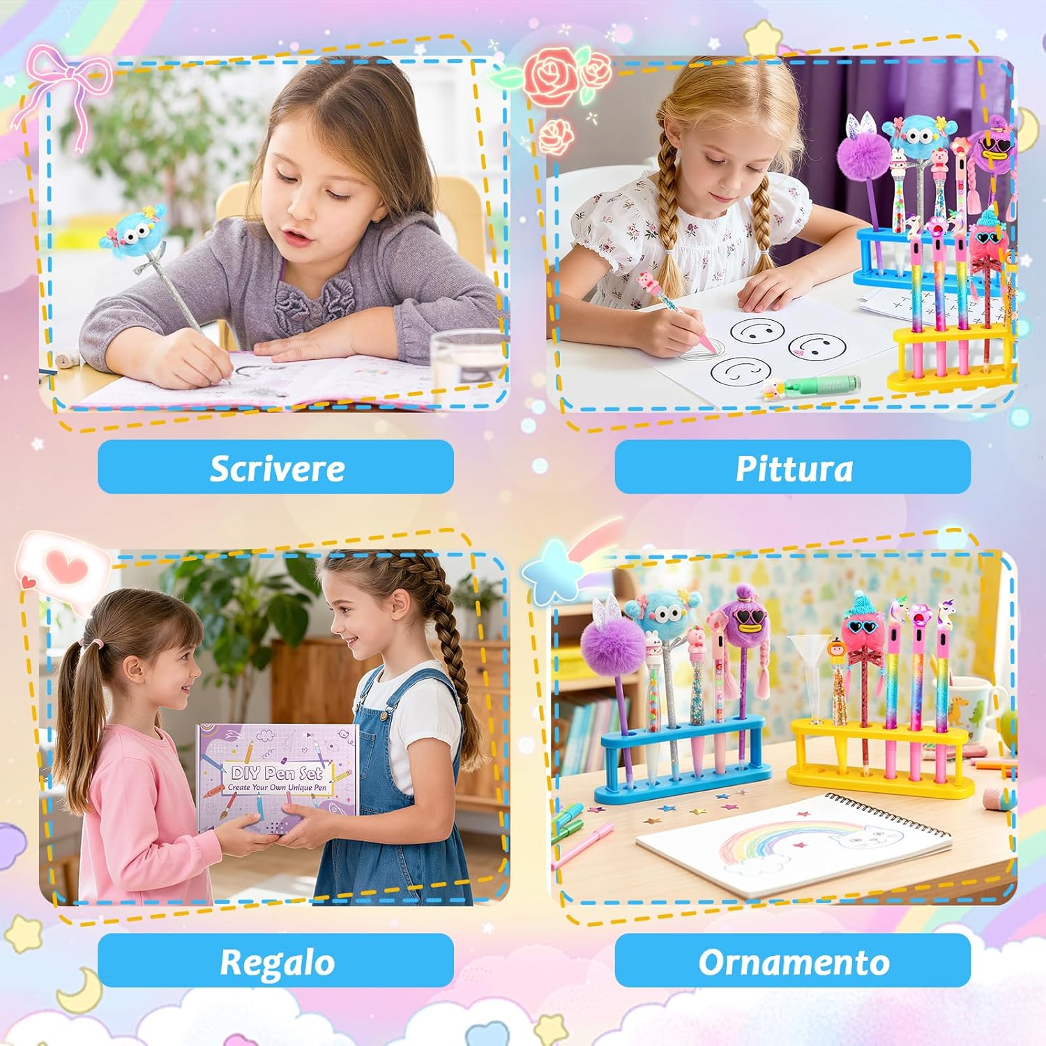 Set per Laboratorio di Penne a Sfera di Lusso: Questo set di penne creare fai da te contiene 14 penne con vari elementi interattivi, come una penna di peluche per acconciare i capelli, una penna che si illumina, una penna rotante e una penna con doppio timbro. I numerosi accessori soddisfano le diverse esigenze creative dei bambini, mentre i due portapenne consentono a più bambini di giocare contemporaneamente, permettendo ai più piccoli di assaporare la gioia del fai da te. Personalizza le Acconciature delle Penne di Peluche: Il kit creativo per creare penne include quattro penne di peluche, complete di pettine, elastici e piccole mollette, che consentono ai bambini di creare acconciature personalizzate per le loro penne di peluche. Inoltre, possono decorare il corpo delle penne con nastro adesivo. Ogni fase è ricca di divertimento e offre ai bambini innumerevoli modi per esplorare da soli. Penne a Sfera Personalizzate Fai Da Te Creative: Questo set contiene 8 penne pronte per essere decorate, che potrete abbellire con perline e altri accessori. Inoltre, ogni penna nasconde una piacevole sorpresa nella punta: alcune ruotano, mentre altre si illuminano! Lasciate che i vostri piccoli liberino la loro immaginazione per creare penne a sfera davvero uniche! Sviluppo Olistico delle Competenze: Quando realizzano le penne, i bambini devono assemblare gli accessori con le mani per esercitare la motricità fine e la coordinazione; quando scelgono e personalizzano le decorazioni, possono stimolare la loro immaginazione e creatività; quando progettano il design interno del portapenne, possono coltivare la loro capacità di pensiero spaziale, che li aiuta a sviluppare competenze a tutto tondo. Il Regalo Perfetto per le Feste: Che si tratti di laboratori creativi a scuola, riunioni di famiglia o feste di compleanno, questo Set di Penne di Cancelleria per Bambini è una scelta eccellente. I bambini potranno divertirsi a creare insieme penne uniche da regalare ad amici e familiari. È un modo premuroso per condividere le loro creazioni e conservare ricordi preziosi.