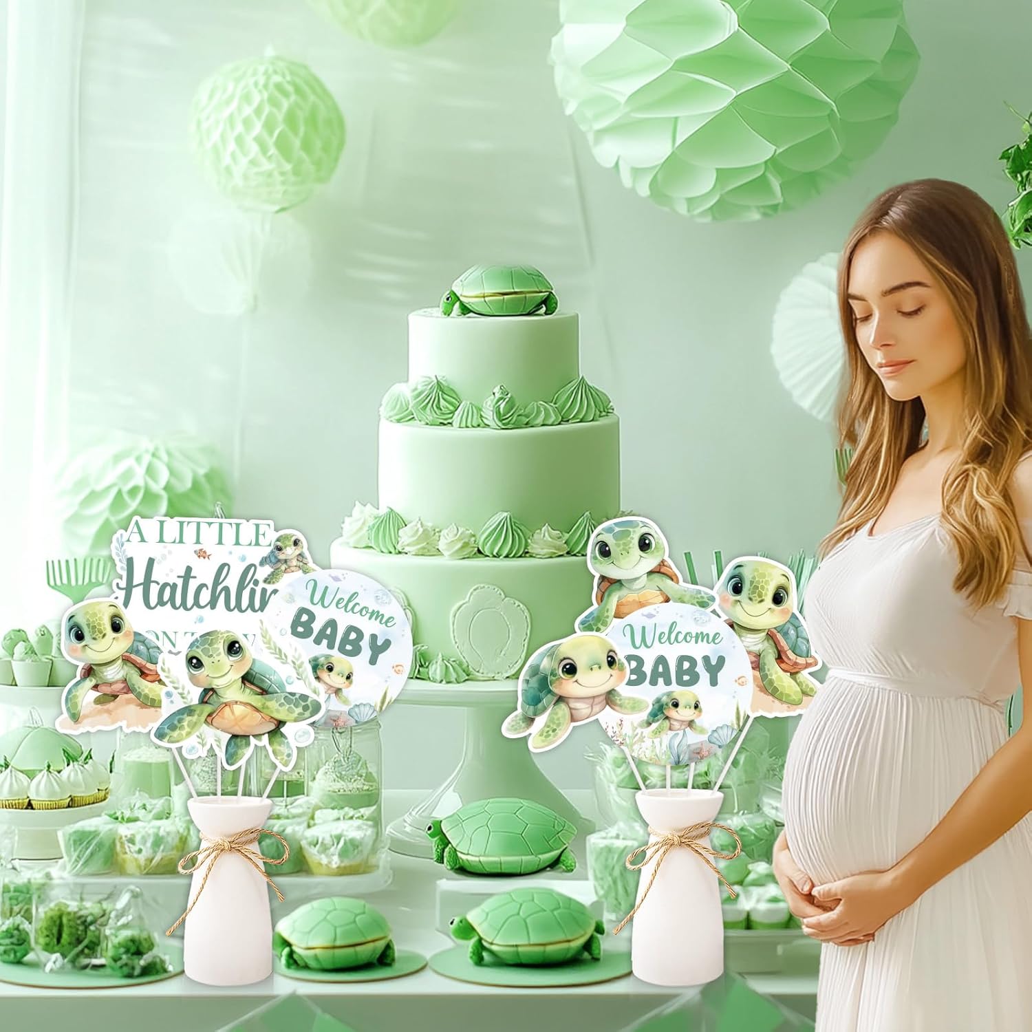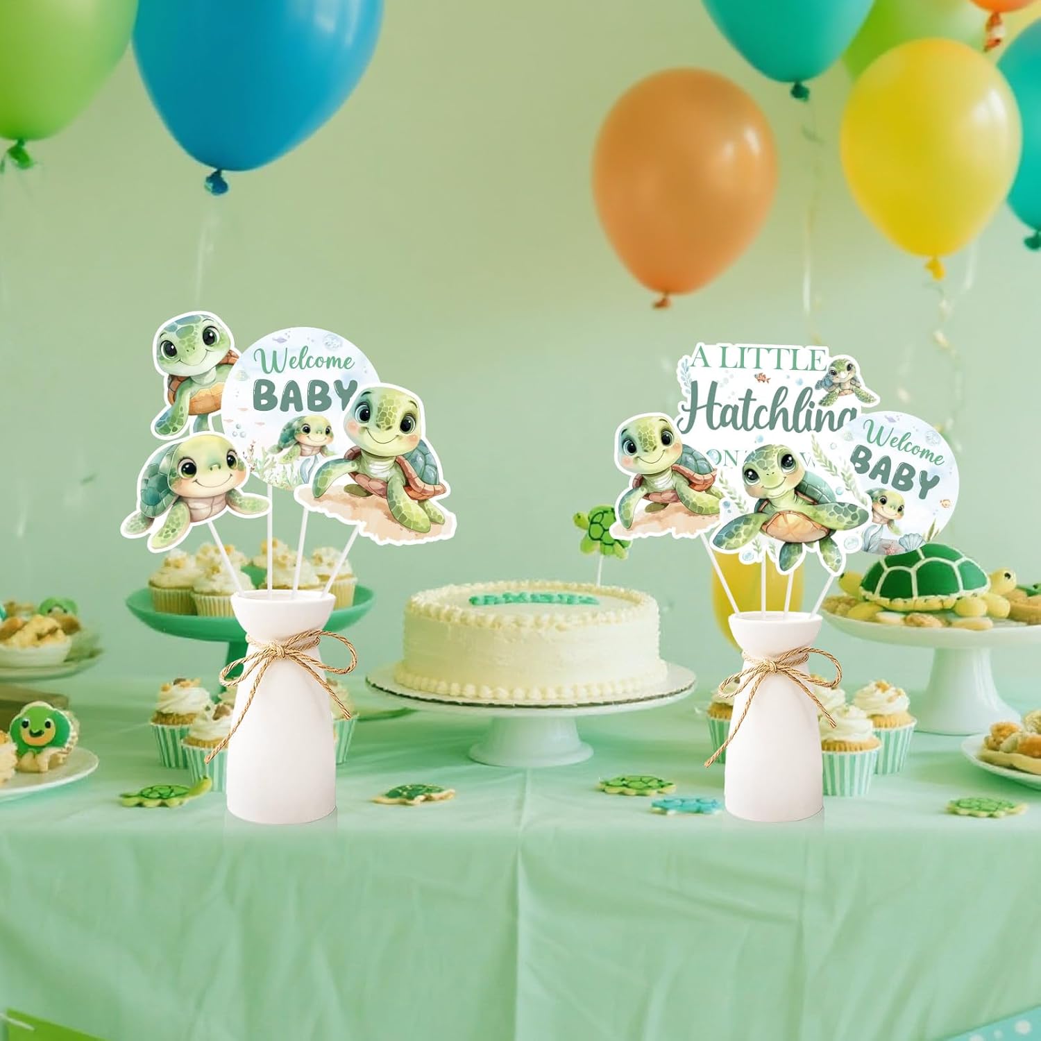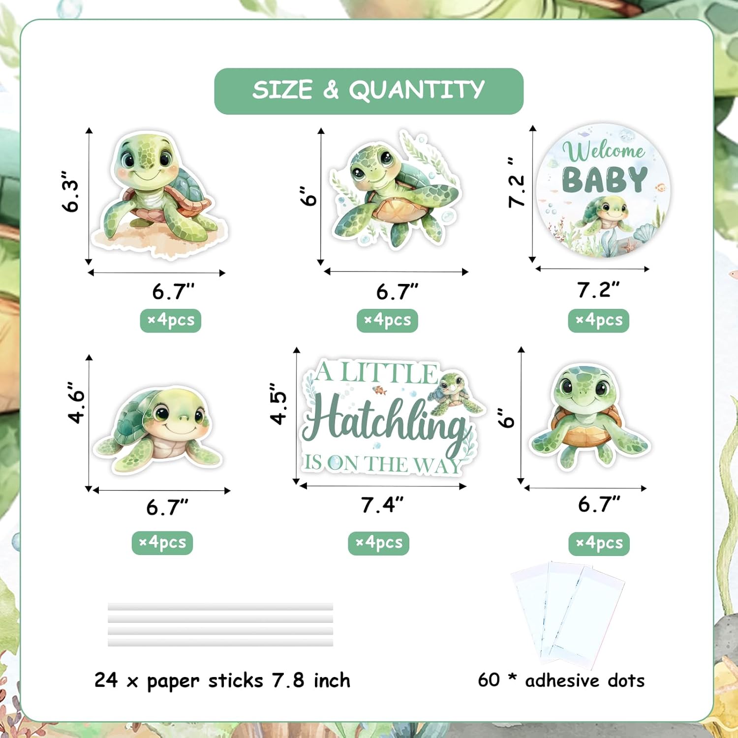 Centrotavola tartaruga: 24 bastoncini centrotavola a tema tartaruga in 6 forme. Lo squisito motivo a tartaruga li rende adatti per baby shower a tema tartaruga, festa di compleanno. Doppio lato: questo topper per tavolo a forma di tartaruga è stampato su entrambi i lati, quindi lo renderà molto comodo da usare. Usiamo materiale di alta qualità, quindi non sbiadiscono facilmente e sono molto ben realizzati, robusti. Design colorato a tartaruga marina: i bastoncini centrotavola a tema tartaruga marina includono 6 diversi motivi di tartaruga marina. I motivi squisiti e vivaci renderanno la tua festa più divertente e accattivante. A Little Hatching Is on The Way e le parole "Welcome Baby "li rendono anche più adatti per baby shower. Ampia applicazione: le nostre decorazioni da appendere a tema tartaruga sono adatte per baby shower, feste di compleanno, feste a tema tartaruga e feste a tema subacqueo. Facile da montare: basta selezionare i centrotavola e poi incollarli ai bastoncini di carta. Allora otterrai una decorazione perfetta.