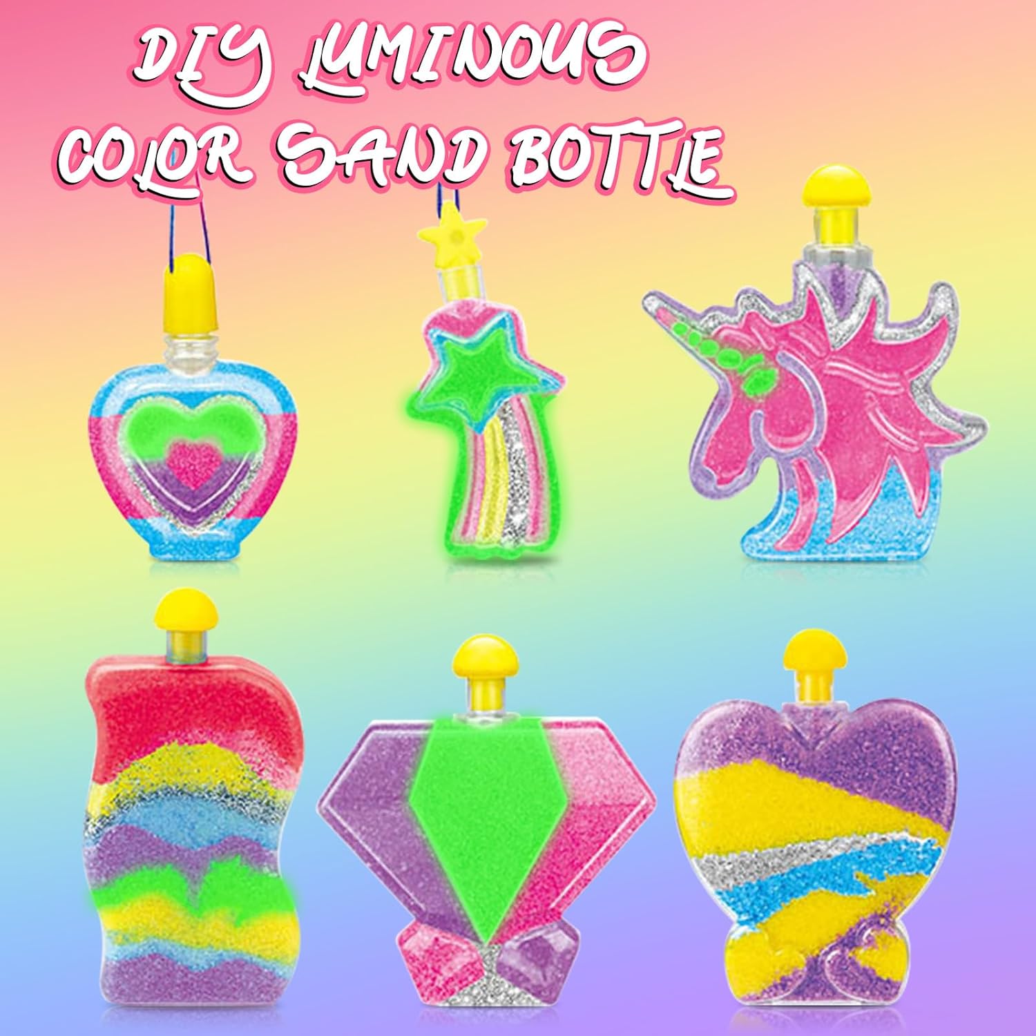 LA CONFEZIONE CONTIENE: 6 bottigliette con coperchio, 6 colori di sabbia colorata, 1 imbuto + bastoncino per modellare, spago colorato. FACILE DA USARE: usare l'imbuto per versare la sabbia nella bottiglia, usare il bastoncino per modellare per controllare la disposizione spaziale della sabbia colorata, usare diversi colori di sabbia colorata per impilarla lentamente. ATTIVARE LA SABBIA COLORATA: è necessario posizionare la sabbia incandescente al buio sotto una luce intensa per oltre 45 minuti, quindi posizionare la bottiglia in un luogo completamente buio; dopo che il bagliore si è attenuato nell'oscurità, è possibile attivarla di nuovo. FANTASIA: è possibile creare la propria bottiglia di sabbia colorata in base alle proprie preferenze. COLTIVITÀ: il kit di luce notturna di sabbia colorata fai da te può coltivare le capacità visive dei bambini, illuminare il loro talento artistico e stimolare la loro creatività.