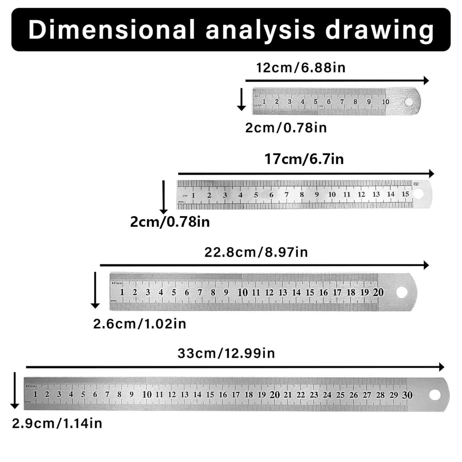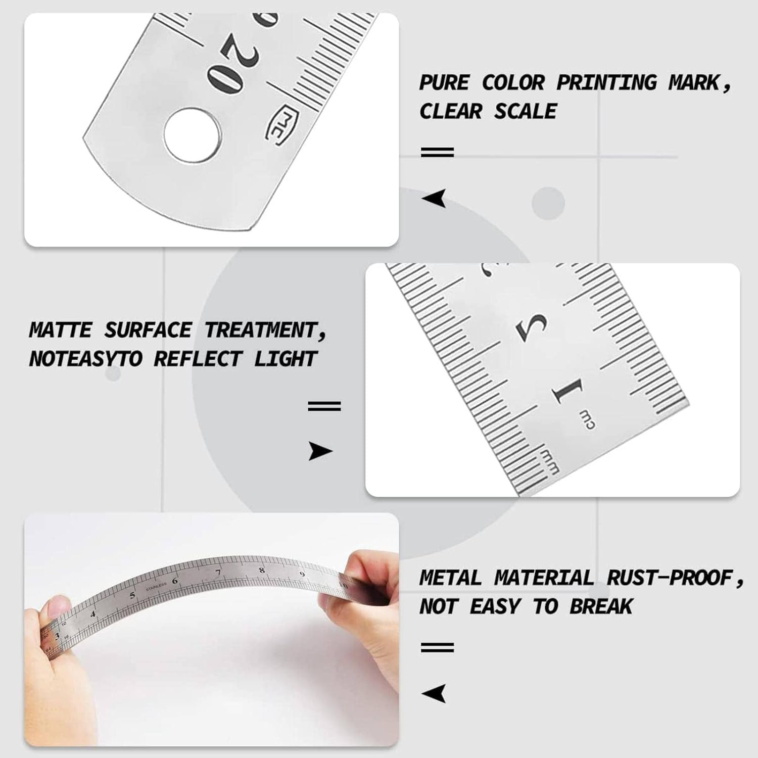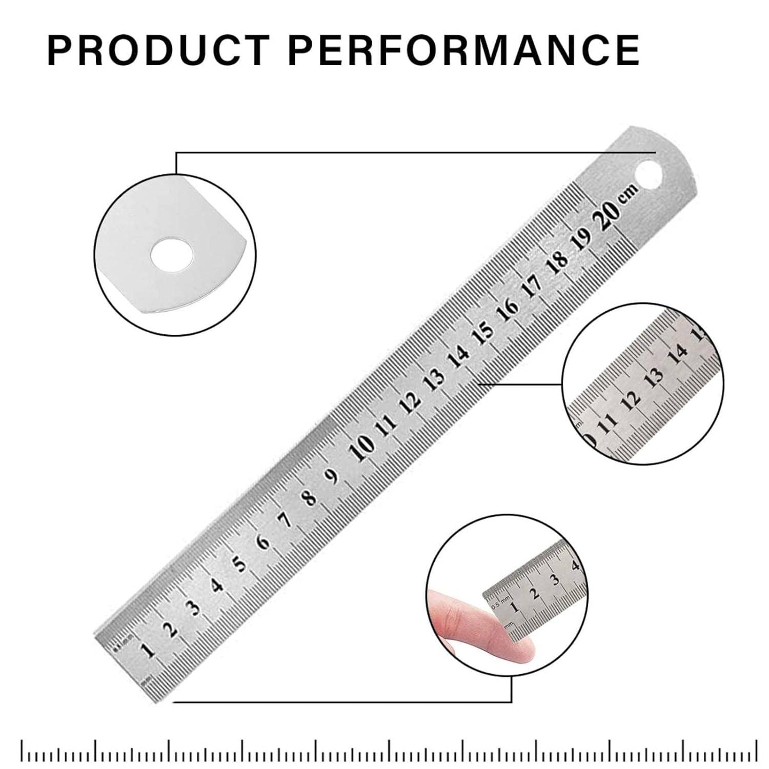 Esistono 4 tipi di righelli con 4 dimensioni. Le dimensioni più comuni di 10, 15, 20, 30 cm (4, 6, 8, 12 pollici) soddisfano quasi tutte le esigenze. Realizzato in acciaio inossidabile di alta qualità, resistente e non facile da danneggiare. Il righello ha due metriche su entrambi i lati: imperiale e metrica, in modo da poter misurare gli oggetti più comodamente. I dati di misurazione di questo righello sono precisi È sufficiente posizionare il righello sull'oggetto da misurare. È facile e conveniente e i dati sono accurati. È possibile utilizzare un'ampia gamma di applicazioni per l'apprendimento e il lavoro, un ottimo strumento per scuole, uffici e case.